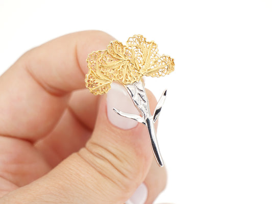 Carnation Commemorative Pin, Portuguese Filigree, 925 Sterling Silver and Gold Bath