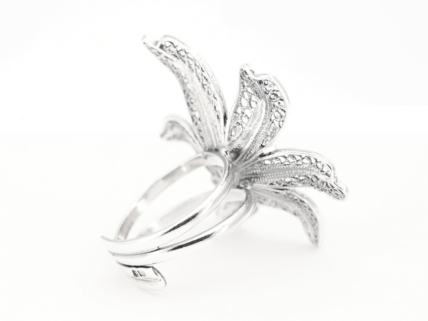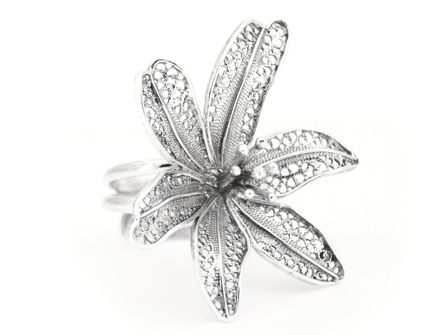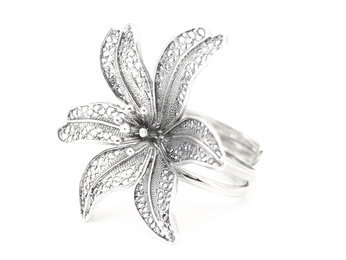 Elegant Wider Flower Ring, adjustable size, in Portuguese Filigree, crafted in Portugal in 925 Sterling Silver.