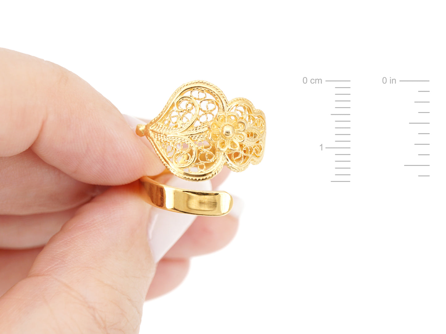 Small Viana Heart Adjustable Ring, Portuguese Filigree, Golden 925 Sterling Silver
