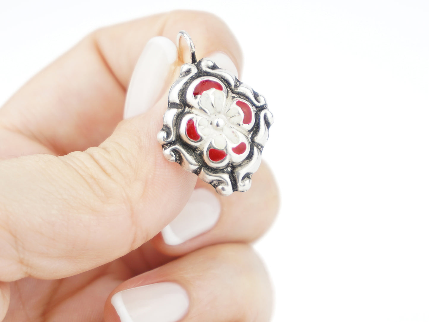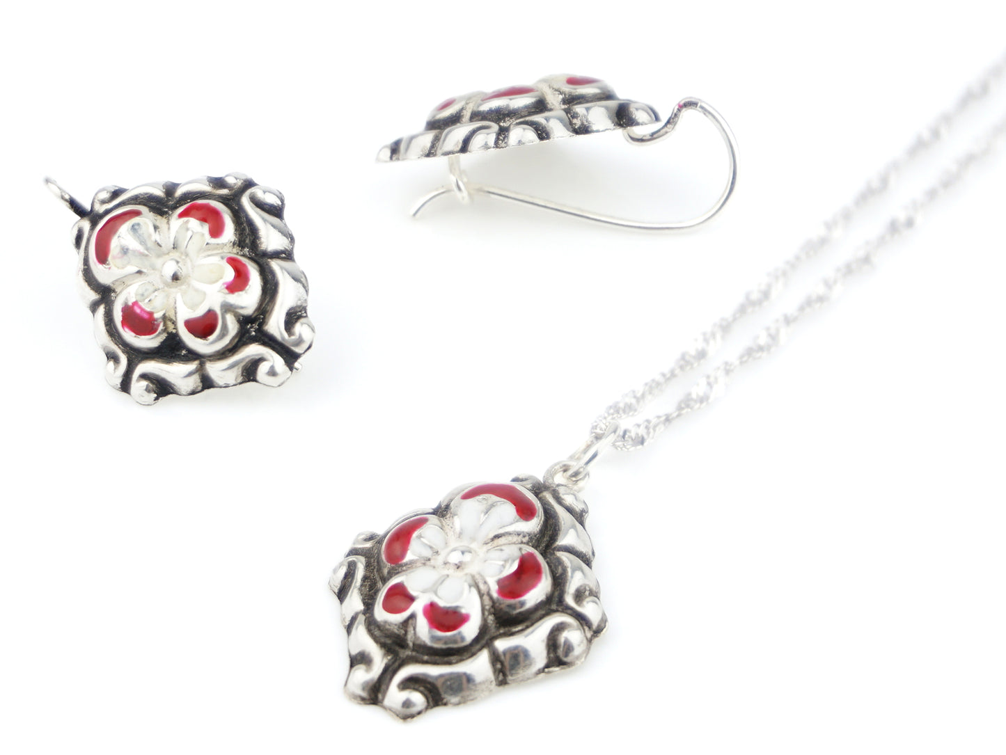 Elegant Baroque Red and White Flower SET of hook Earrings, and Necklace with adjustable Twisted chain. Hollow single-sided, handcrafted in Portugal by talented artisans, in 925 Sterling Silver with "Patina" and Enamel finishing.