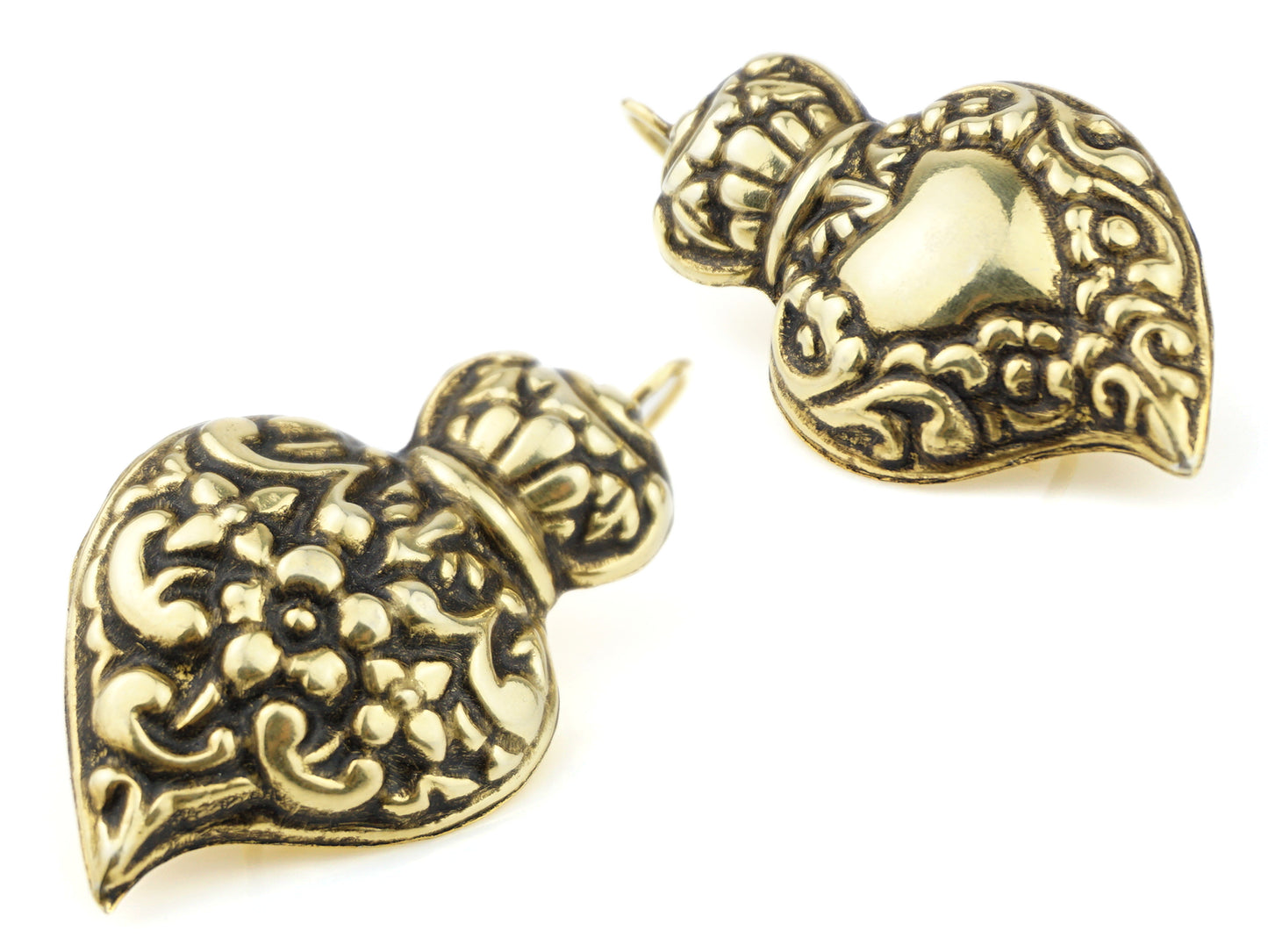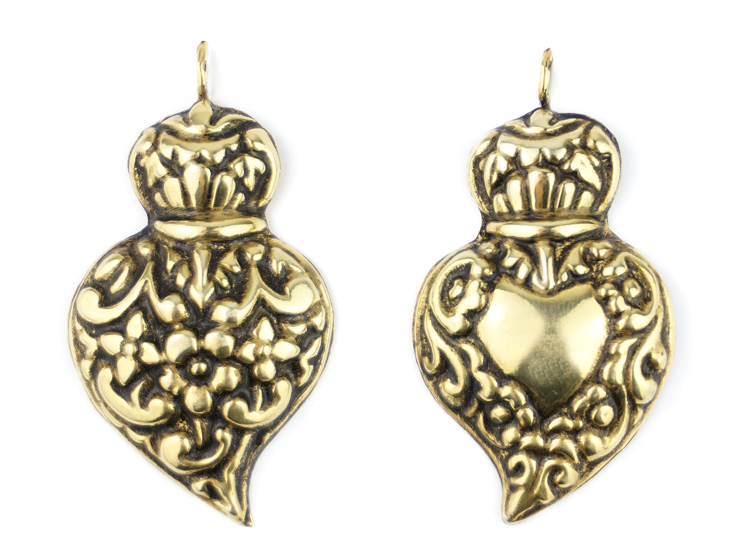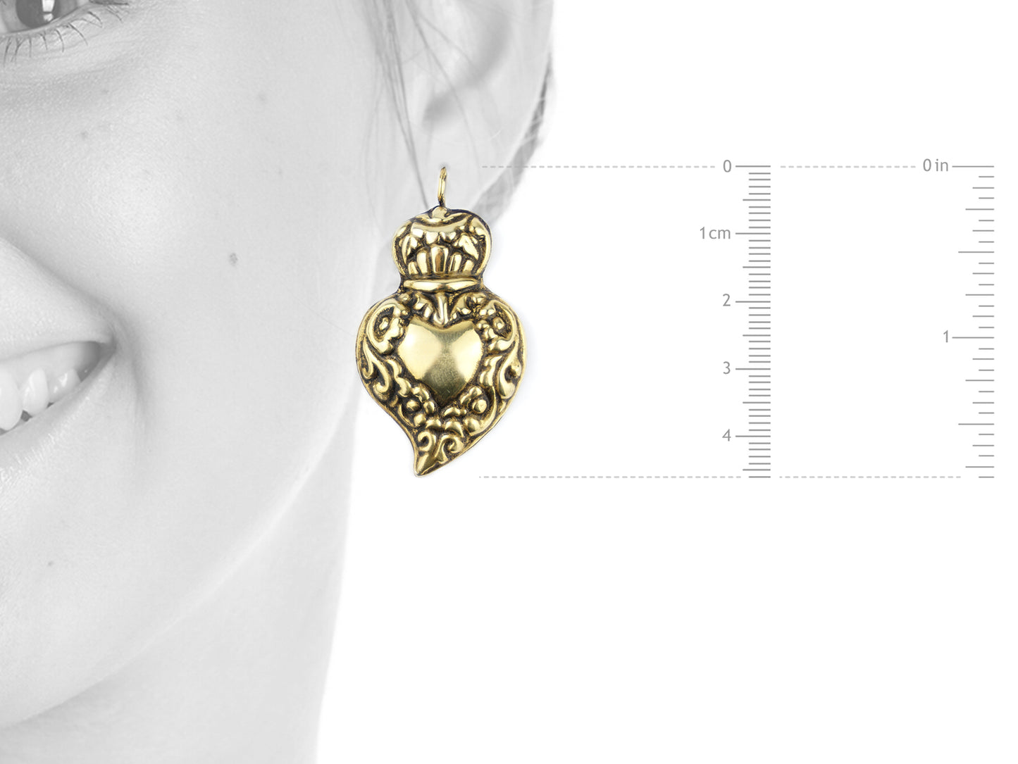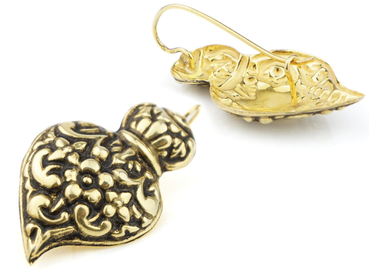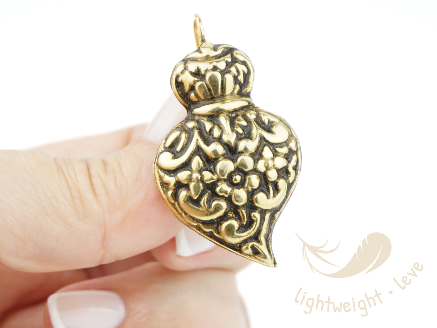 Elegant Baroque "Large Viana Heart" SET of hook Earrings, and Necklace with Pendant. The Earrings are hollow single-sided, and the Pendant is hollow double-sided. Handcrafted in Portugal by talented artisans, in Golden 925 Sterling Silver with "Patina" finishing.