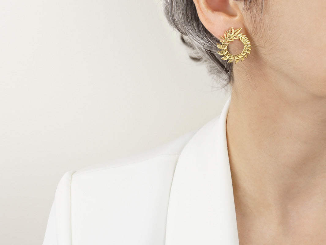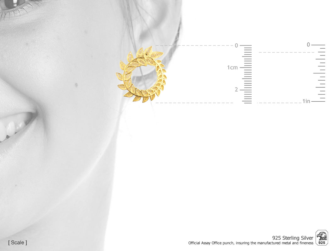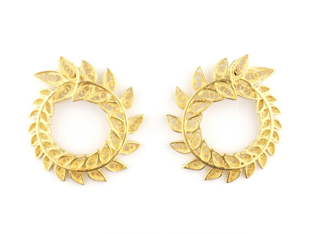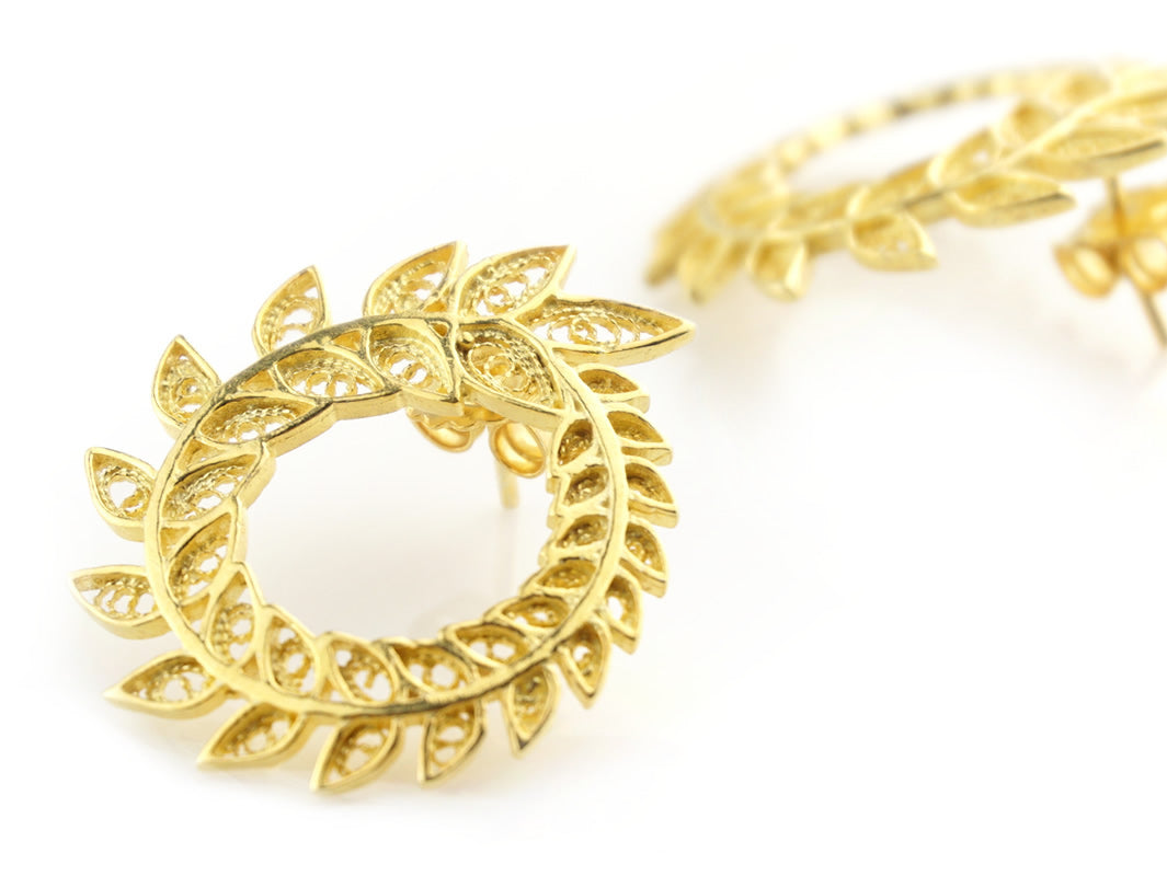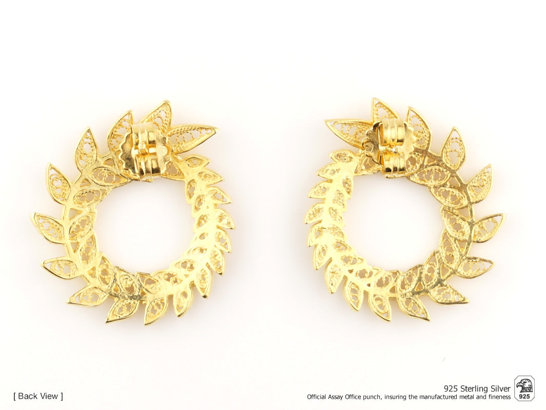 Elegant medium-sized Leaf Wreath pushback Earrings. Portuguese Filigree, crafted in Portugal in Golden 925 Sterling Silver.