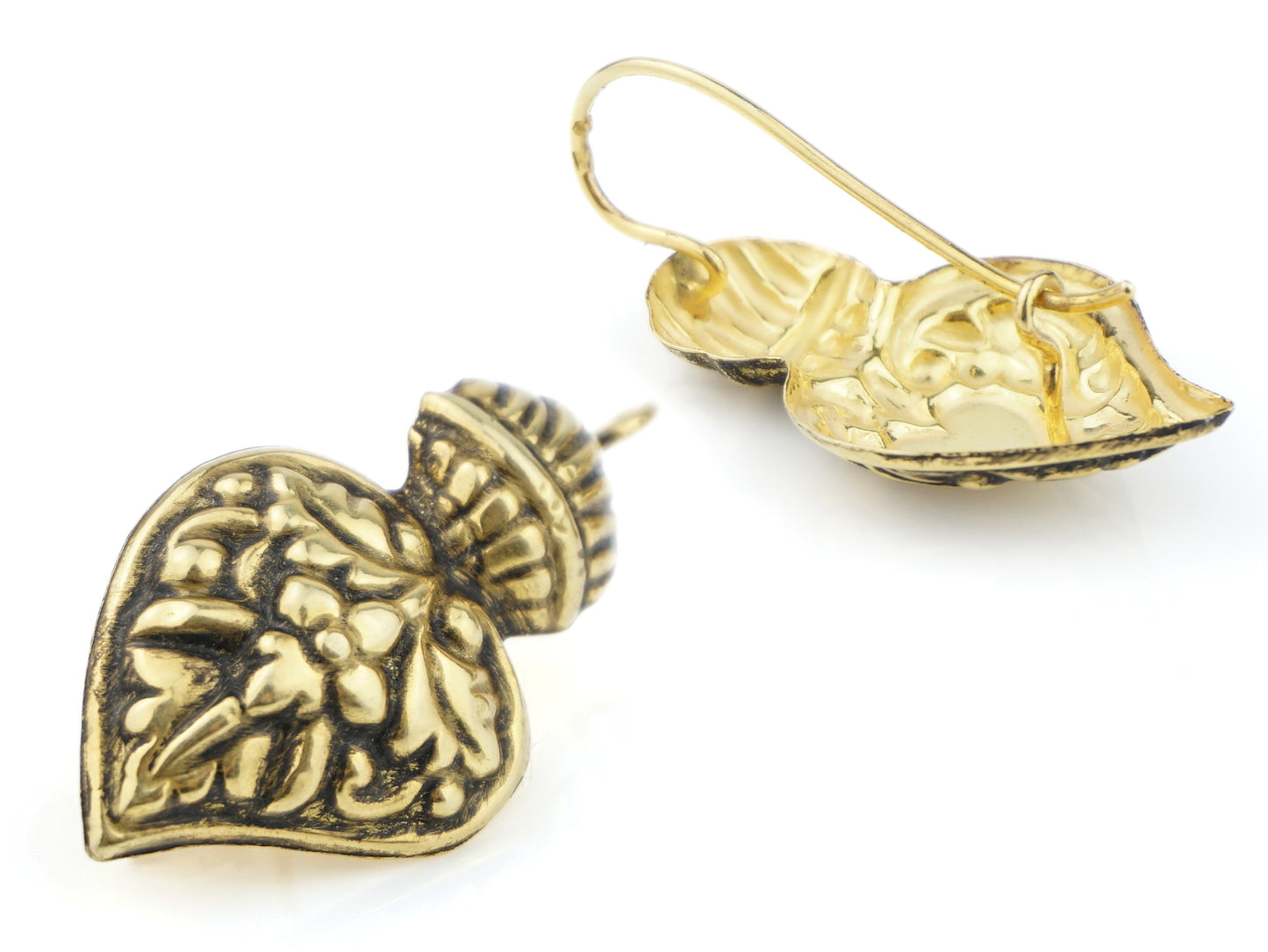 Elegant Baroque Medium-sized Viana Heart hook Earrings. One-sided hollow earrings, handcrafted in Portugal by talented artisans, in Golden 925 Sterling Silver, with "patina" finishing.