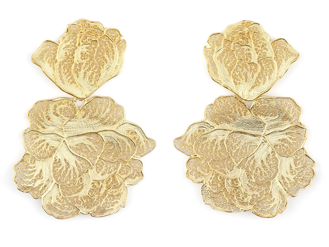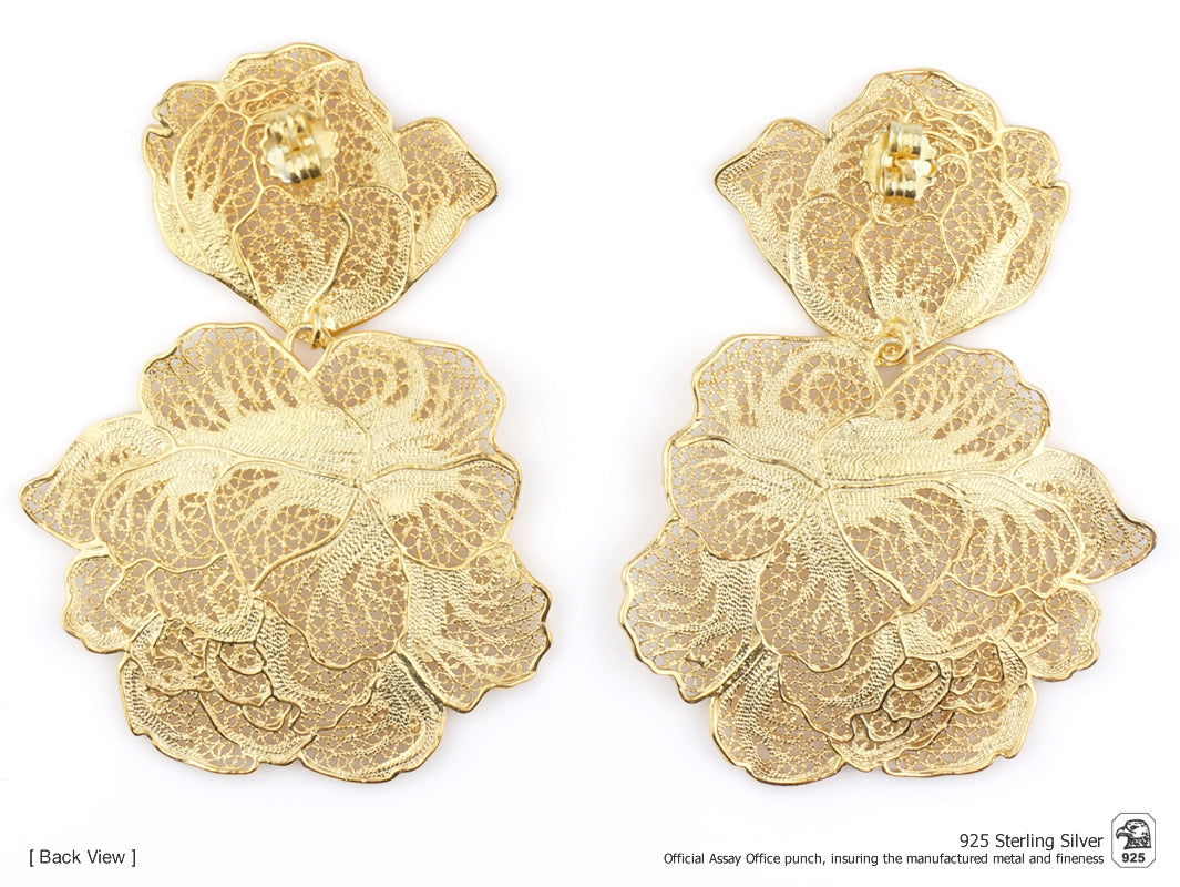Elegant extra large Natura pushback earrings. Portuguese Filigree, crafted in Portugal in Golden 925 Sterling Silver.