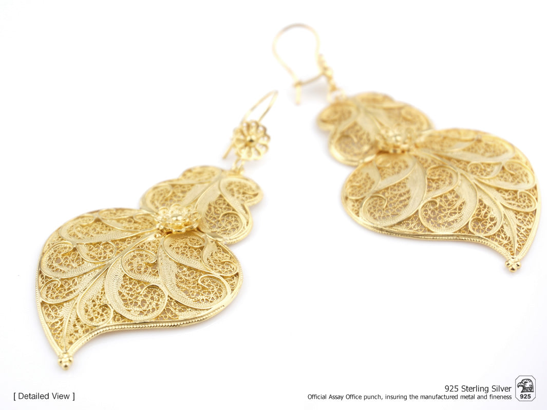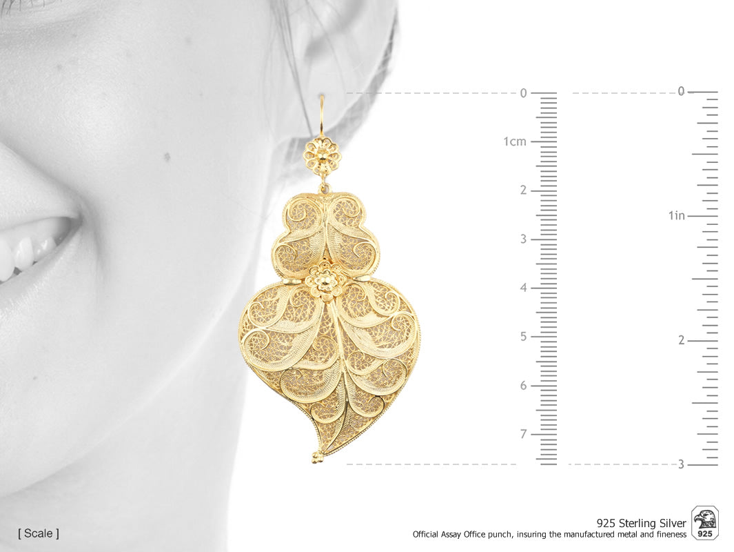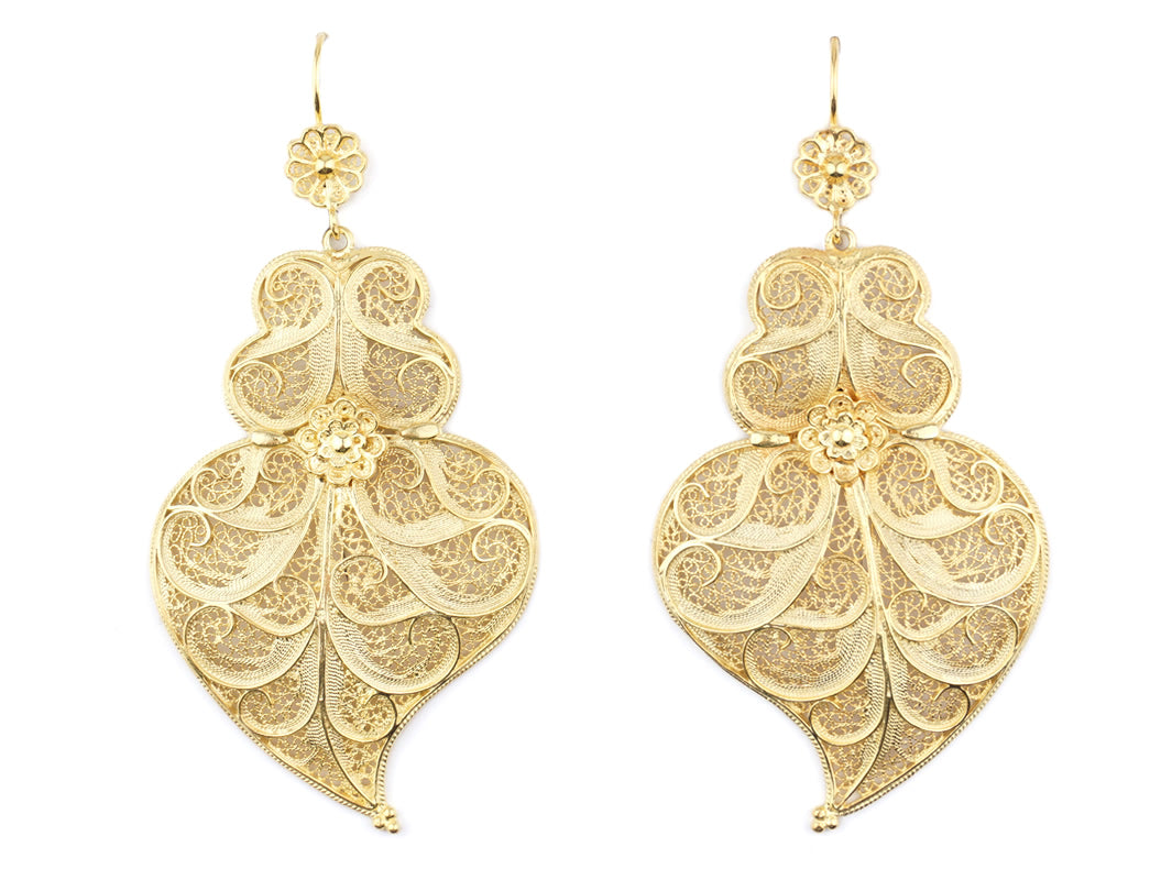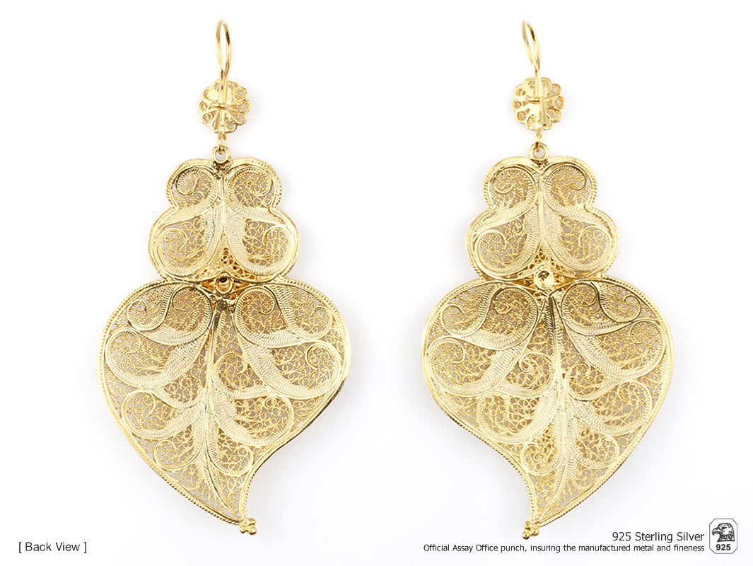 Viana Heart Earrings XL Size, Portuguese Filigree, Golden 925 Sterling Silver