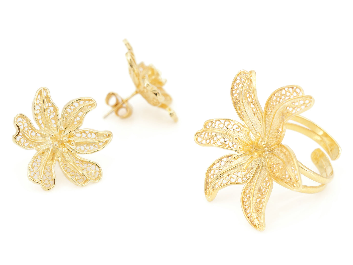 Elegant "Wide Flower" SET of pushback Earrings and adjustable Ring. Portuguese Filigree, crafted in Portugal in Golden 925 Sterling Silver.