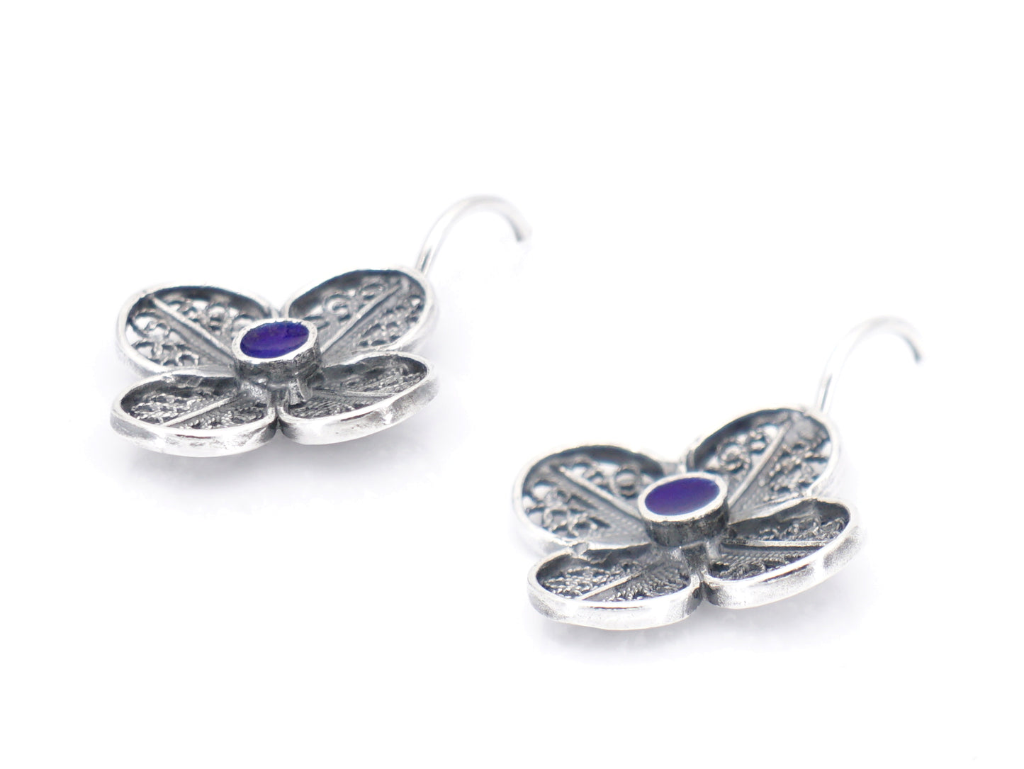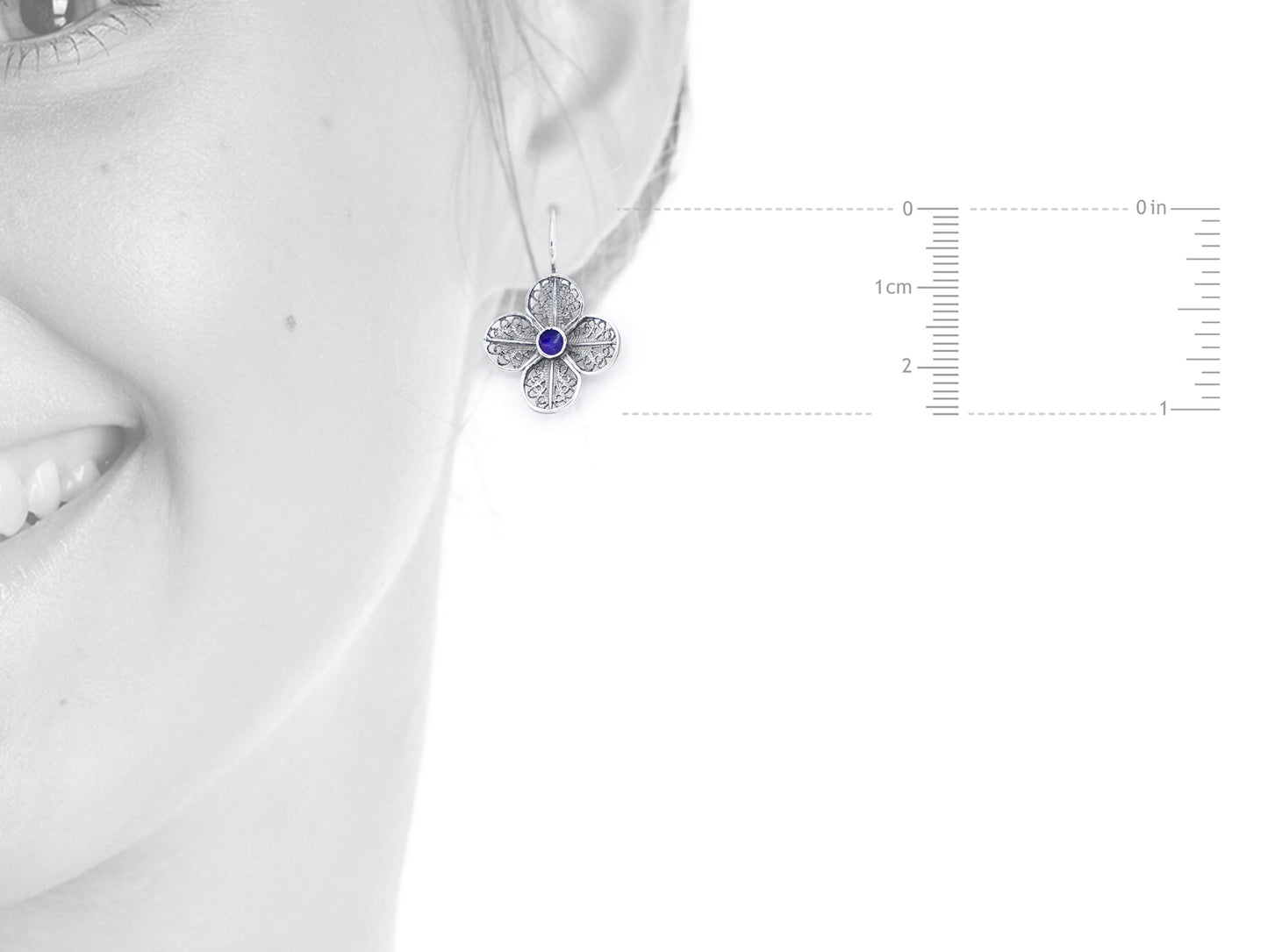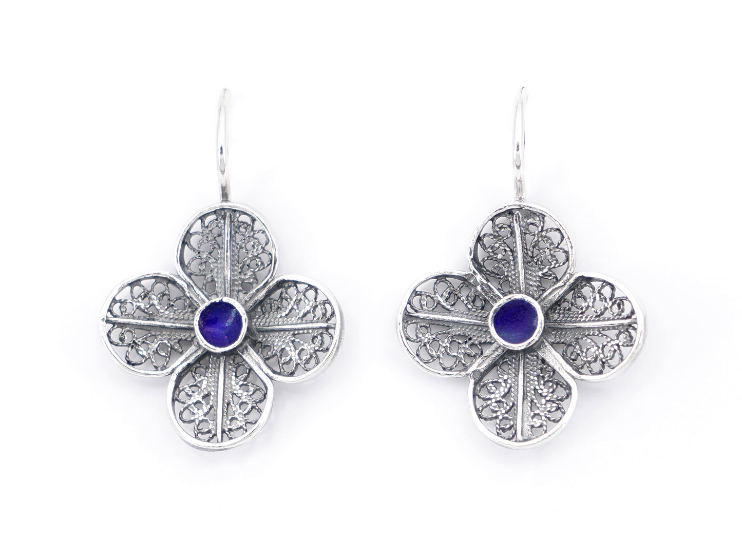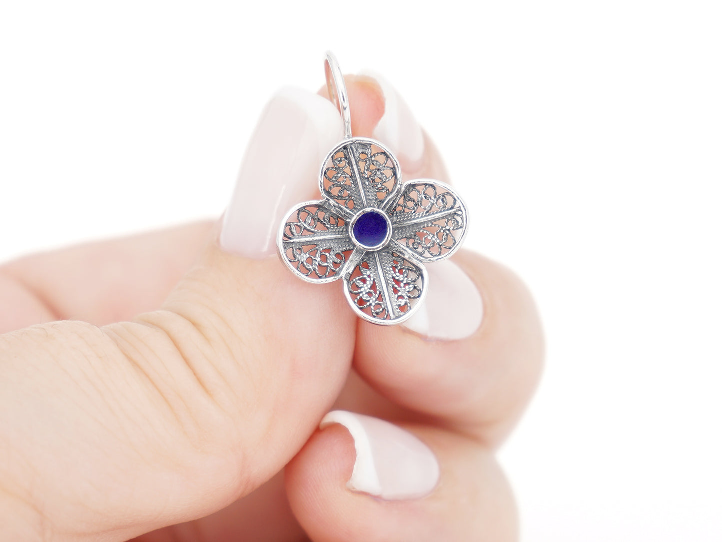 Elegant Small Flower hook Earrings with Blue Enamel Center. Portuguese Filigree, crafted in Portugal in 925 Sterling Silver.