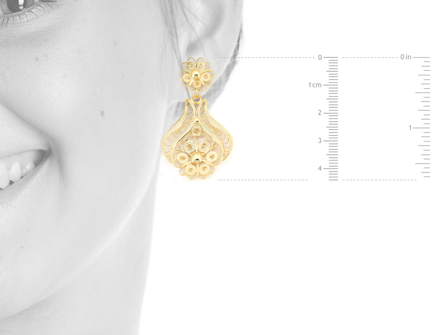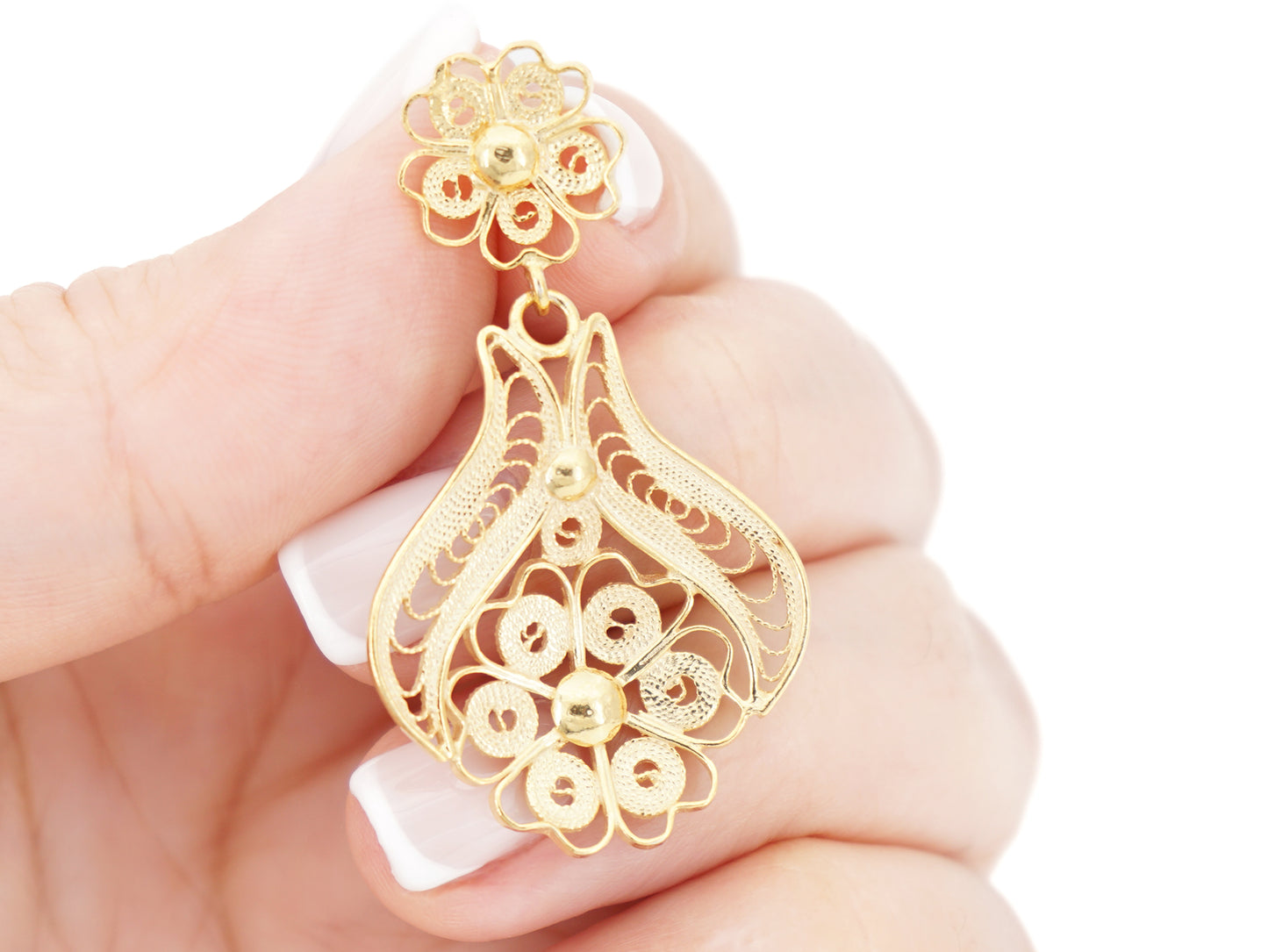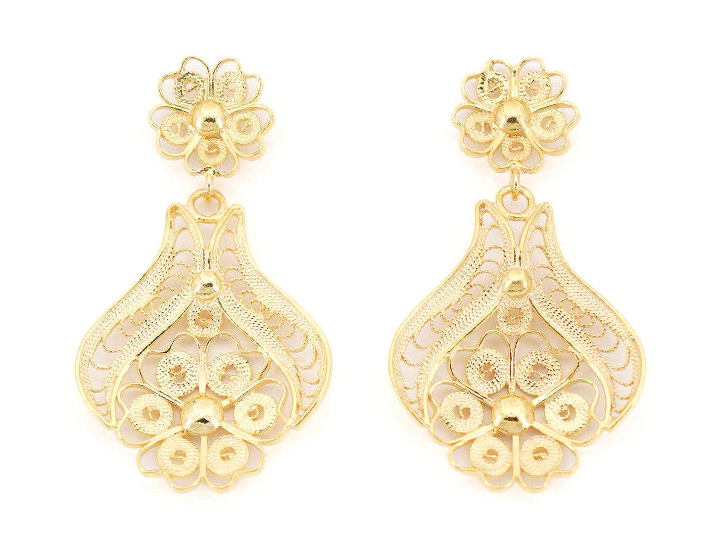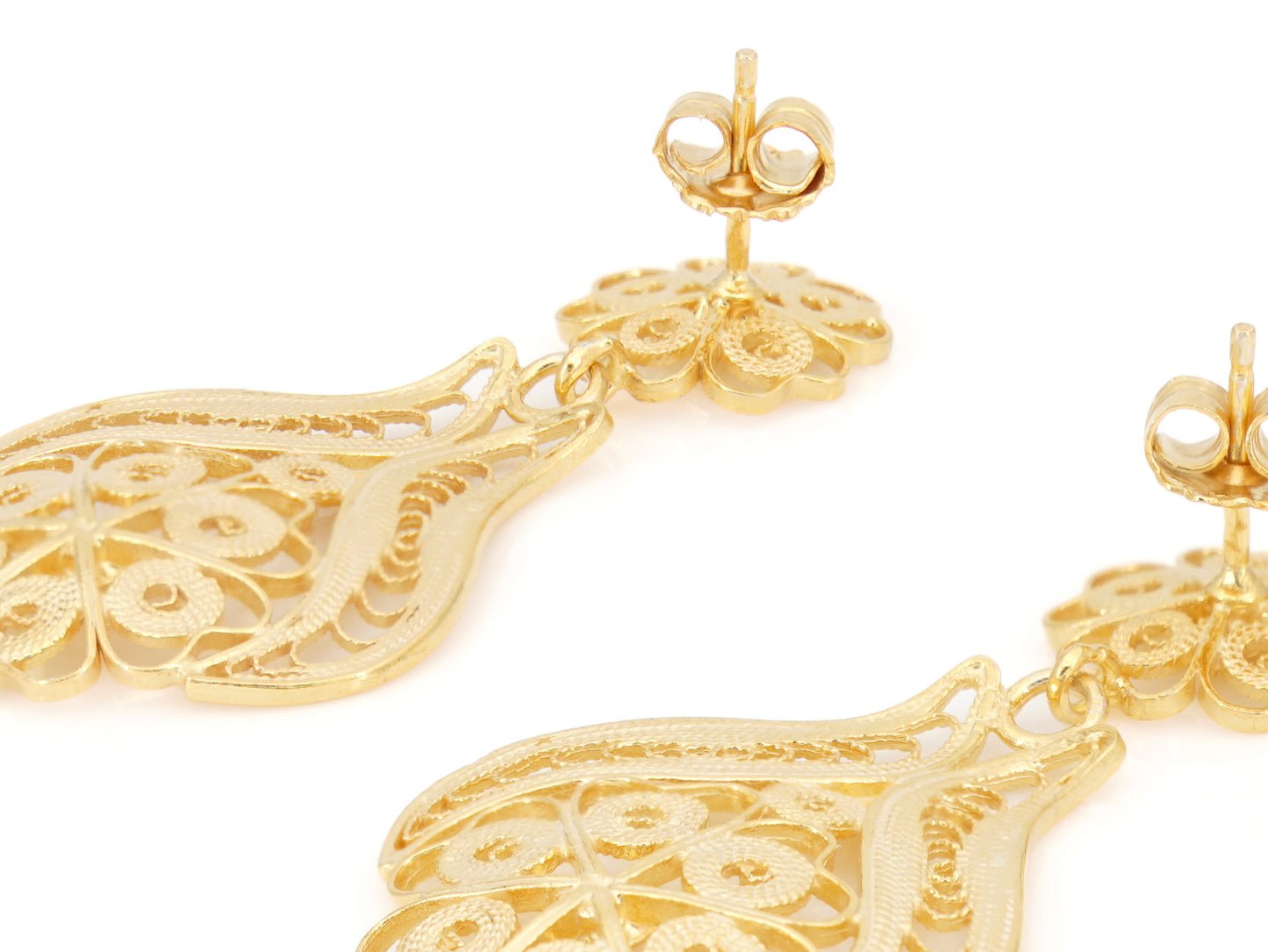 Elegant Rounded Antique Style pushback Earrings. Portuguese Filigree, crafted in Portugal in Golden 925 Sterling Silver.