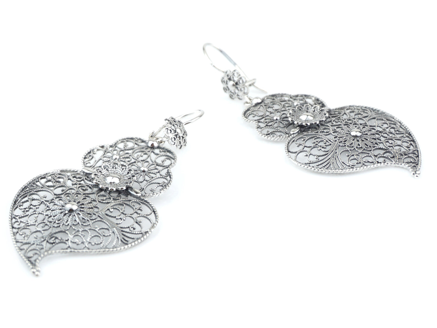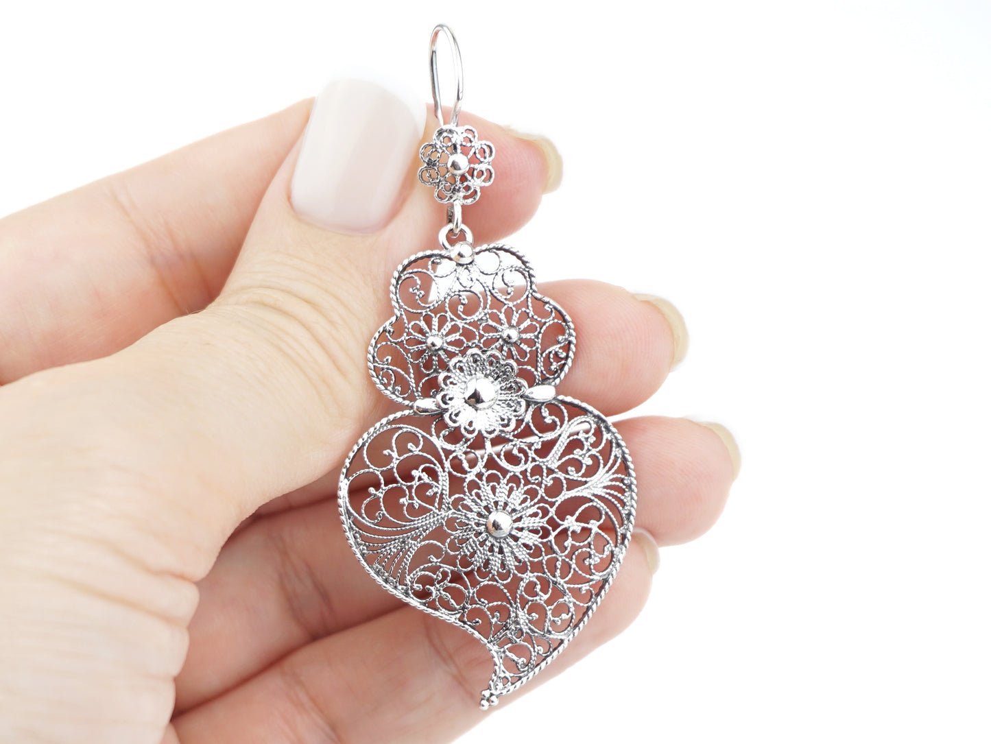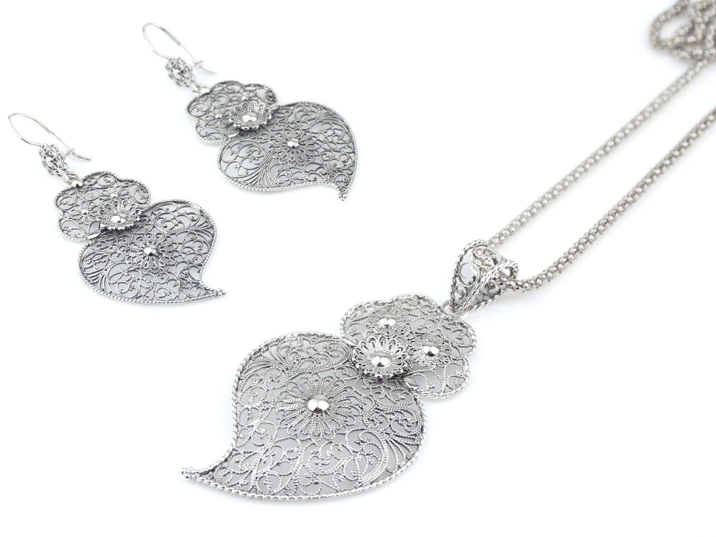 Large Fidalga Earrings and Lace Heart Necklace Set, Portuguese Filigree, 925 Sterling Silver