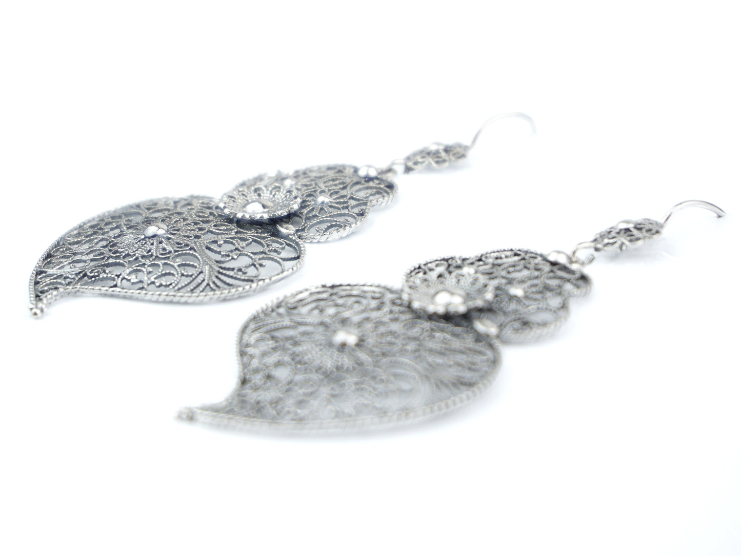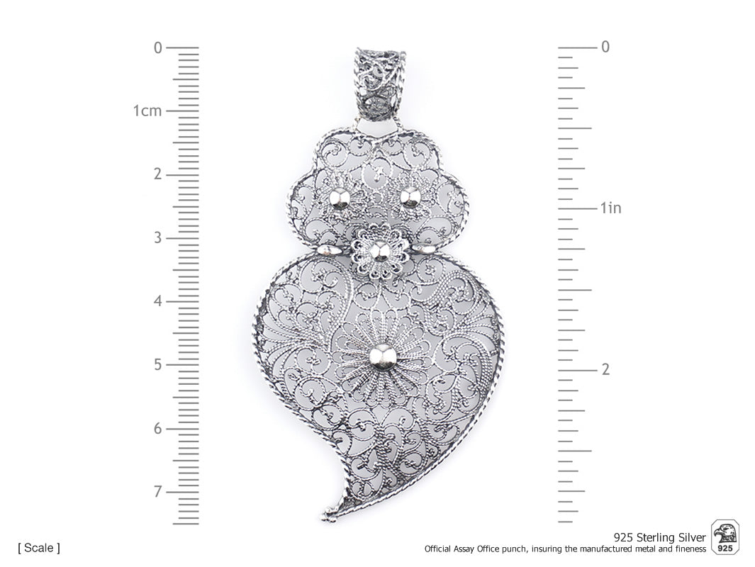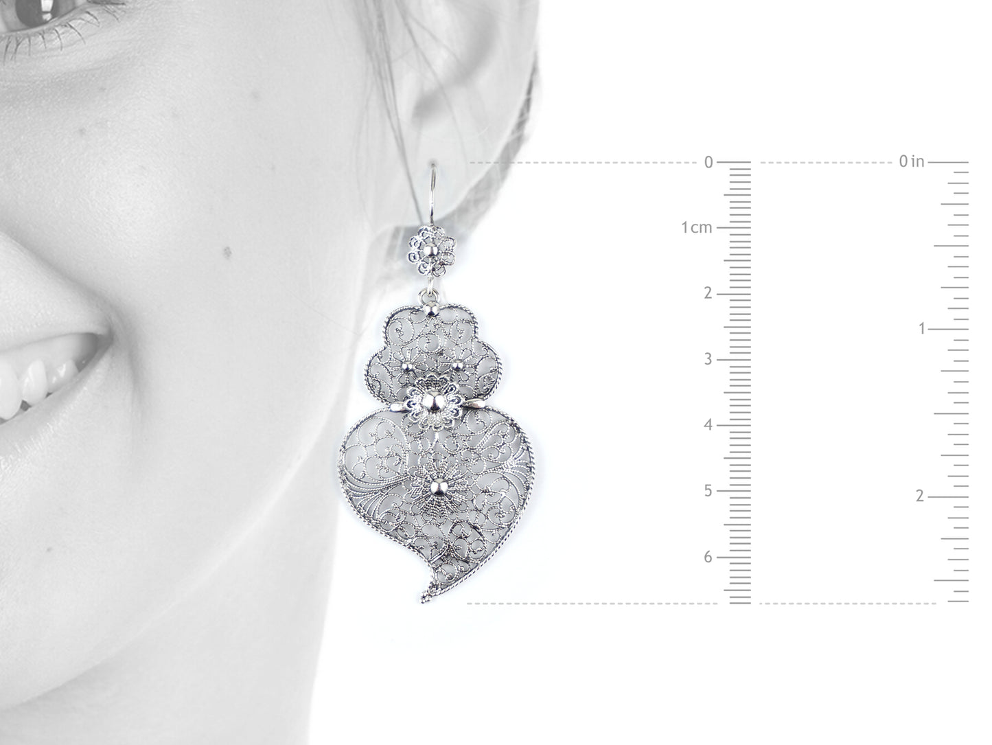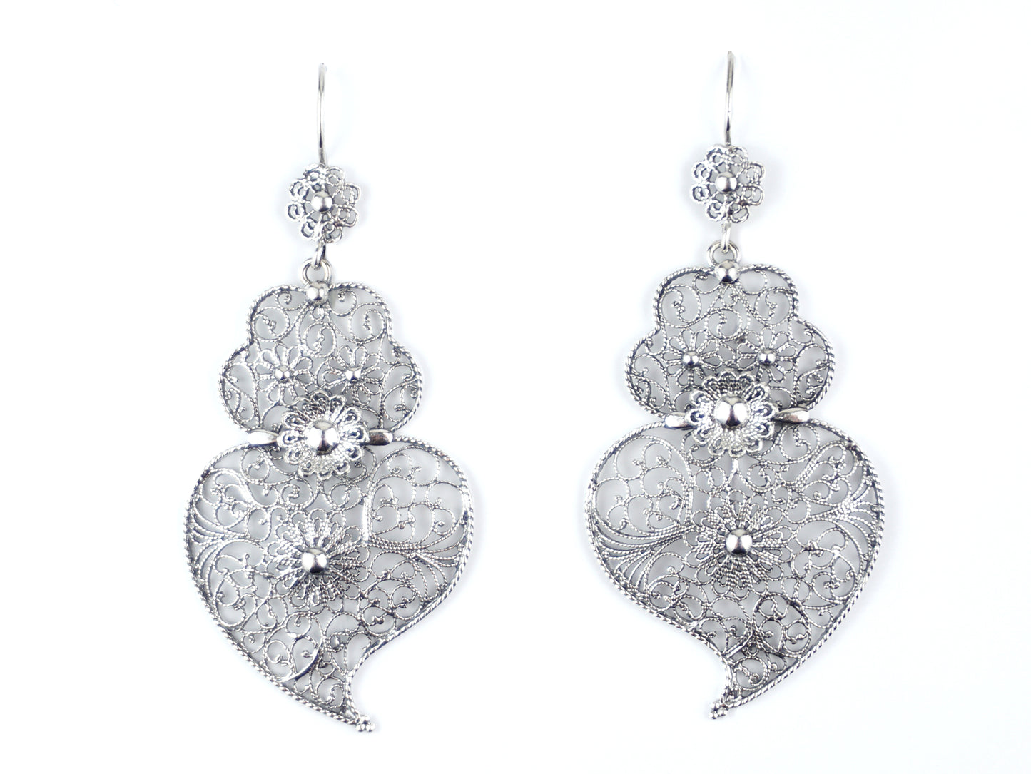 Large Fidalga Earrings and Lace Heart Necklace Set, Portuguese Filigree, 925 Sterling Silver