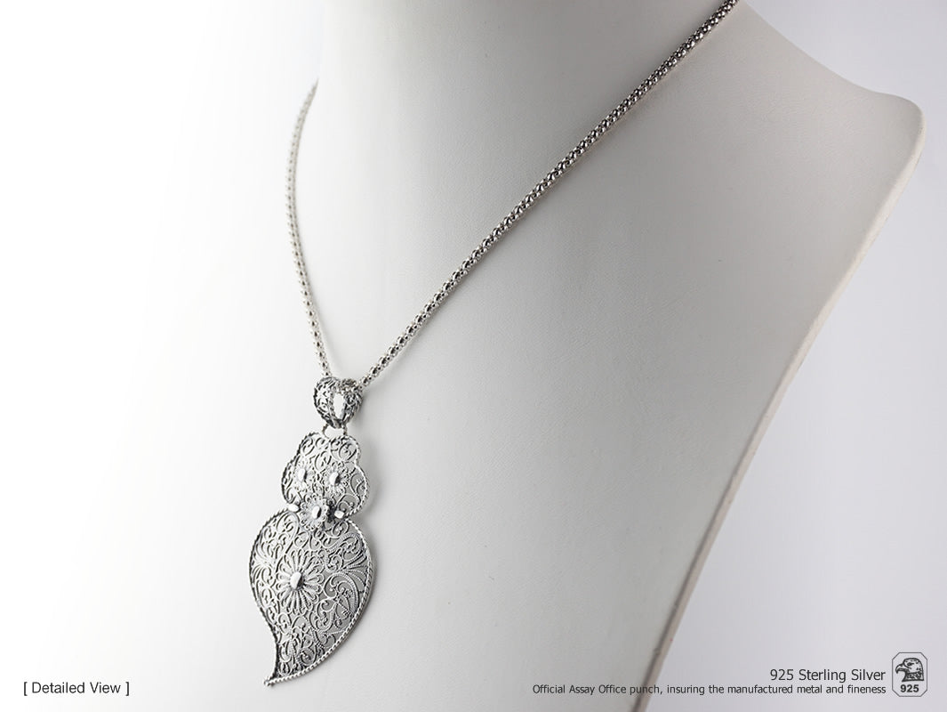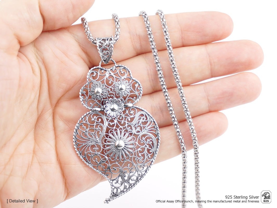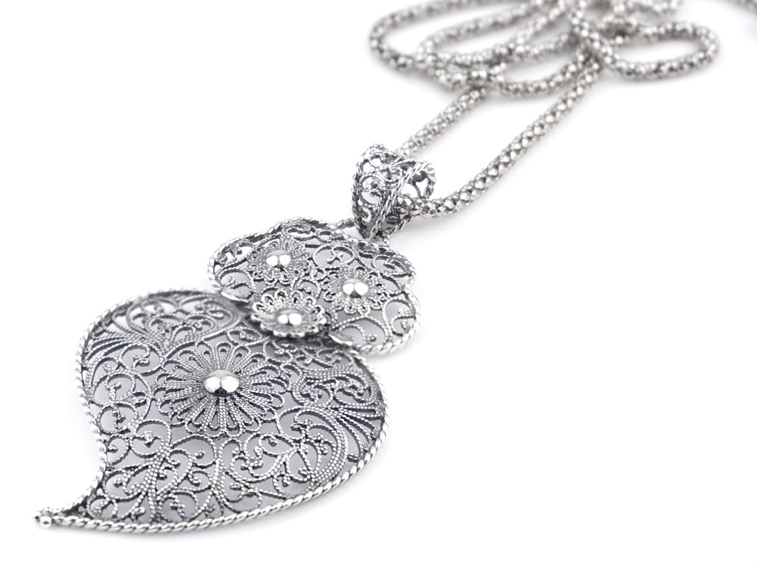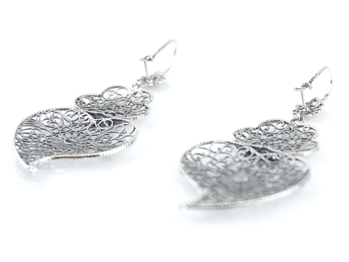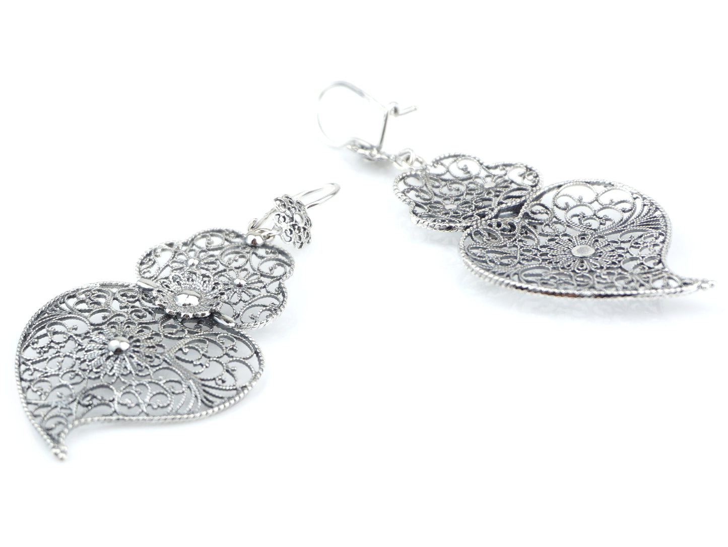 Elegant set consisting of large-sized Fidalga Heart hook Earrings and Necklace with large Lace Heart. Portuguese Filigree, crafted in Portugal in 925 Sterling Silver.