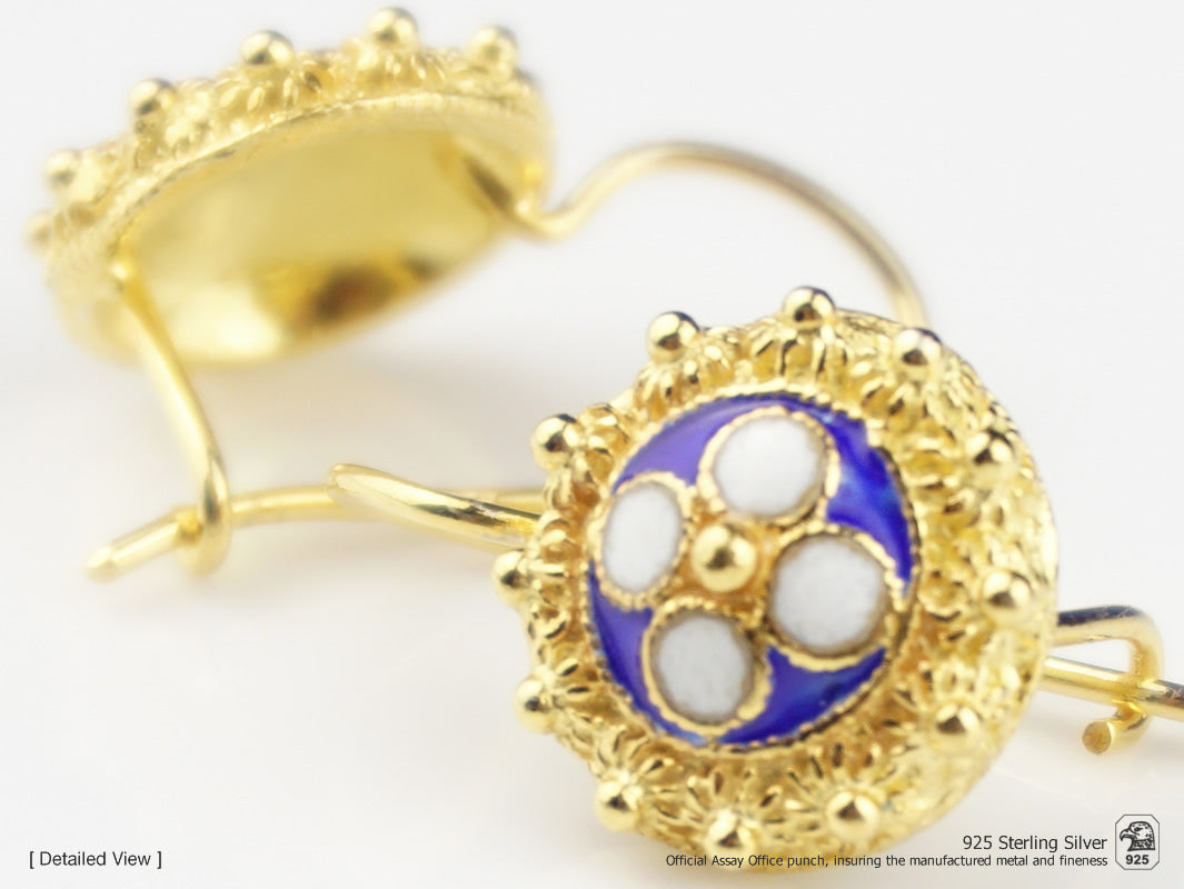 Elegant Classic Caramujo hook Earrings with Blue and White Enamel. Portuguese Filigree, crafted in Portugal in Golden 925 Sterling Silver.