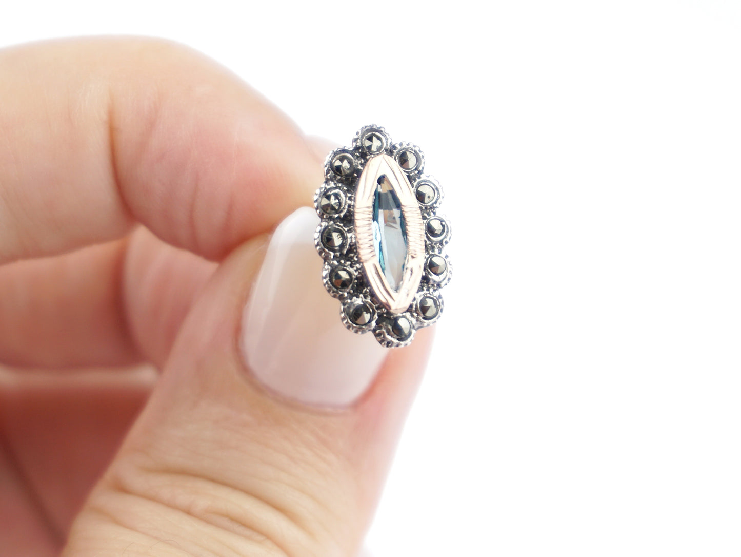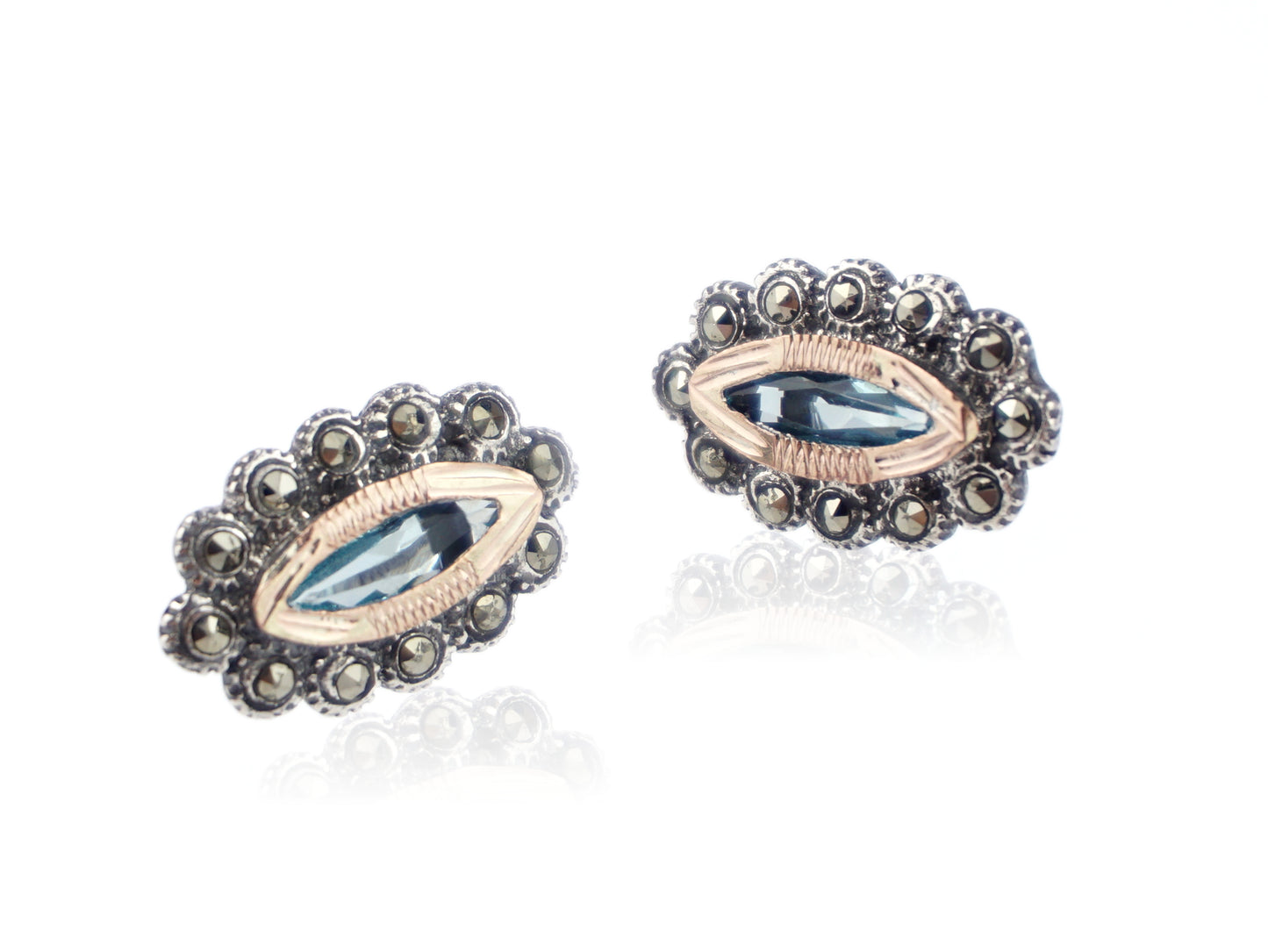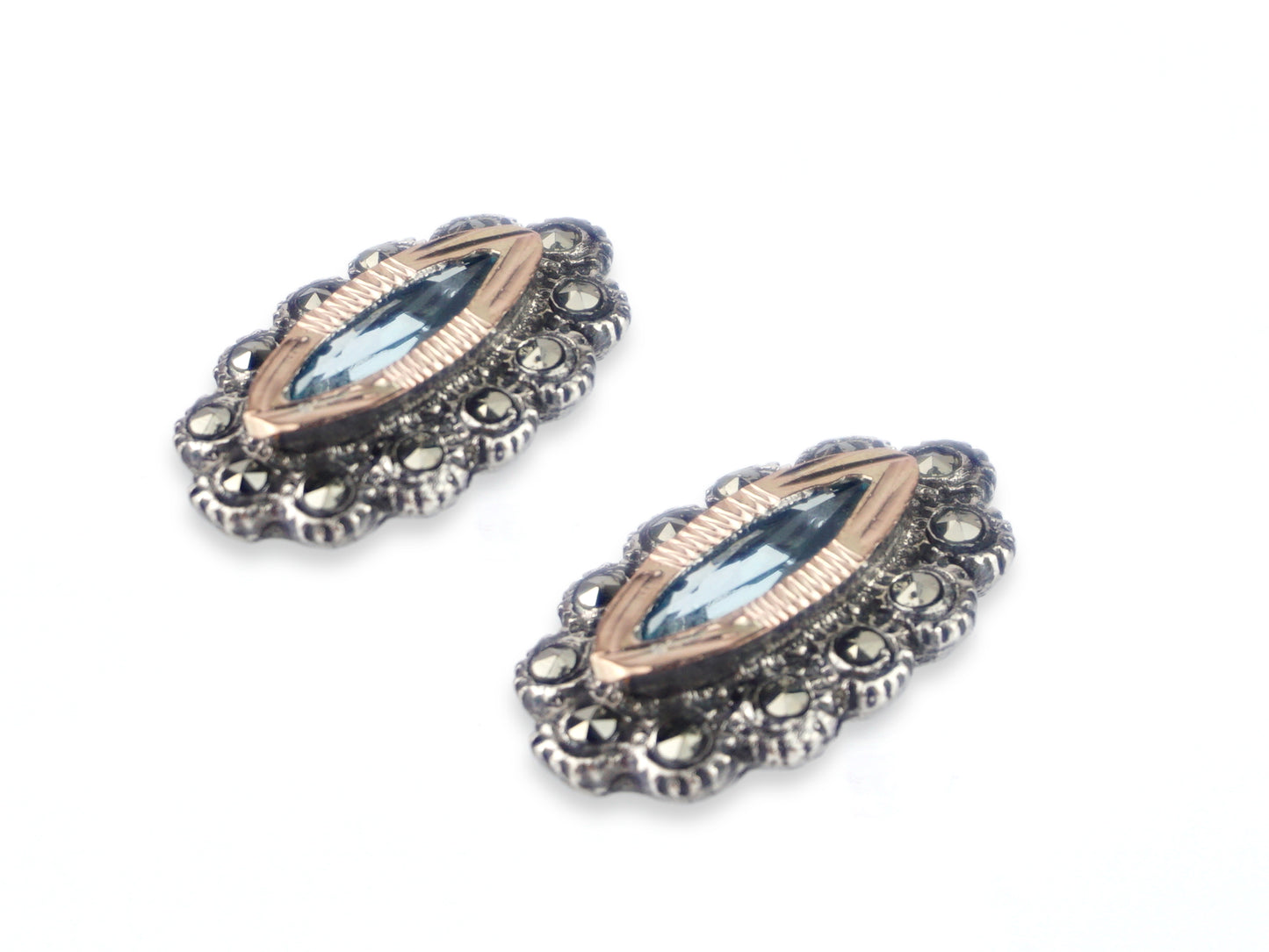 Navette Marcasites Earrings with Aqua-Blue Stone, 925 Sterling Silver and 9k Gold