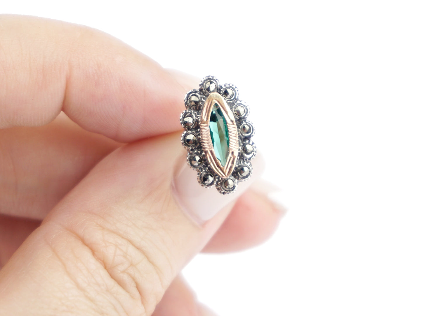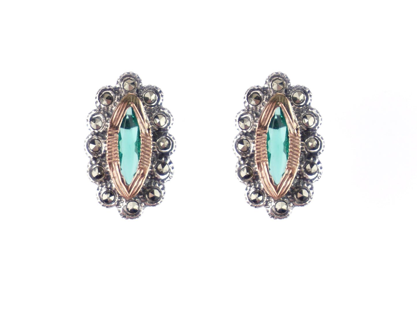 Navette Marcasites Earrings with Pale Green Stone, 925 Sterling Silver and 9k Gold