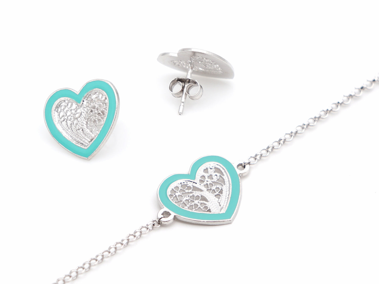 Elegant Hearts SET with Turquoise Enamel, of pushback Earrings and Bracelet. Portuguese Filigree, crafted in Portugal in Rhodium-finished 925 Sterling Silver.