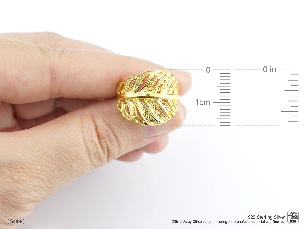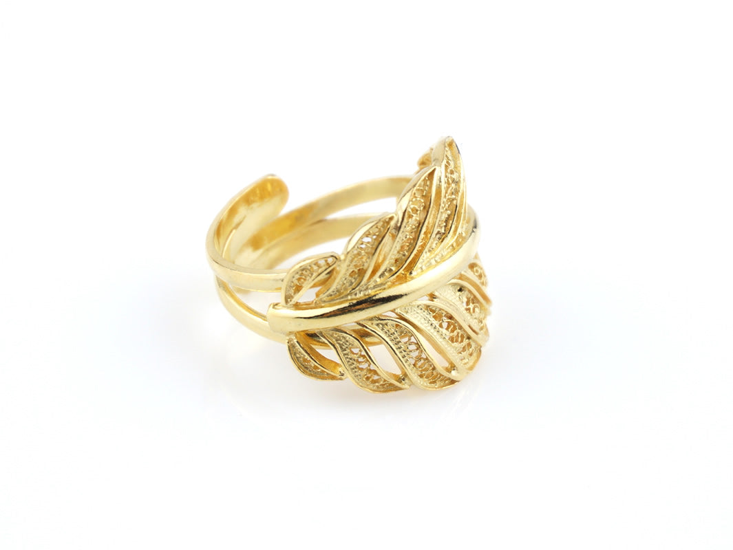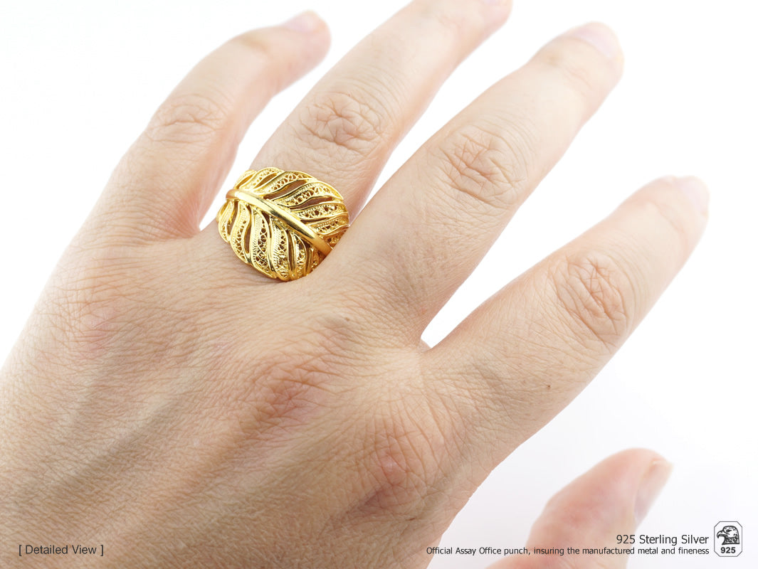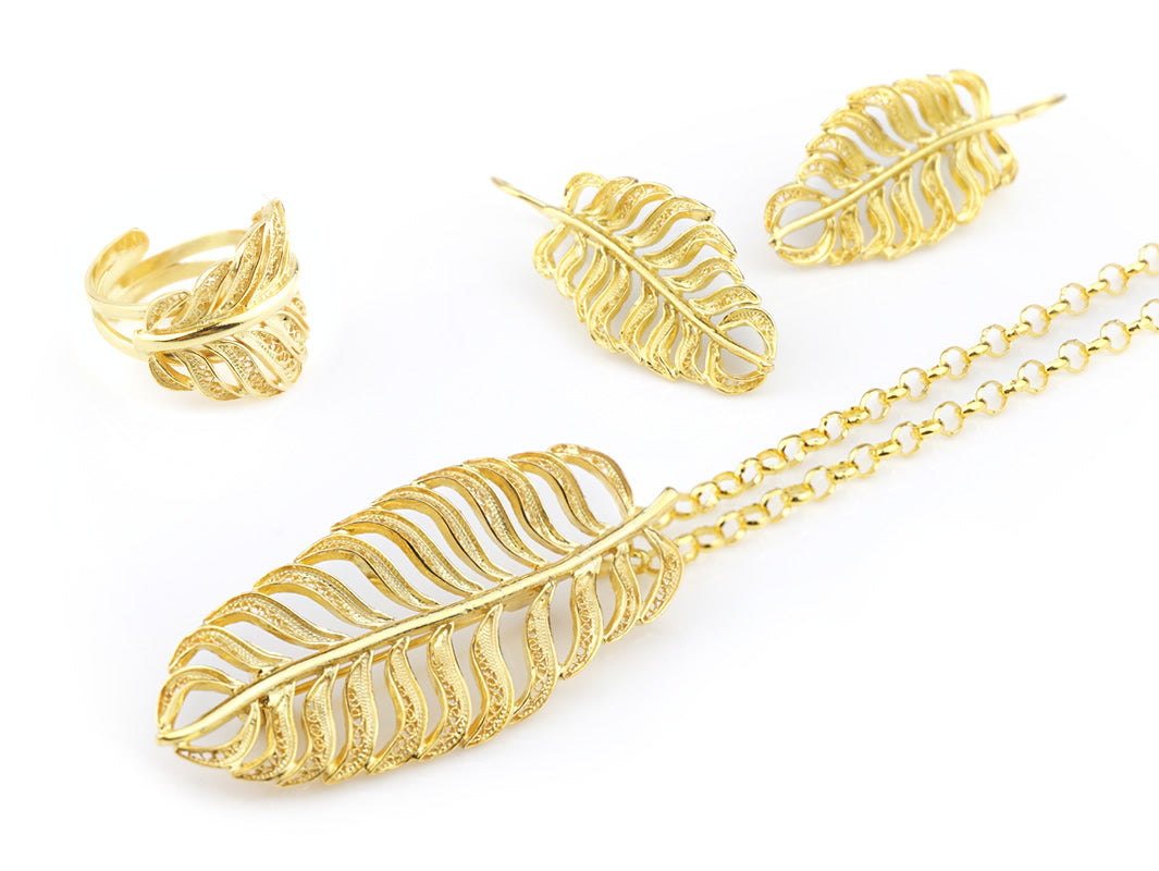 Long Leaf SET Earrings, Ring and Necklace, Portuguese Filigree, Golden 925 Sterling Silver