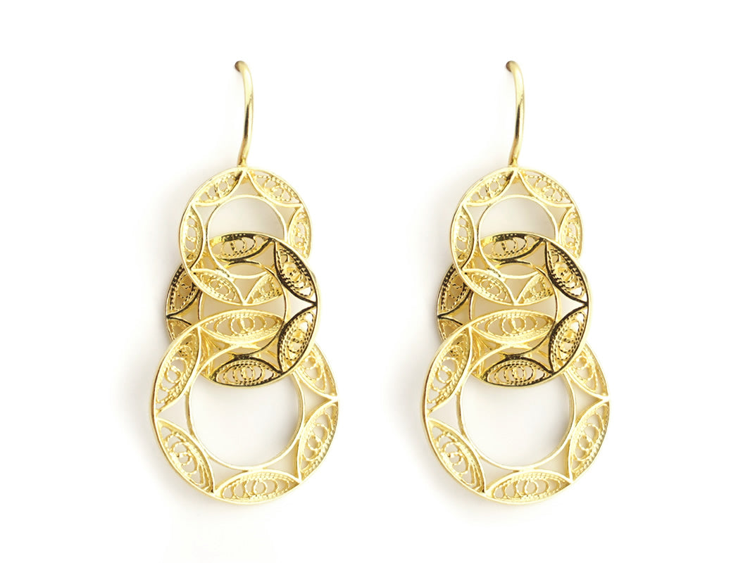 Elegant medium-sized Triple Circles dangle hook Earrings. Portuguese Filigree, crafted in Portugal in Golden 925 Sterling Silver.