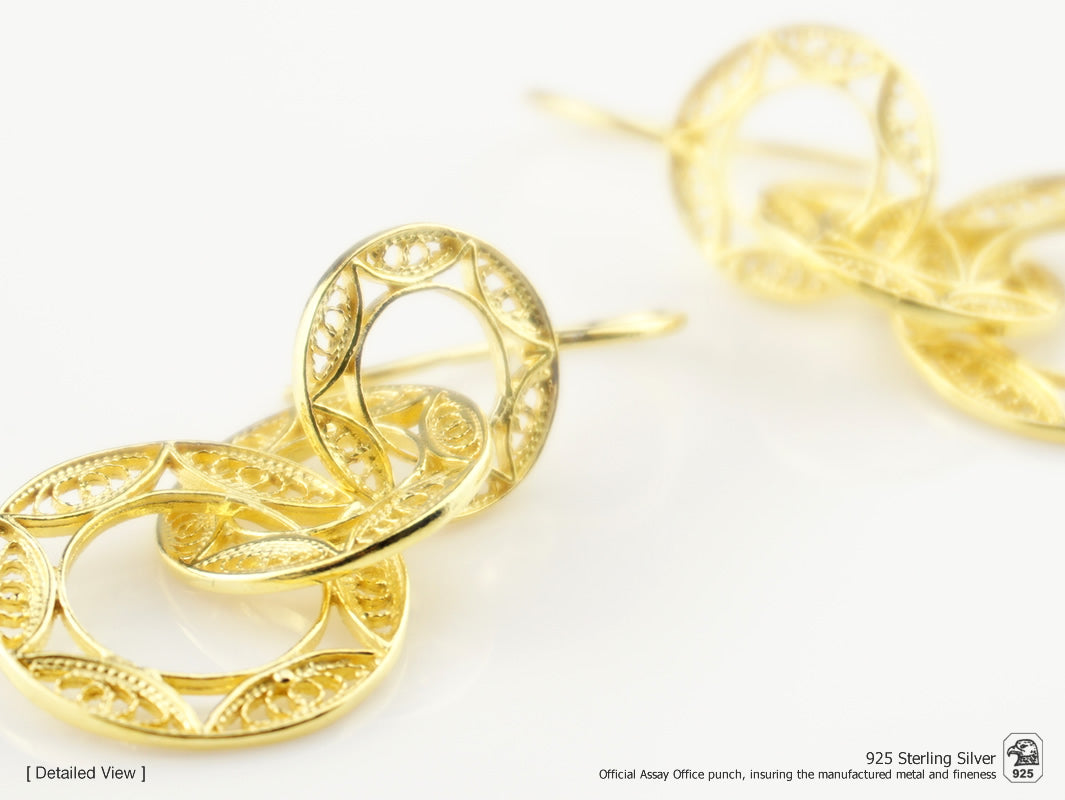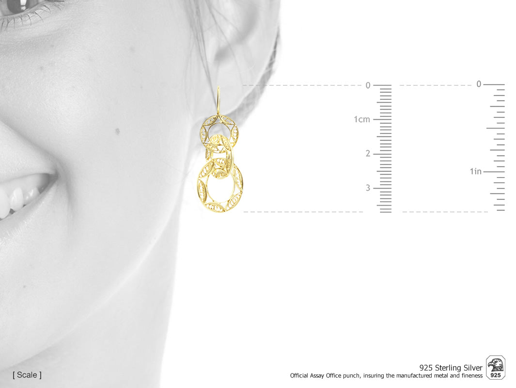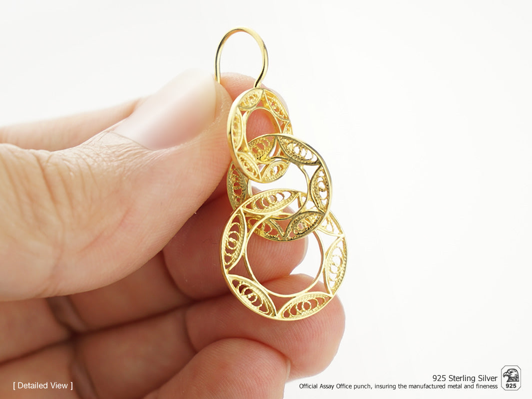 Triple Circles Dangle Earrings, Portuguese Filigree, Golden 925 Sterling Silver