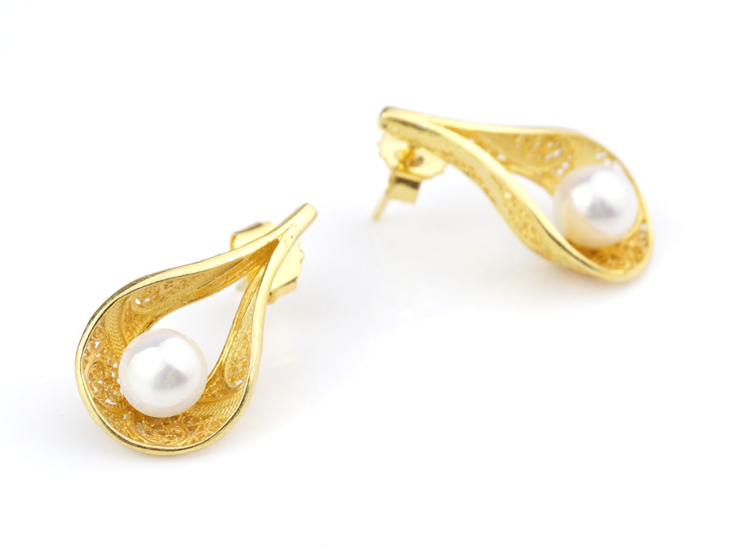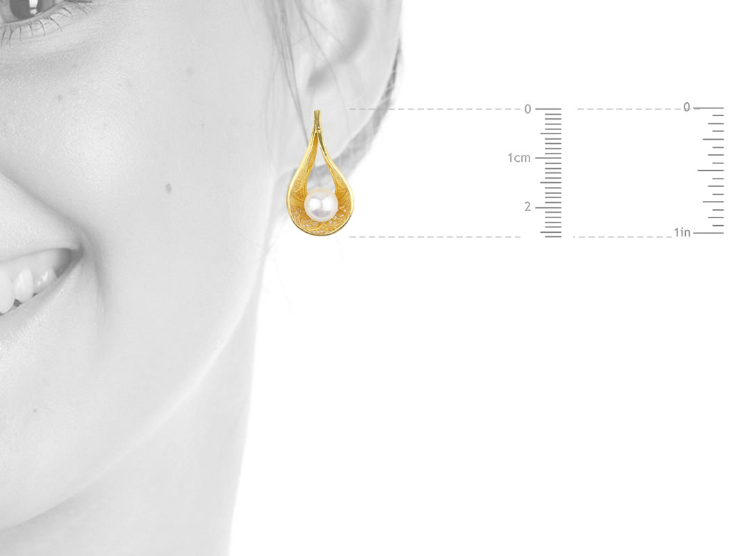 Elegant pushback Earrings with Freshwater Pearls. Portuguese Filigree, crafted in Portugal in Golden 925 Sterling Silver.