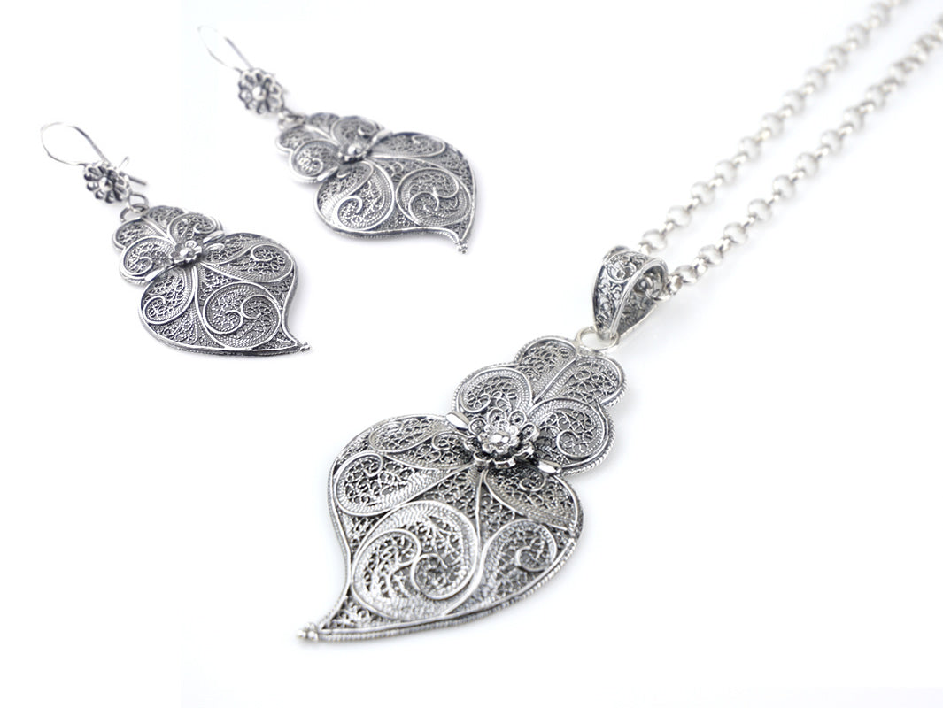 Elegant Viana Heart SET consisting of Earrings and Necklace. Portuguese Filigree, crafted in Portugal in 925 Sterling Silver.