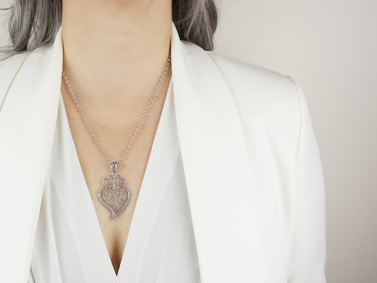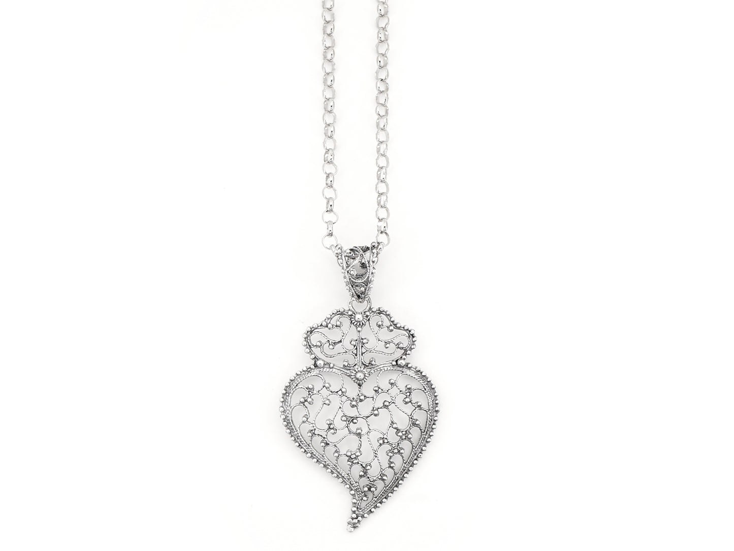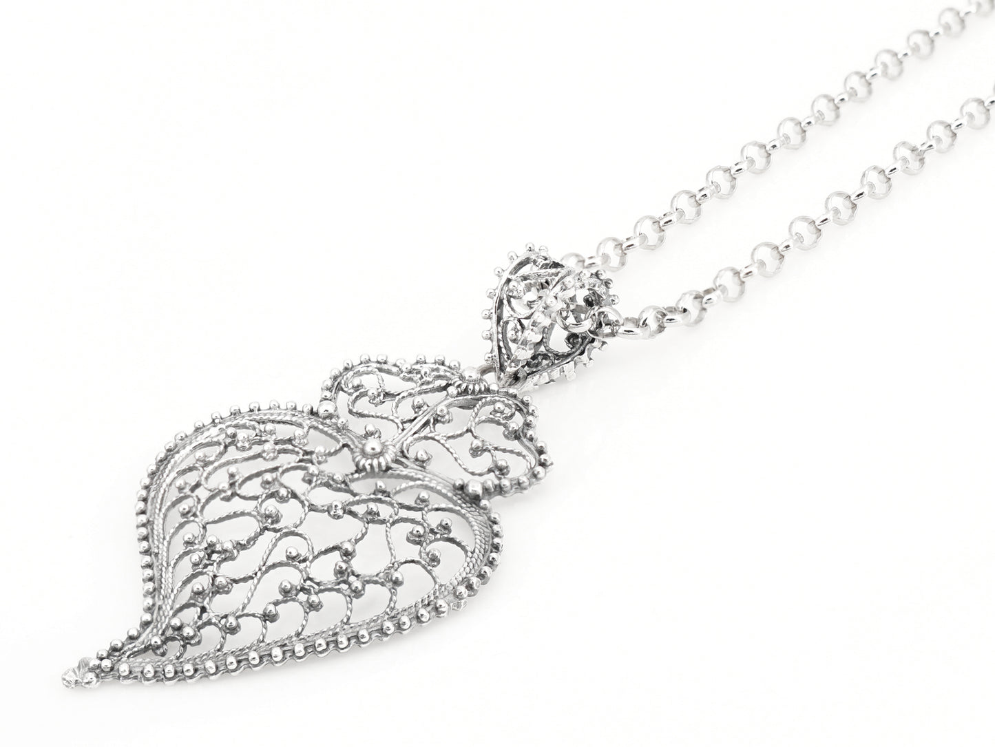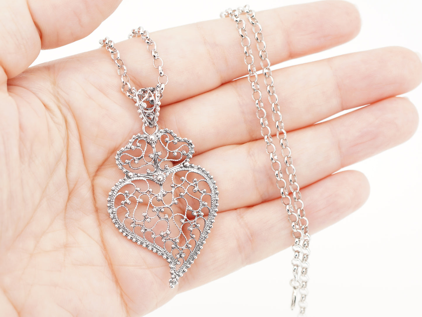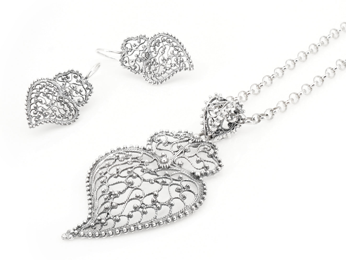 Renda Viana Heart SET Earrings and Necklace, Portuguese Filigree, 925 Sterling Silver