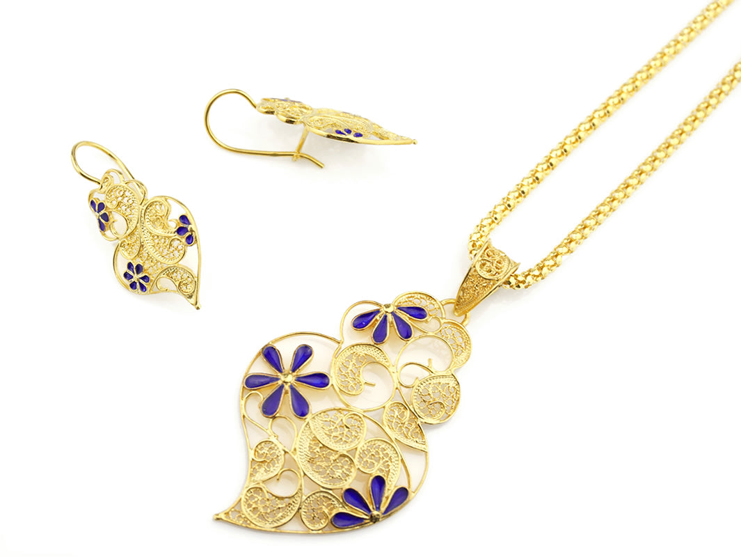 Elegant "Heart with Enameled Flowers" SET consisting of Earrings and Medium-length Granites Necklace. Portuguese Filigree, crafted in Portugal in Golden 925 Sterling Silver.