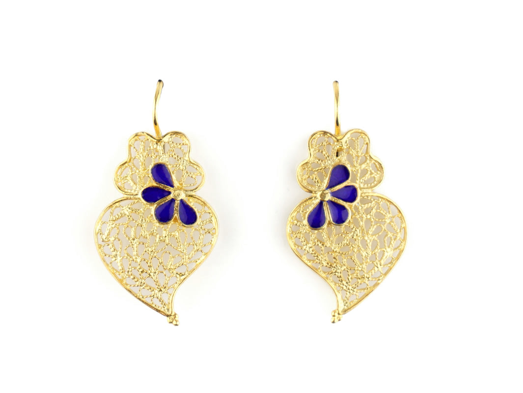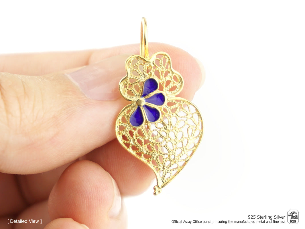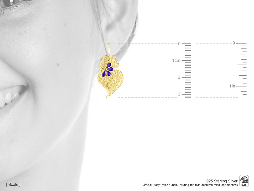 Elegant small Viana Heart hook Earrings with enameled petals. Portuguese Filigree, crafted in Portugal in Golden 925 Sterling Silver.