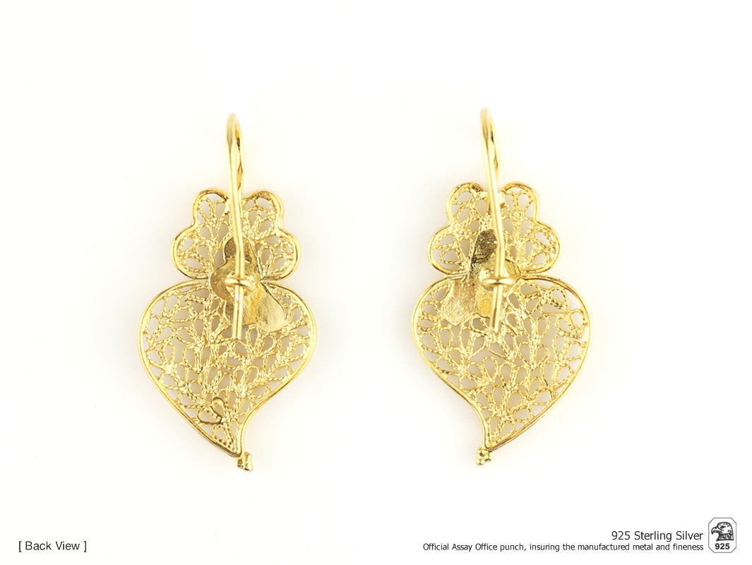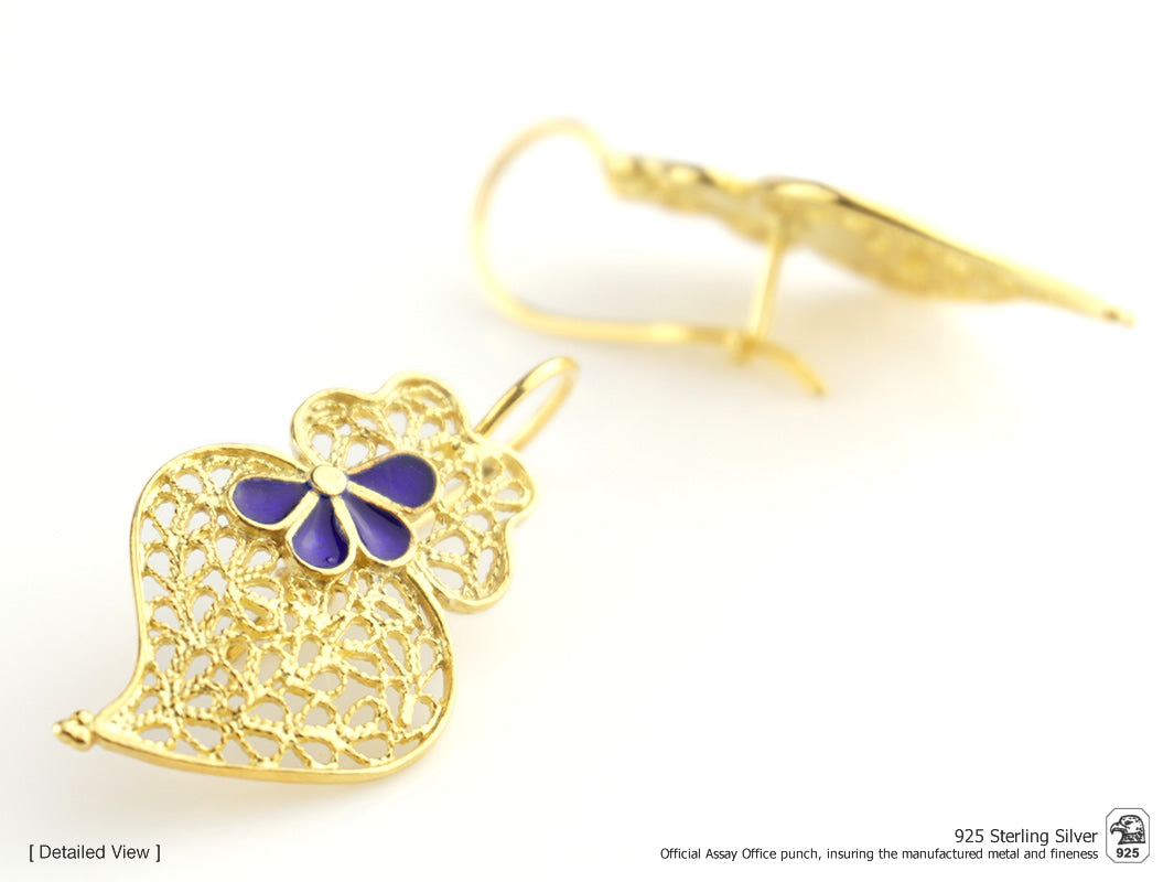 Small Viana Heart Earrings with Enameled Petals, Portuguese Filigree, Golden 925 Sterling Silver