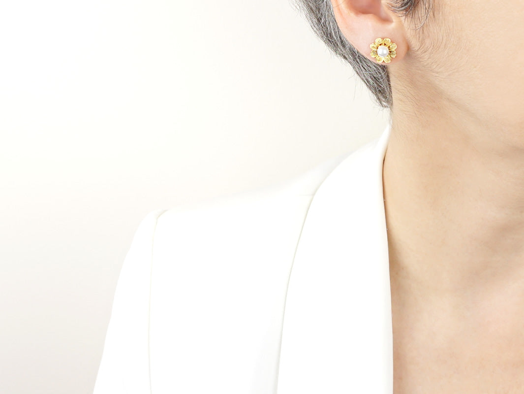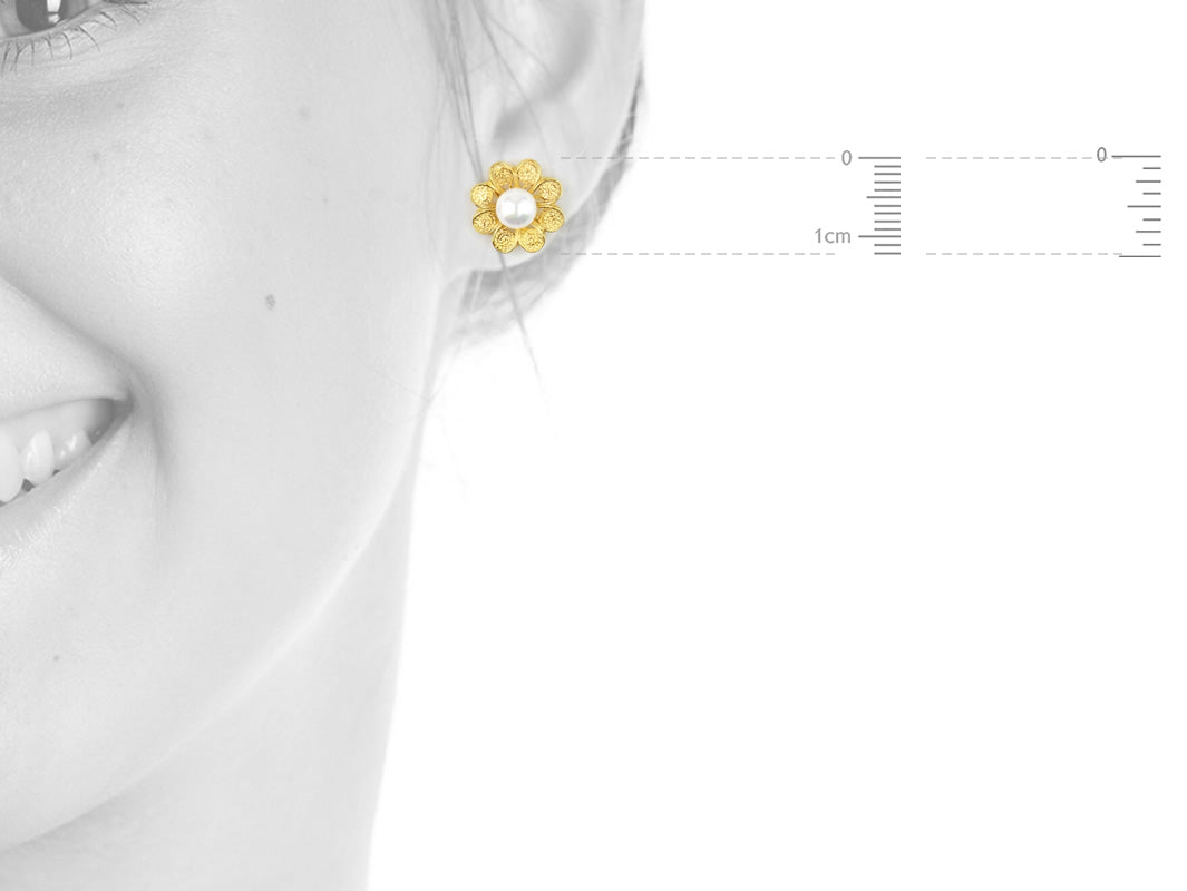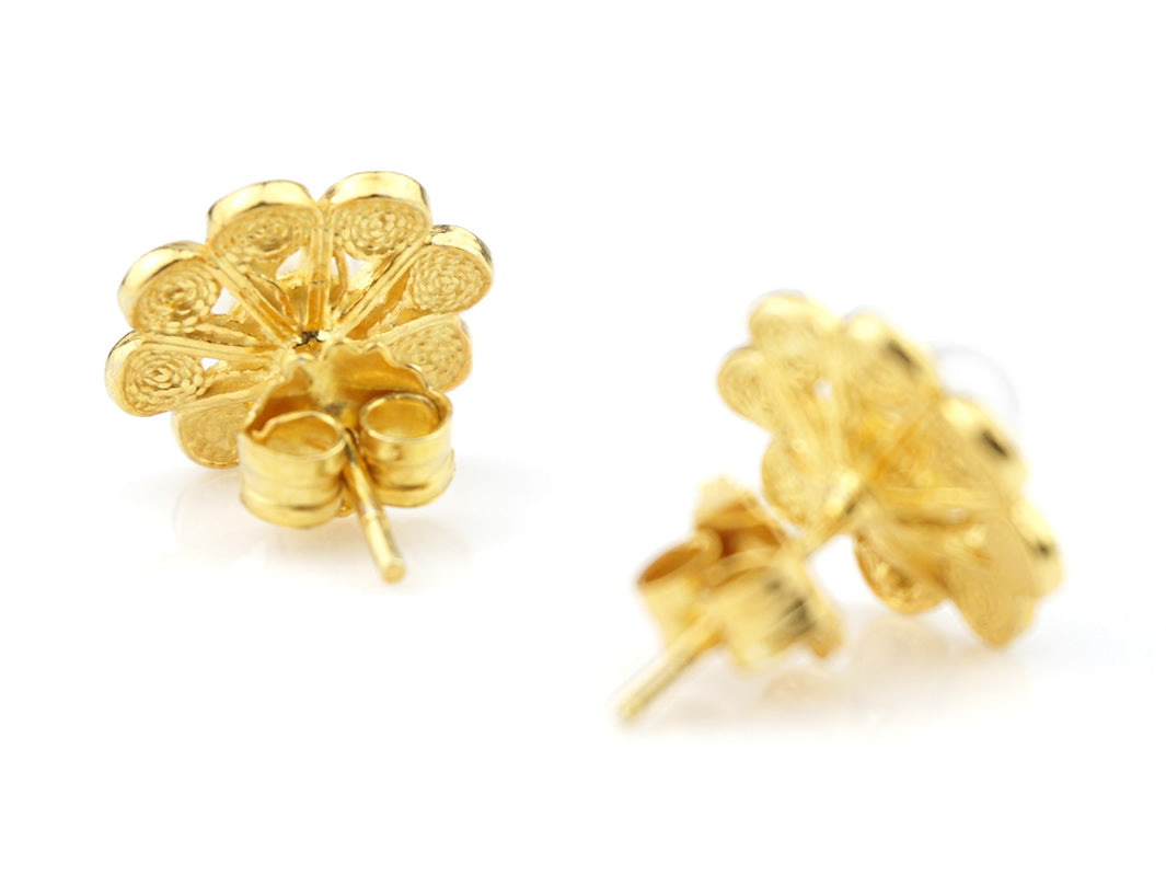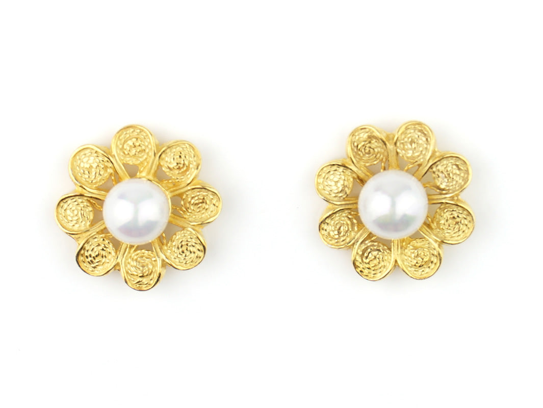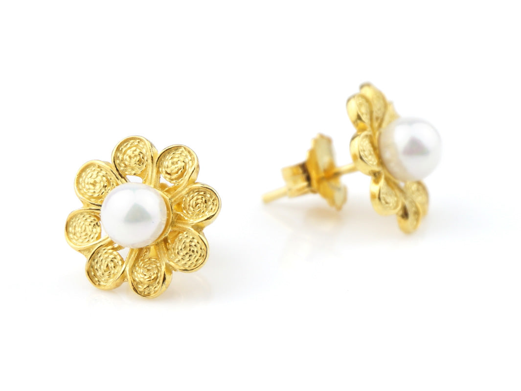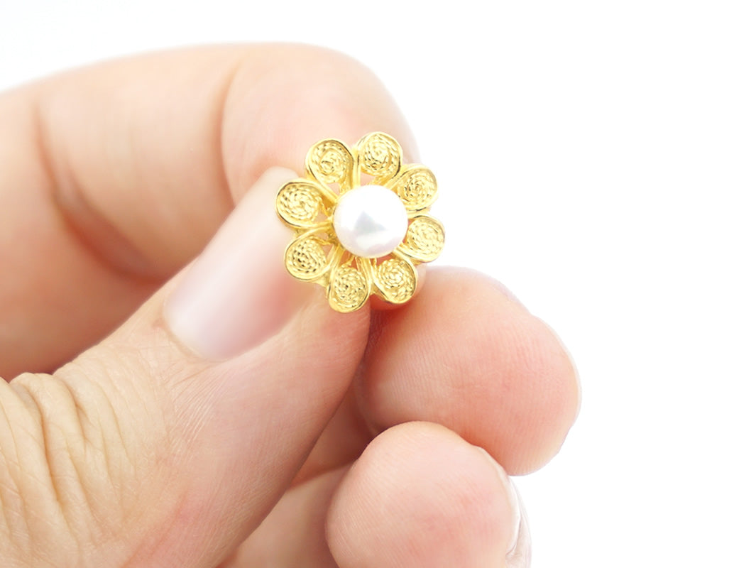 Elegant Small Flower pushback Earrings with Freshwater Pearls. Portuguese Filigree, crafted in Portugal in Golden 925 Sterling Silver.