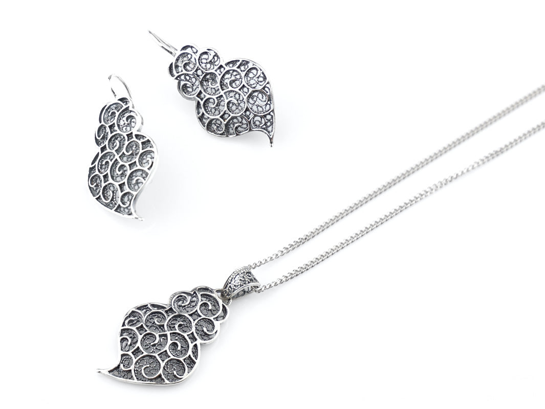 Small Hearts with Spirals SET Earrings and Necklace, Portuguese Filigree, 925 Sterling Silver