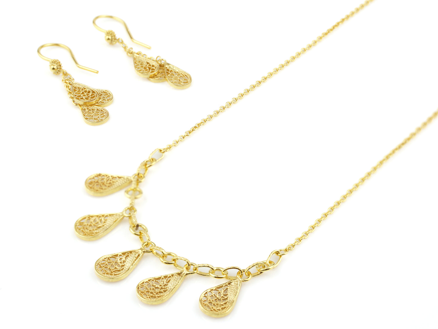 Teardrops Earrings and Necklace Set, Portuguese Filigree, Golden 925 Sterling Silver