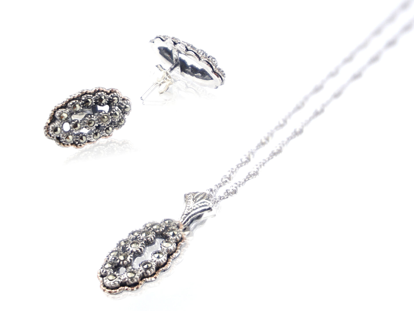 Oval Pinecone Marcasites SET of Necklace and Earrings, 925 Sterling Silver