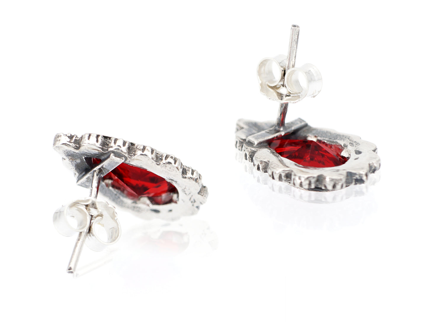 Elegant Marcasites Teardrop pushback Earrings with Red Stone, inspired by Portuguese jewelry from the 18th century, crafted by talented artisans in 925 Sterling Silver and 9k Gold.