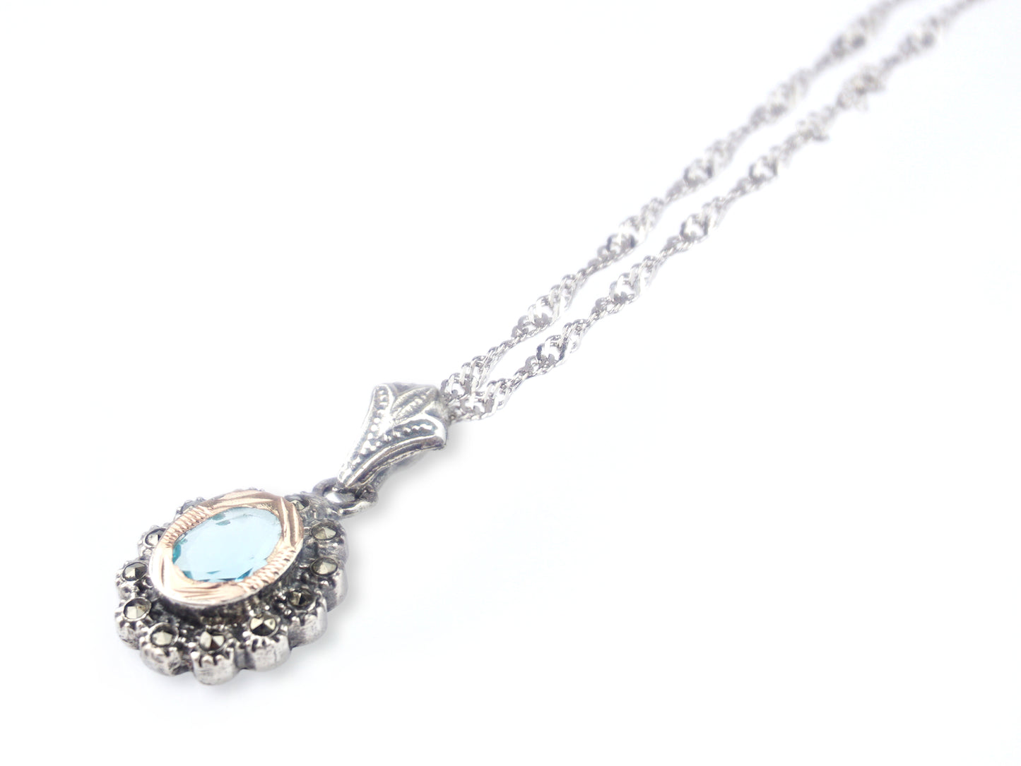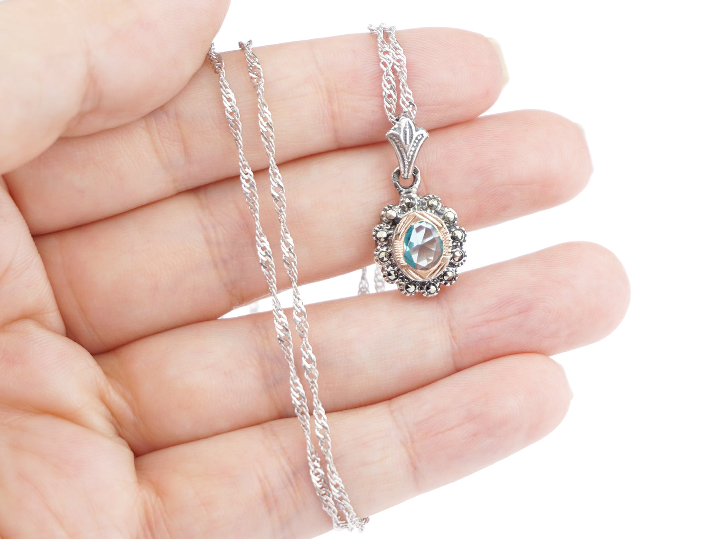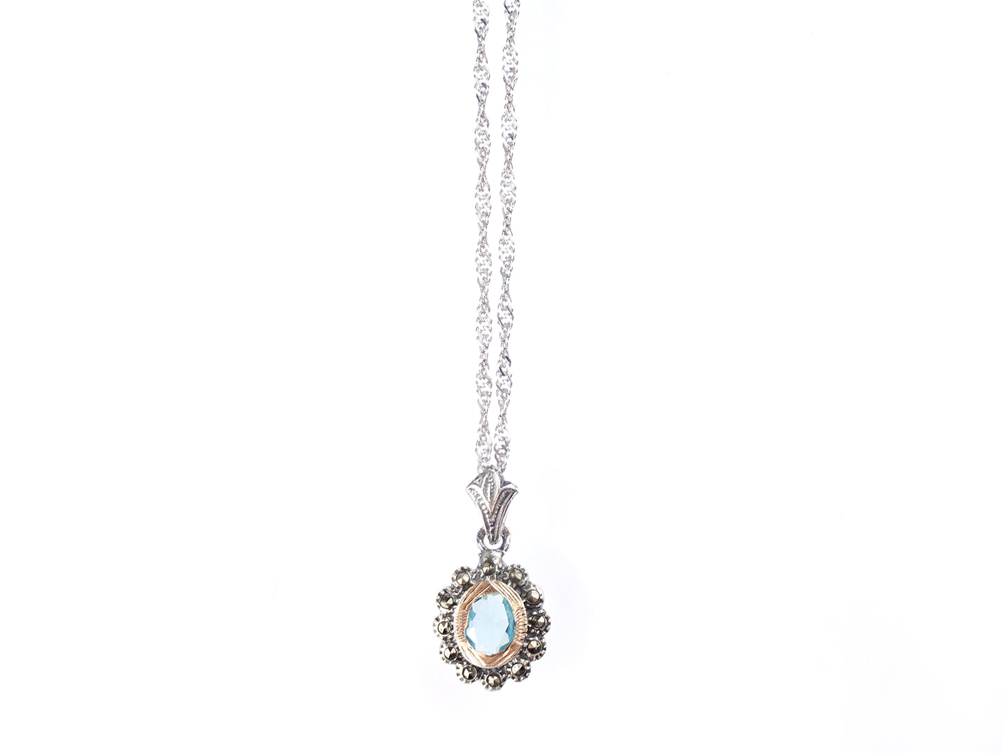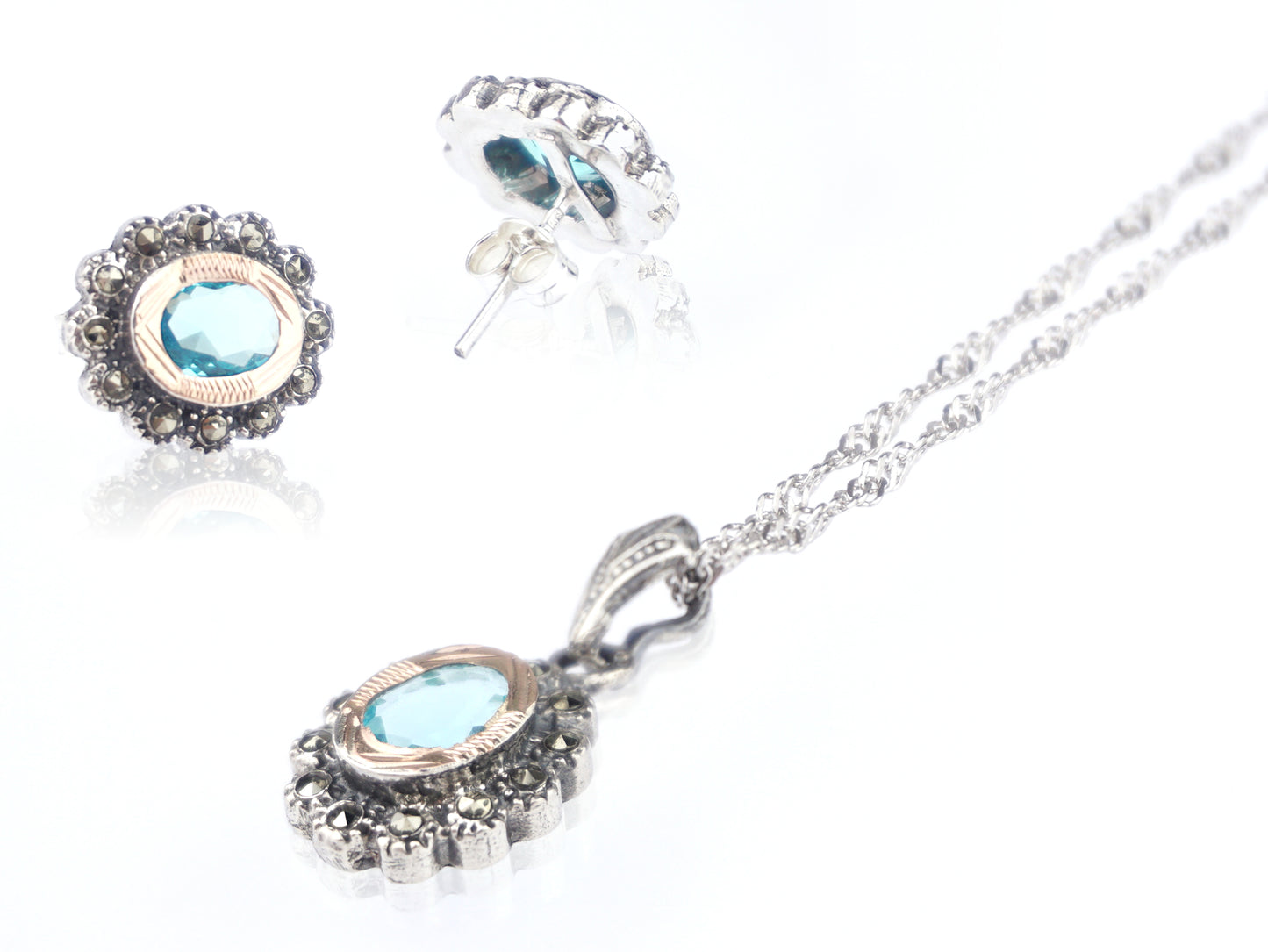 Oval Marcasites SET of Necklace and Earrings with Aqua Blue Stones, 925 Sterling Silver and 9k Gold