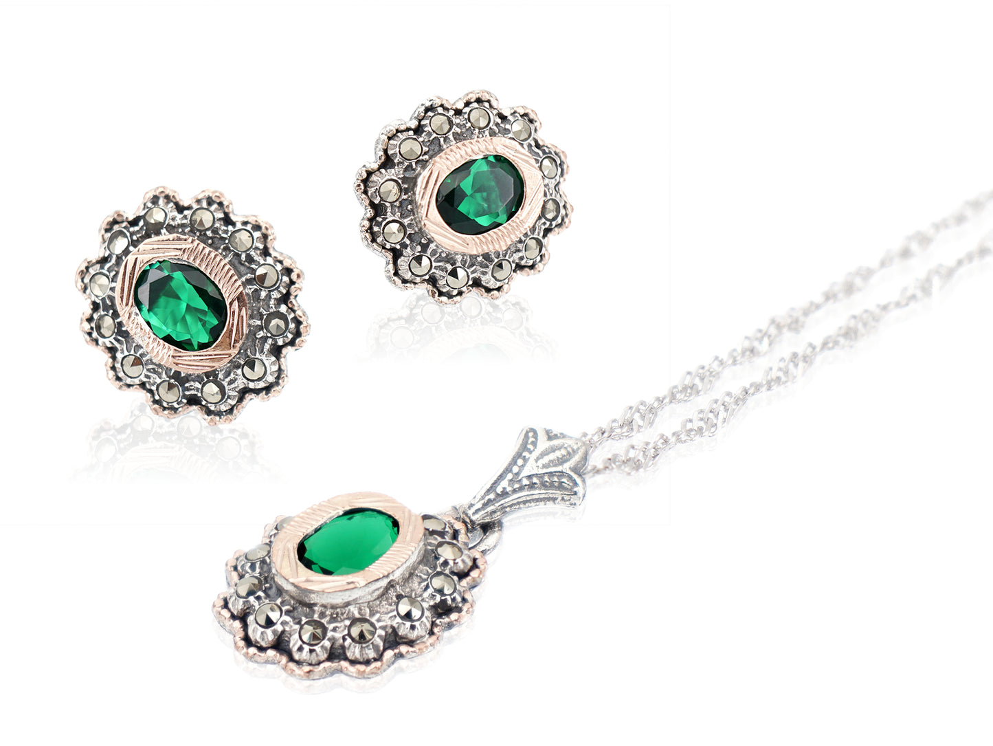 Oval Marcasites SET of Necklace and Earrings with Outer Fillet and Green Stones, 925 Sterling Silver and 9k Gold