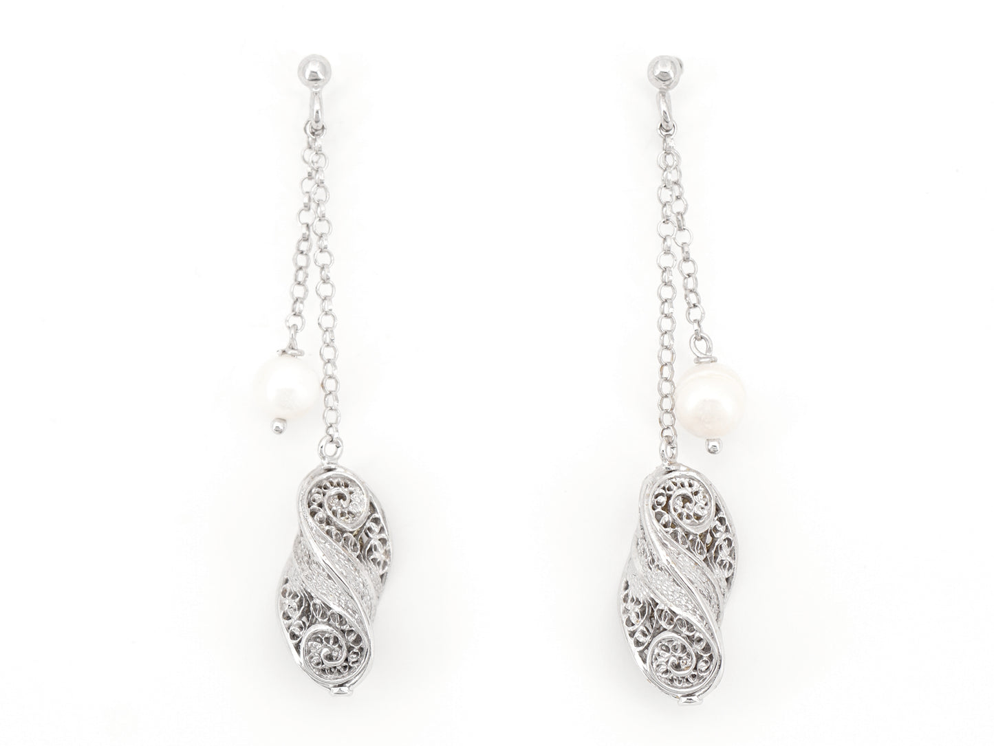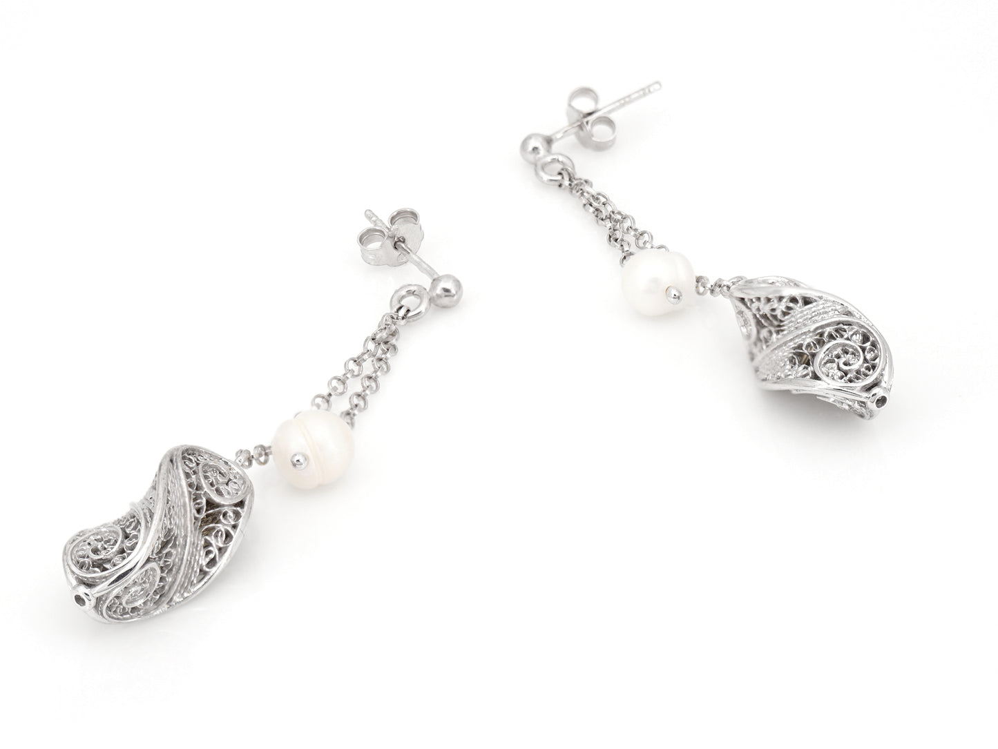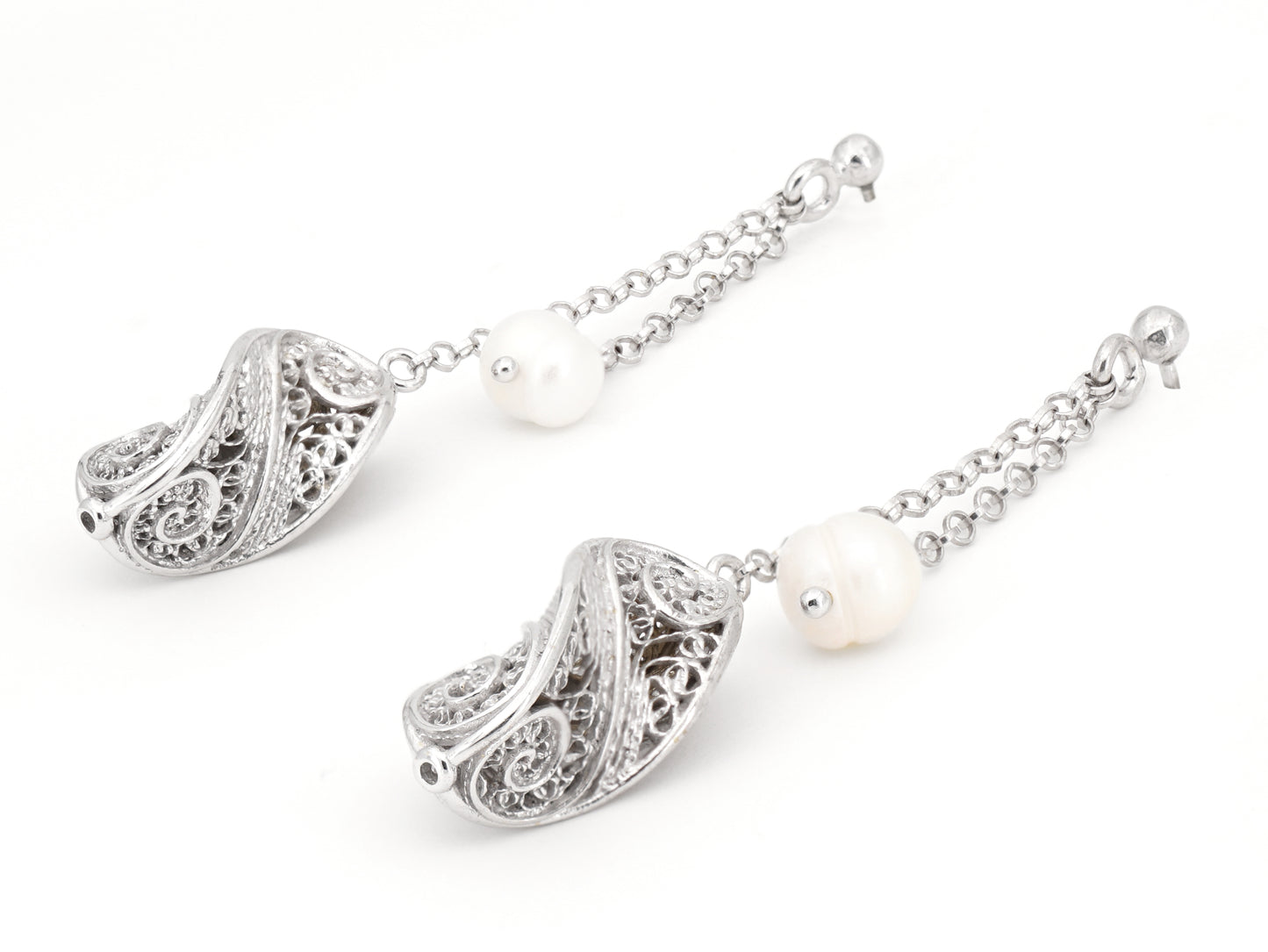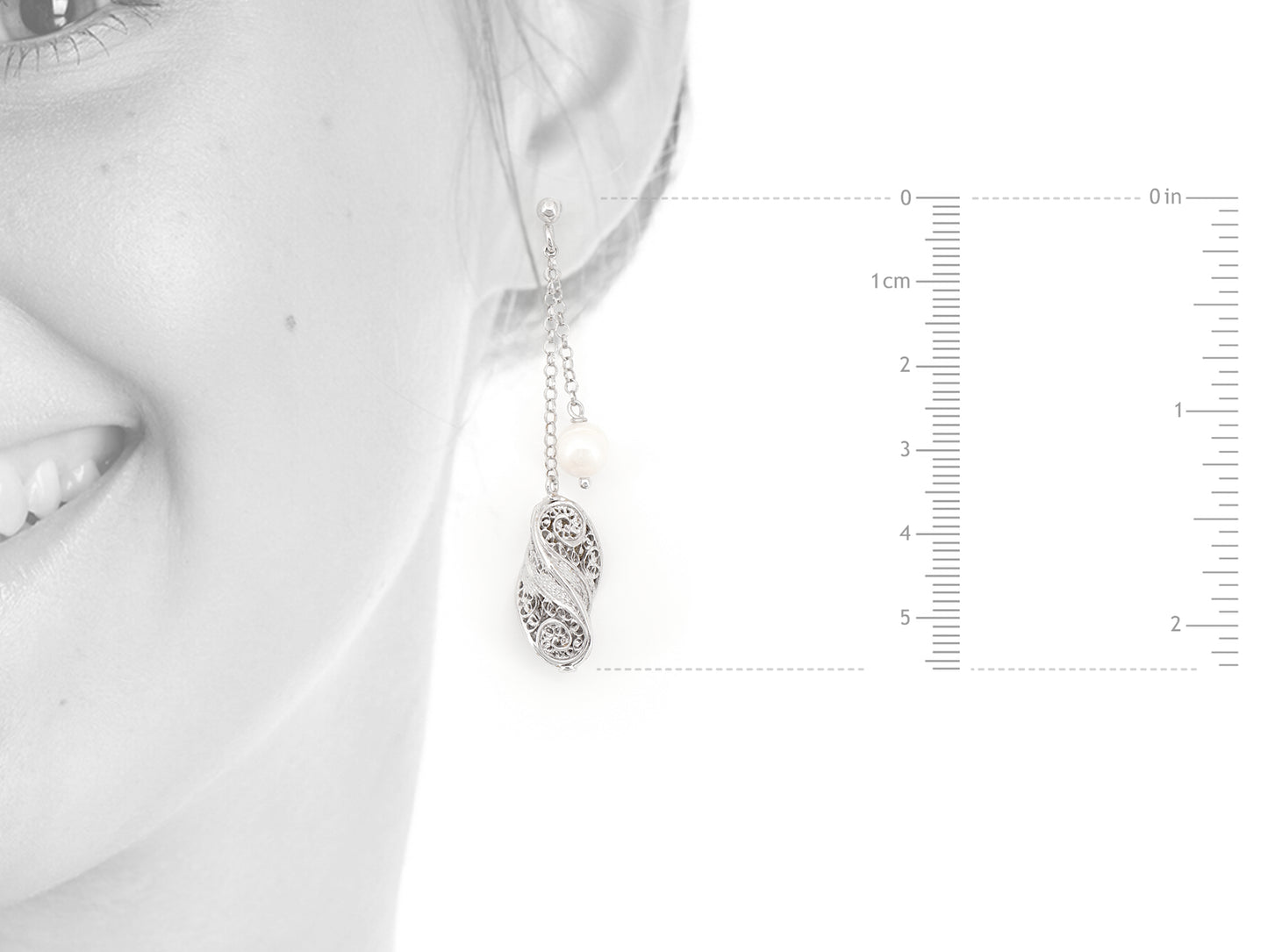 Elegant Long Dangle pushback Earrings with Freshwater Pearl. Portuguese Filigree, crafted in Portugal in Rhodium-finished 925 Sterling Silver.