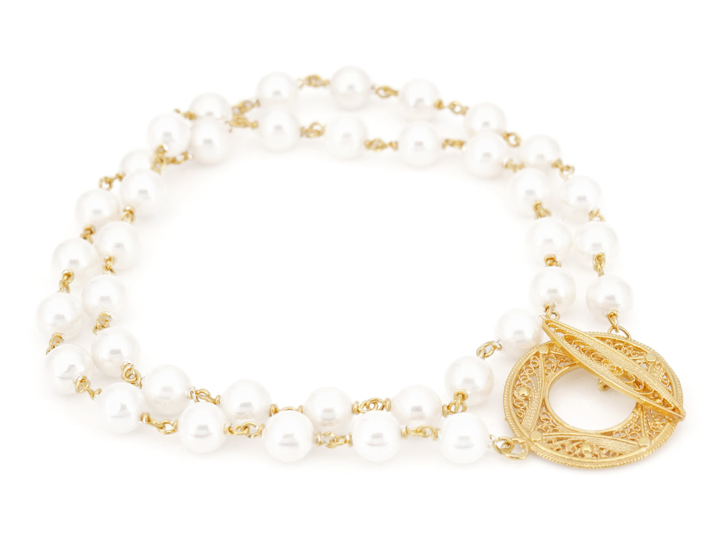 Elegant Freshwater Pearls Necklace with Filigree Toggle closure. Depending on ones wrist size, it might be used as a double bracelet. Crafted in Portugal in Golden 925 Sterling Silver.