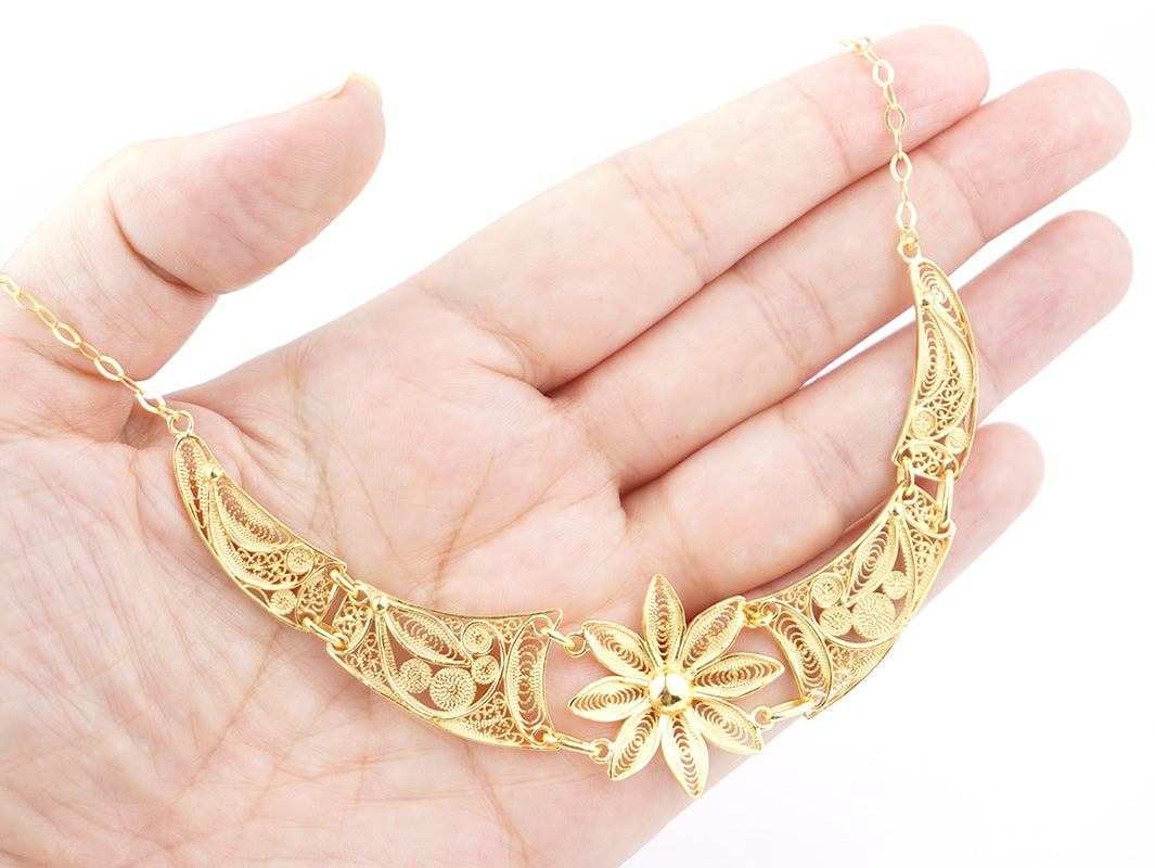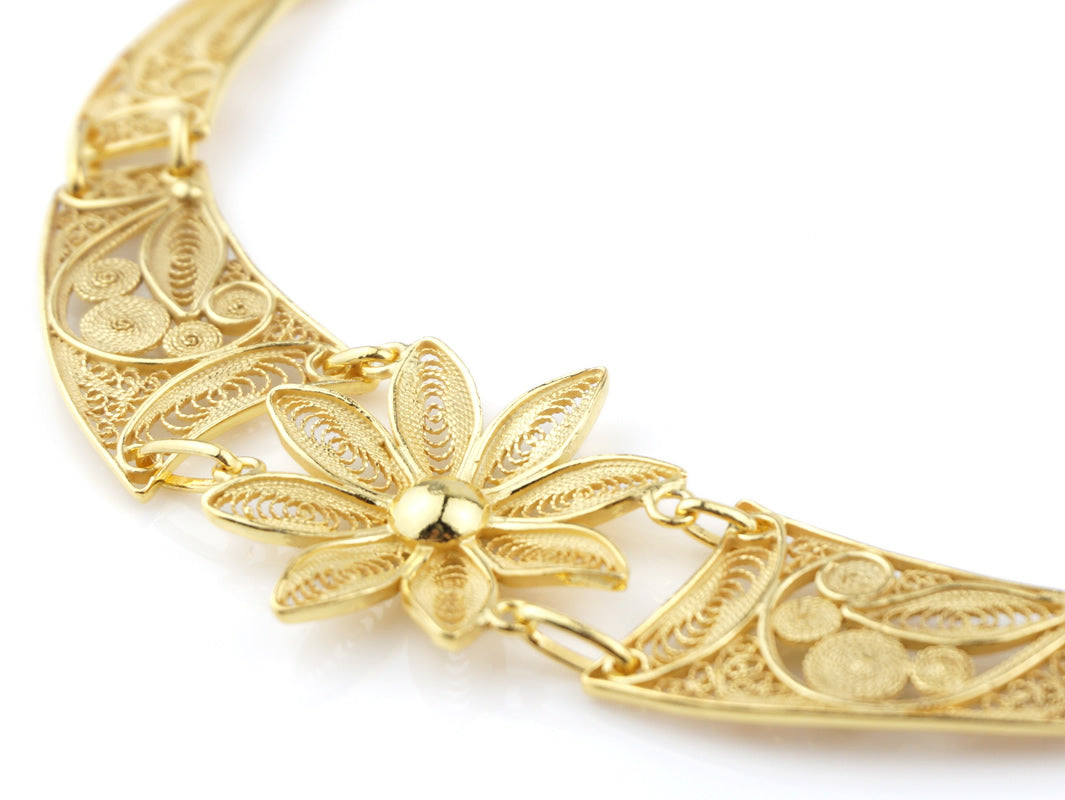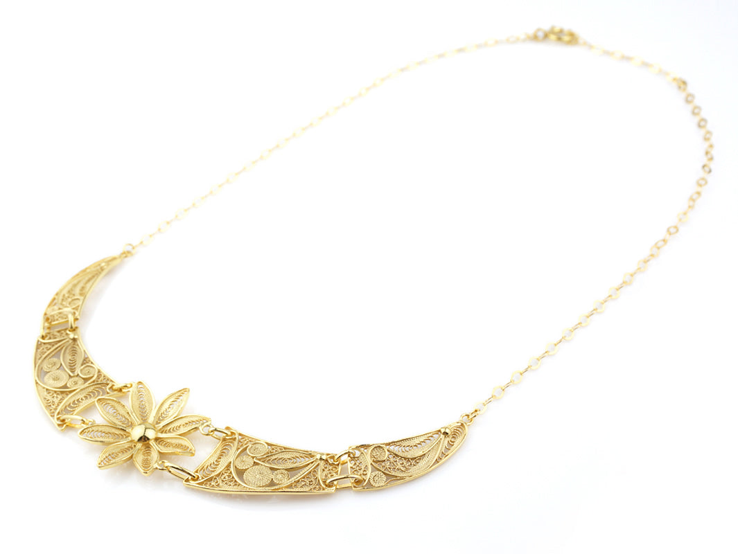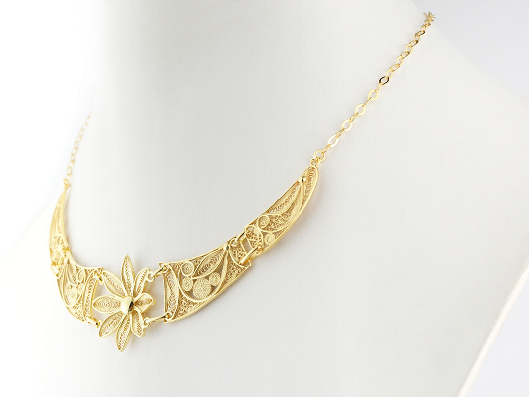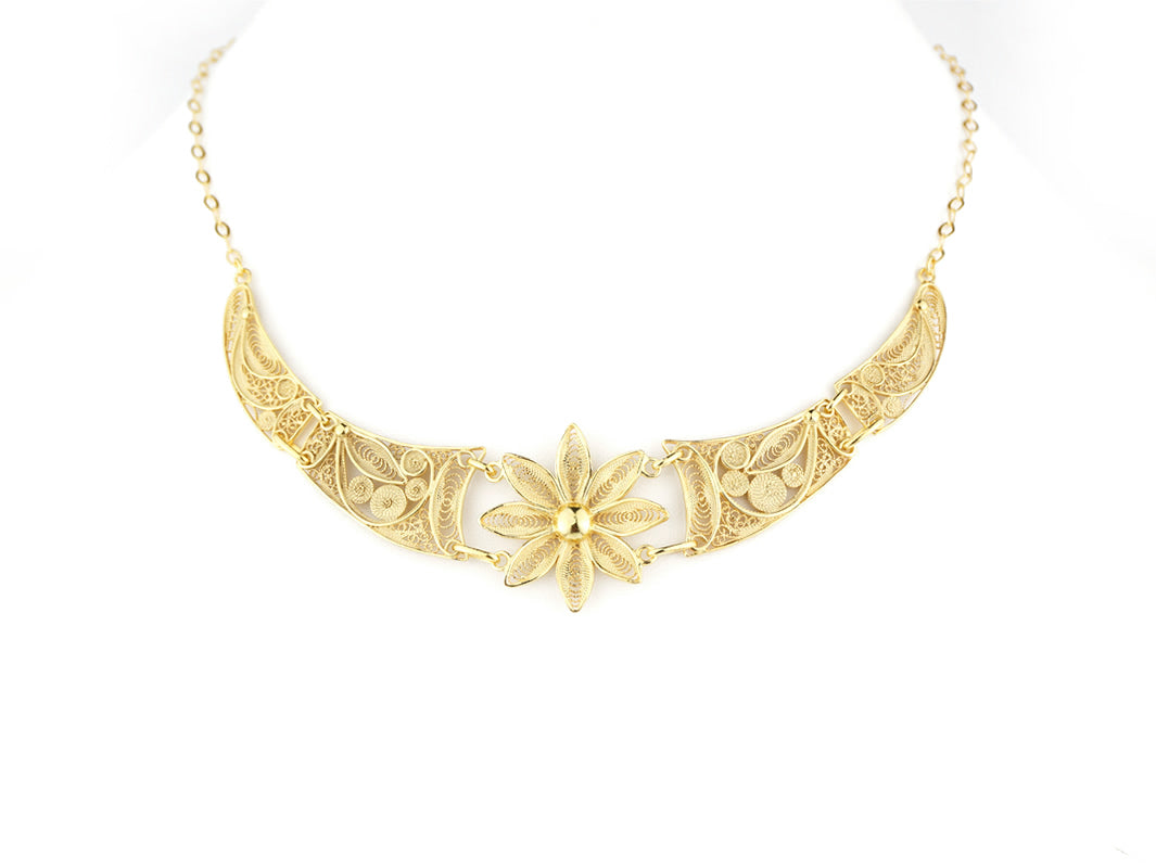Symmetrical Five-Piece Necklace, Portuguese Filigree, Golden 925 Sterling Silver