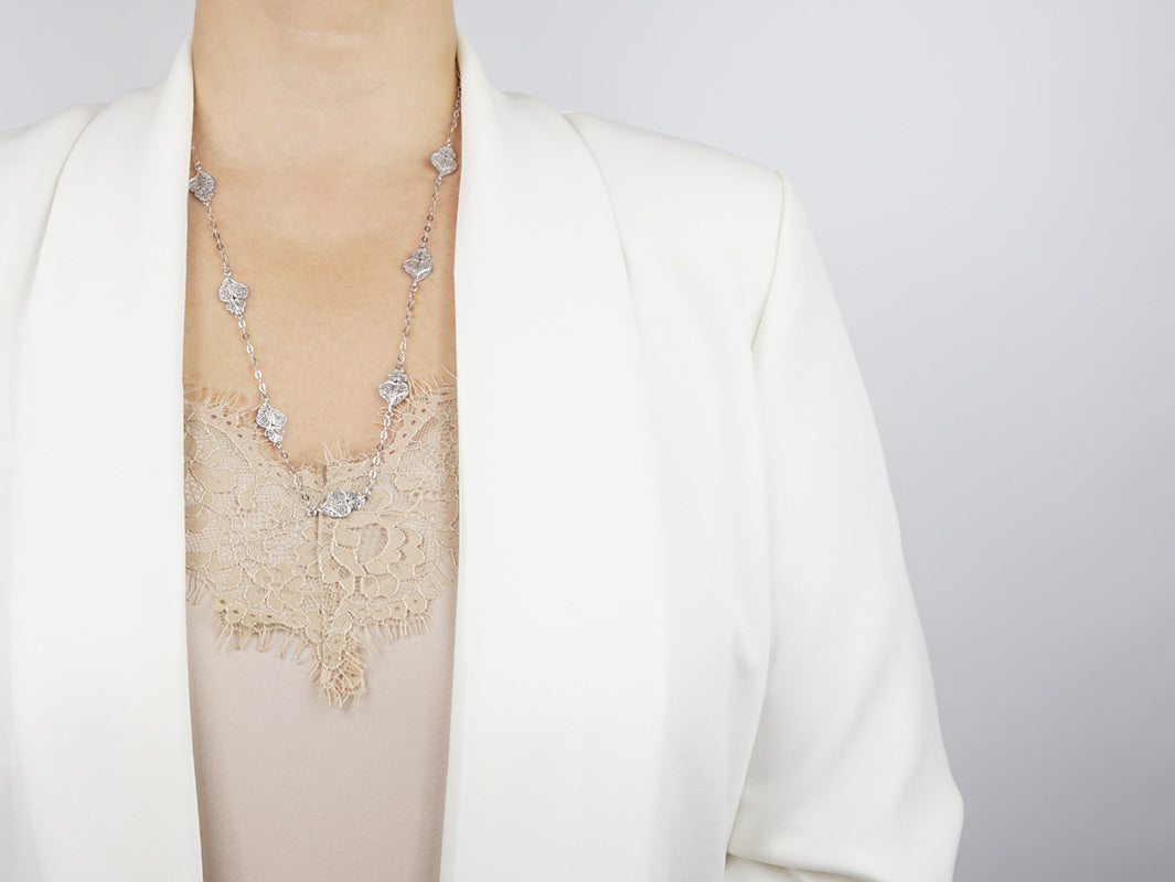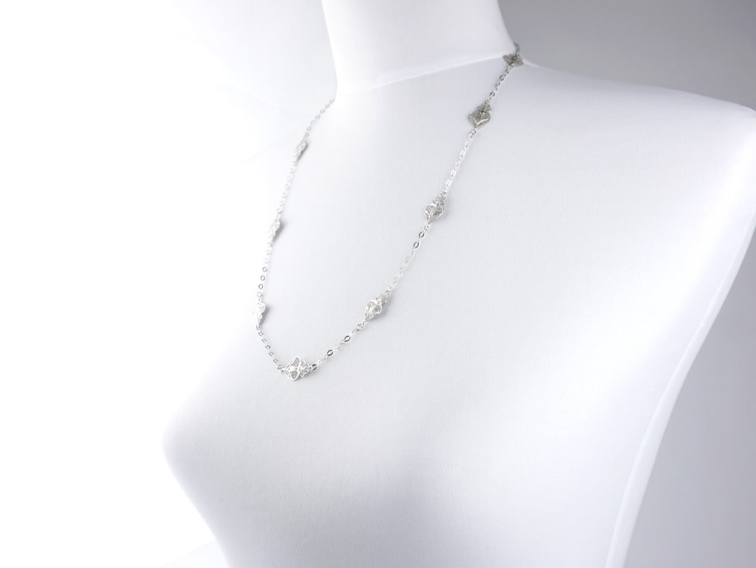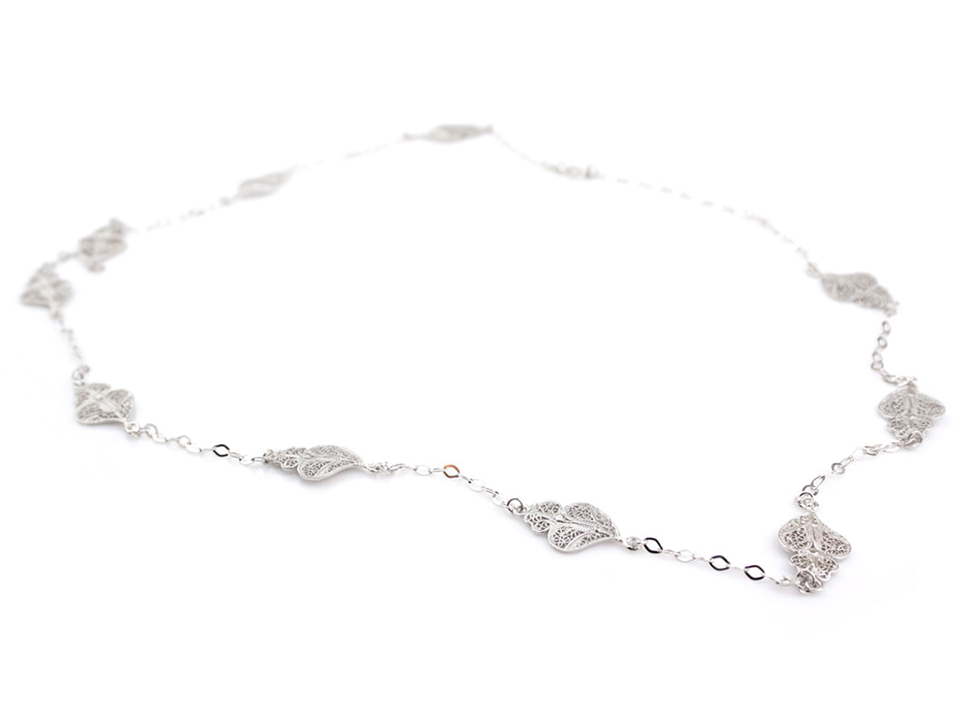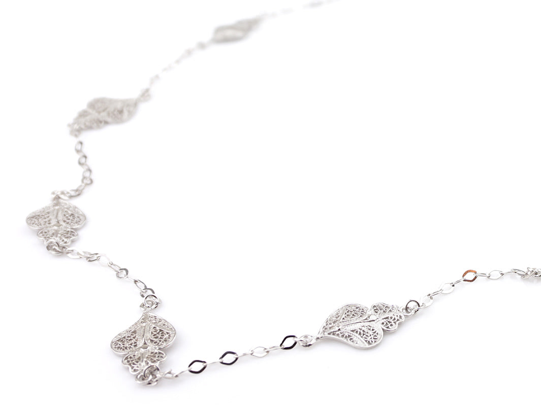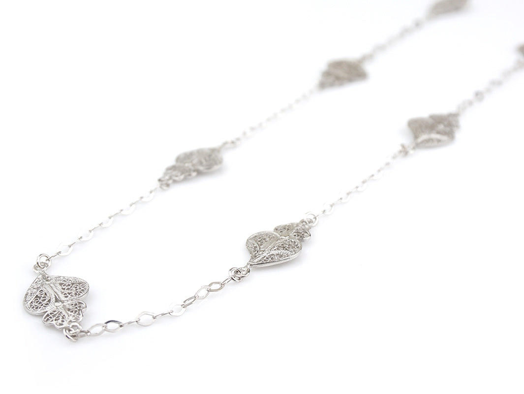 Elegant Necklace with Ten Small Viana Hearts. Portuguese Filigree, crafted in Portugal in Rhodium-finished 925 Sterling Silver.