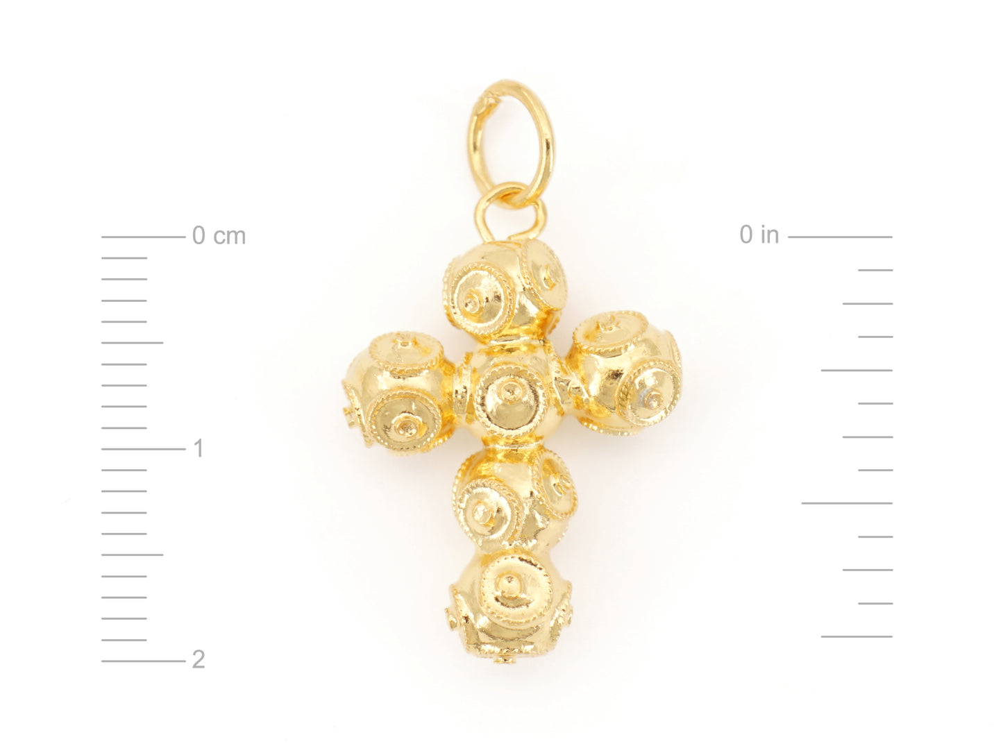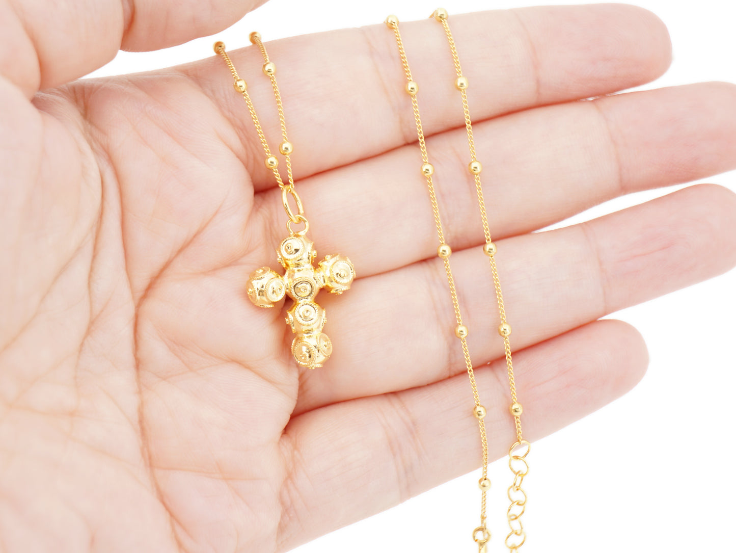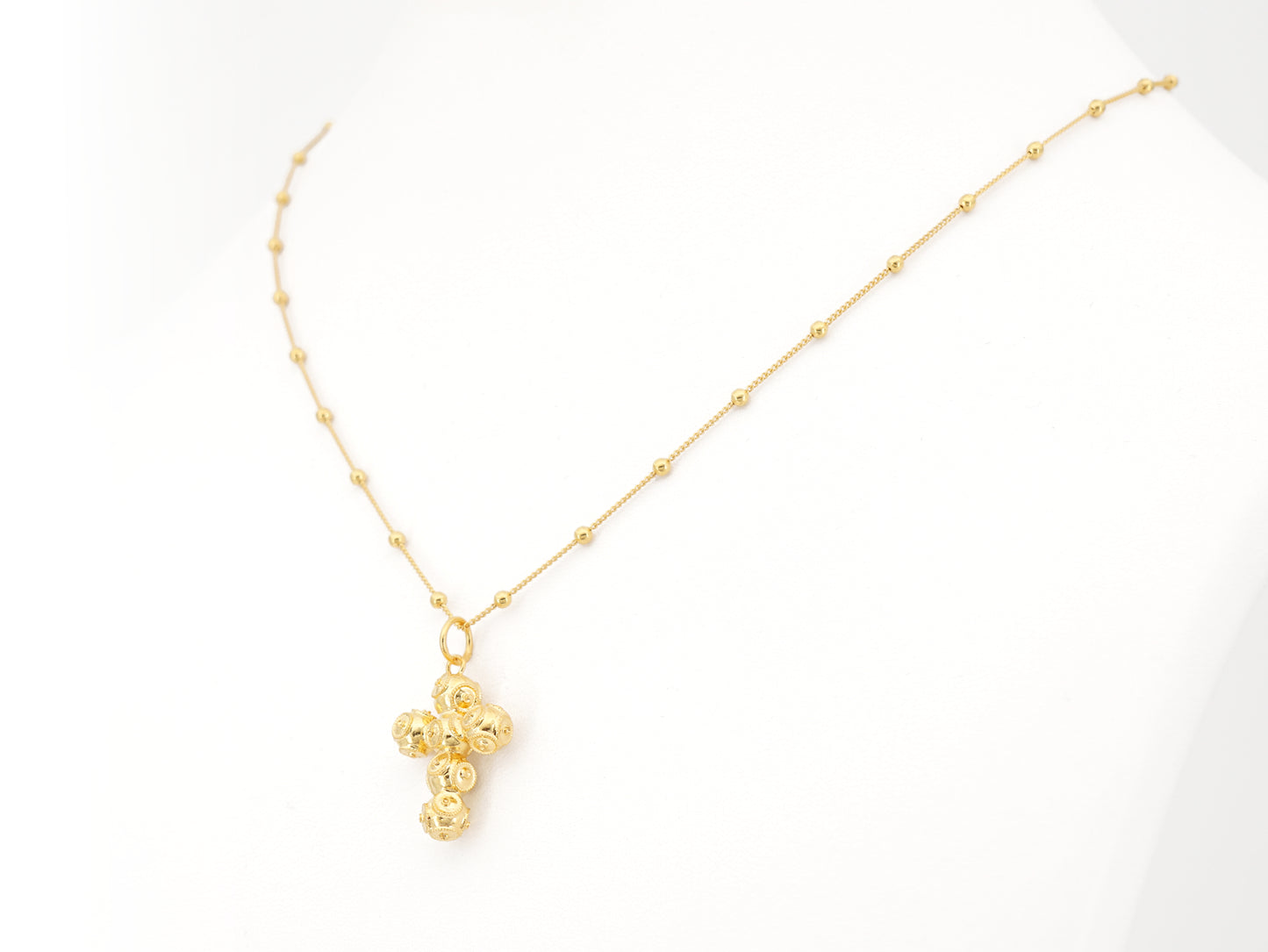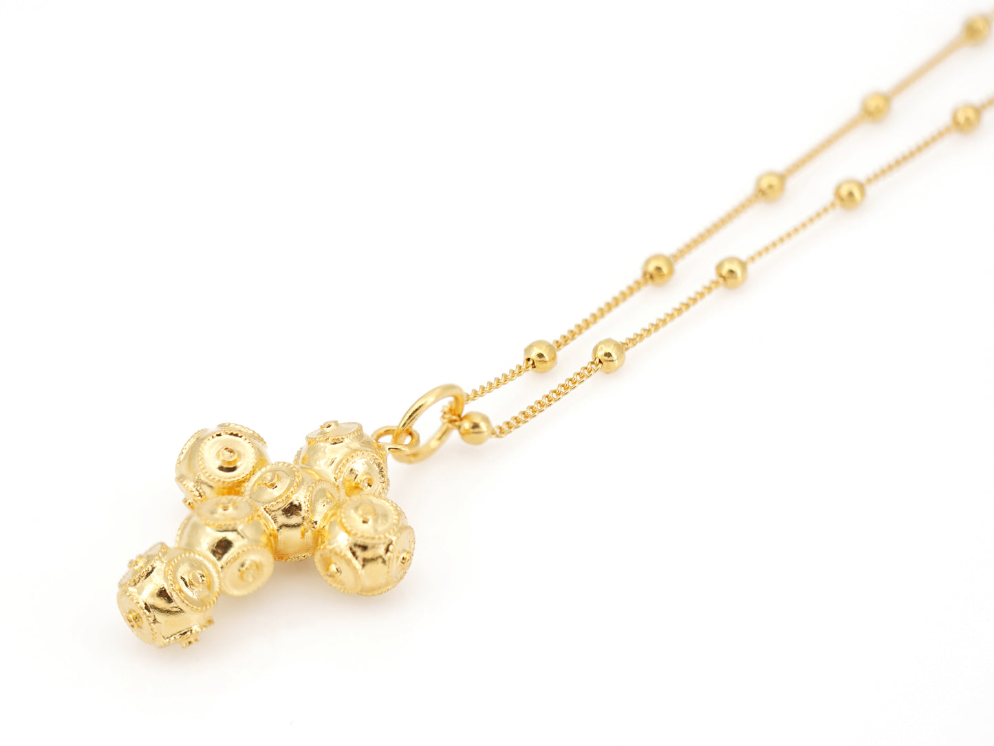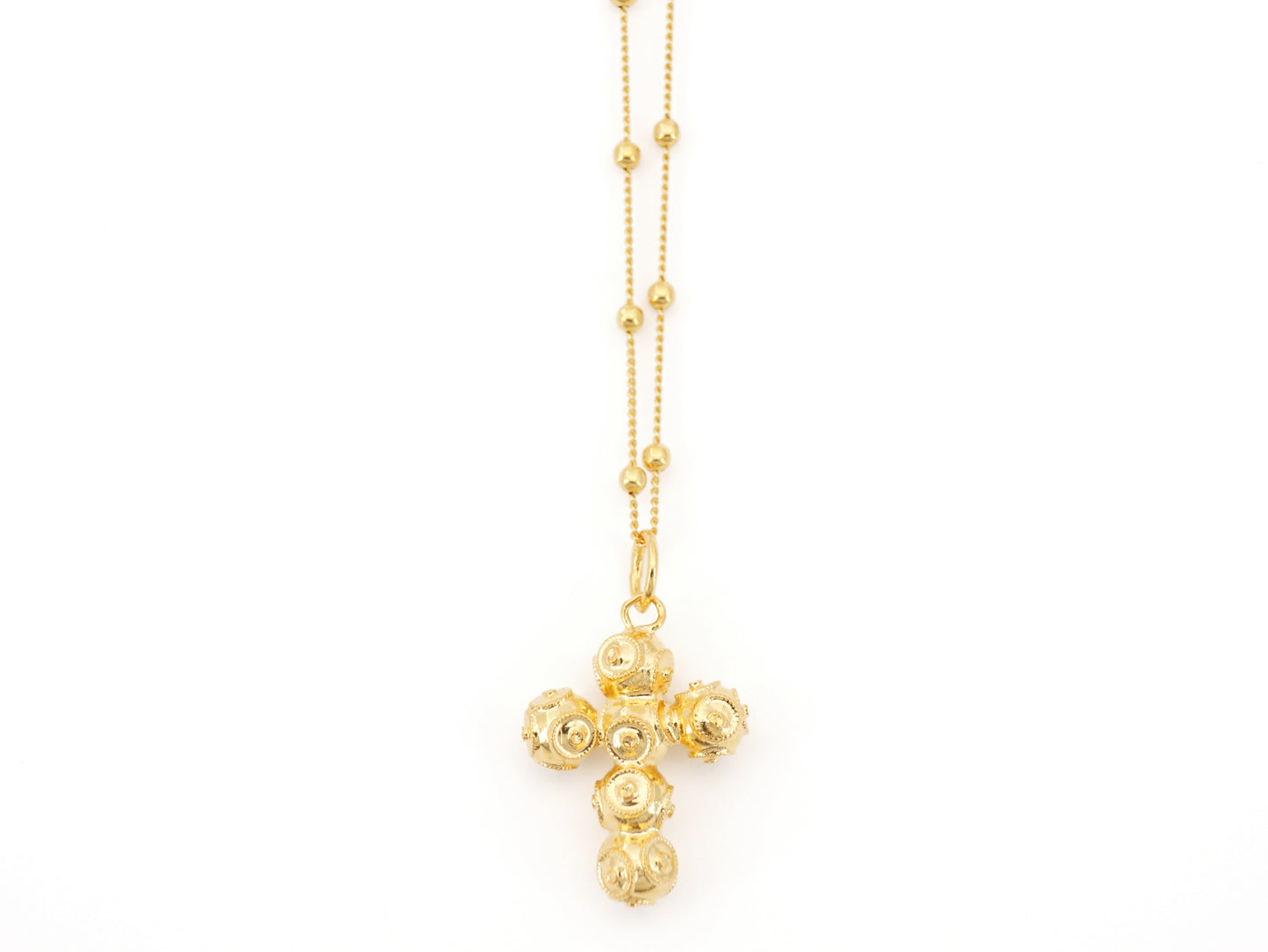 Elegant Short "Spheres" Necklace with Small Viana Beads Cross Pendant. Portuguese Filigree, crafted in Portugal in Golden 925 Sterling Silver.