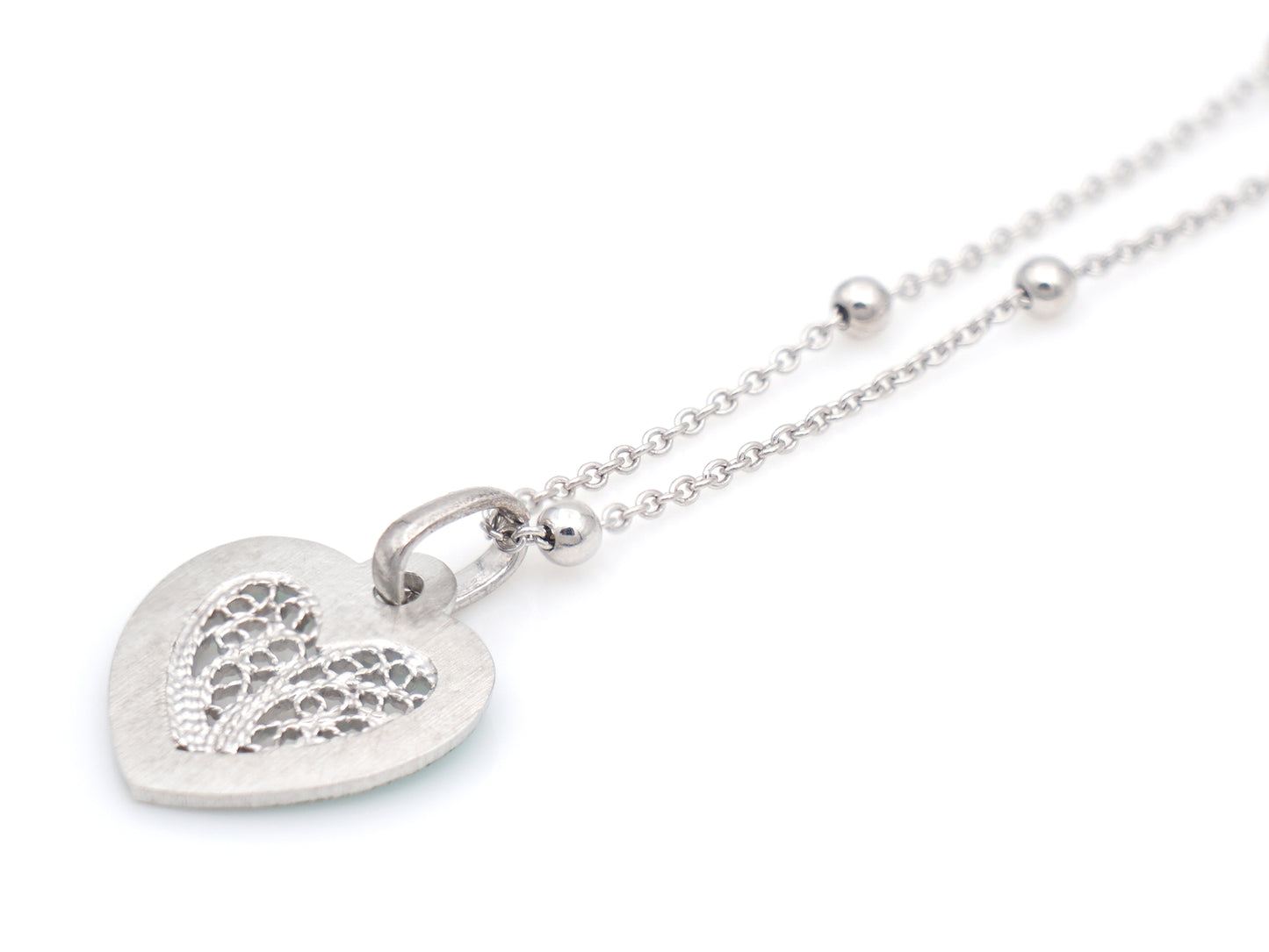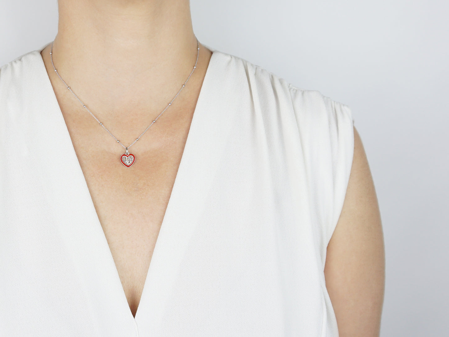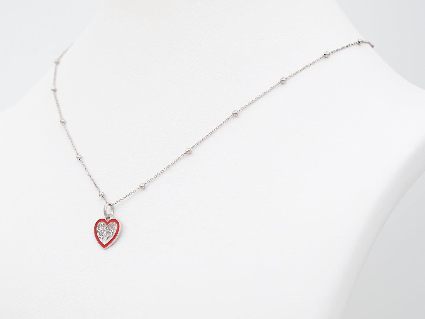 Elegant adjustable Spheres Necklace, with Small Heart Pendant with Red Enamel. Portuguese Filigree, crafted in Portugal in Rhodium-finished 925 Sterling Silver.