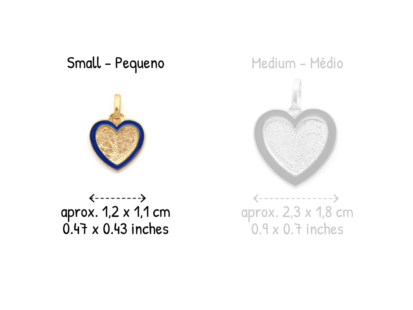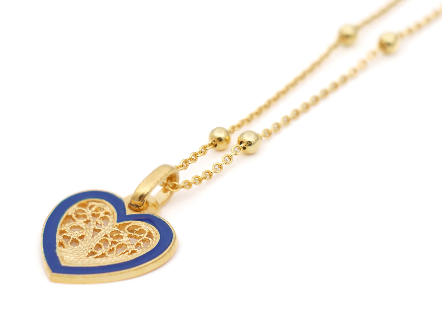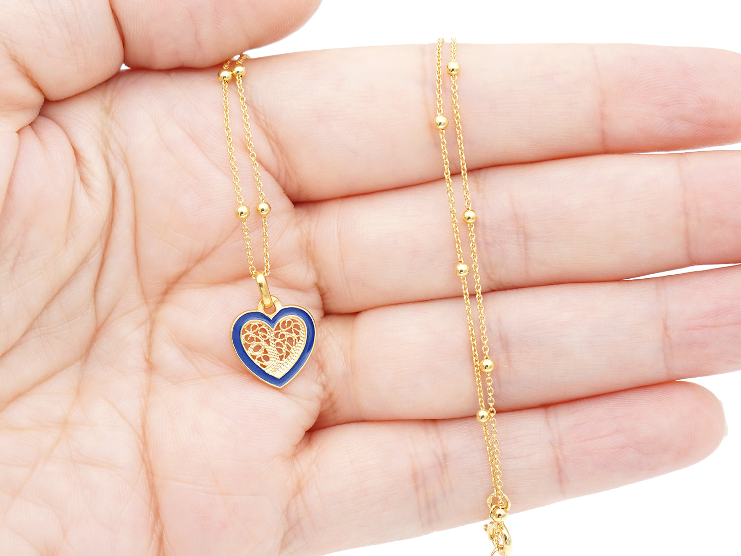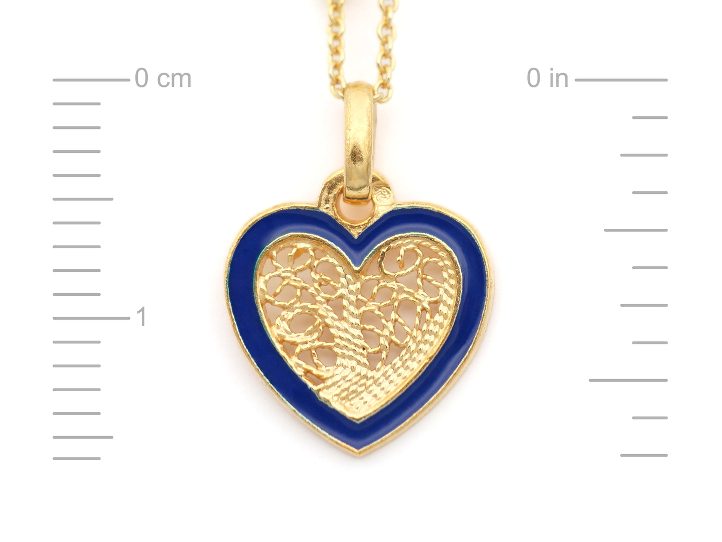 Necklace Small Heart with Blue Enamel, Portuguese Filigree, Golden 925 Sterling Silver