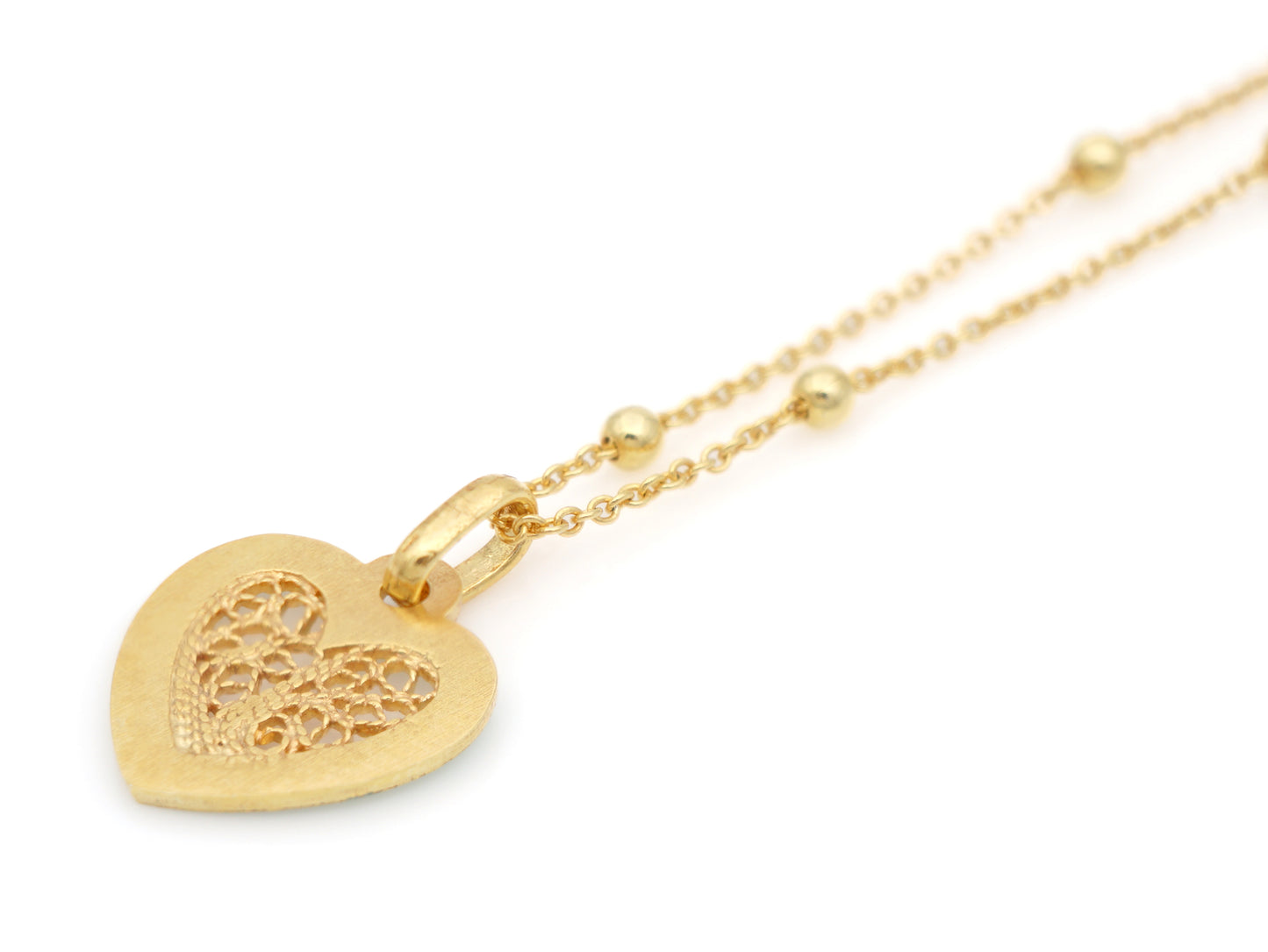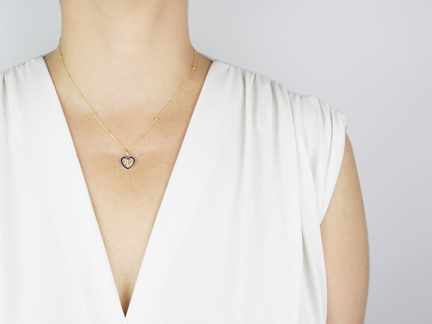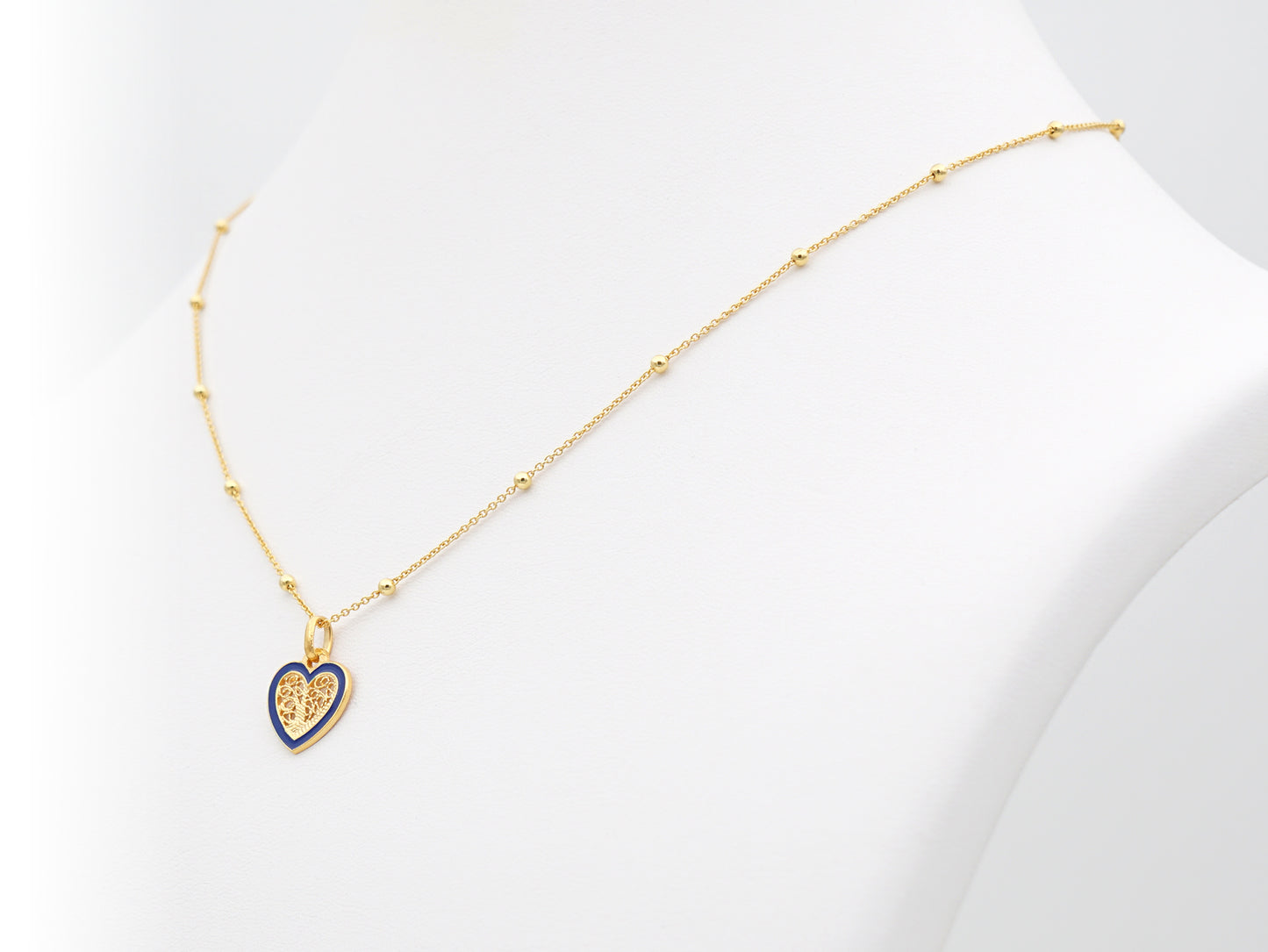 Elegant adjustable Spheres Necklace, with Small Heart Pendant with Blue Enamel. Portuguese Filigree, crafted in Portugal in Golden 925 Sterling Silver.