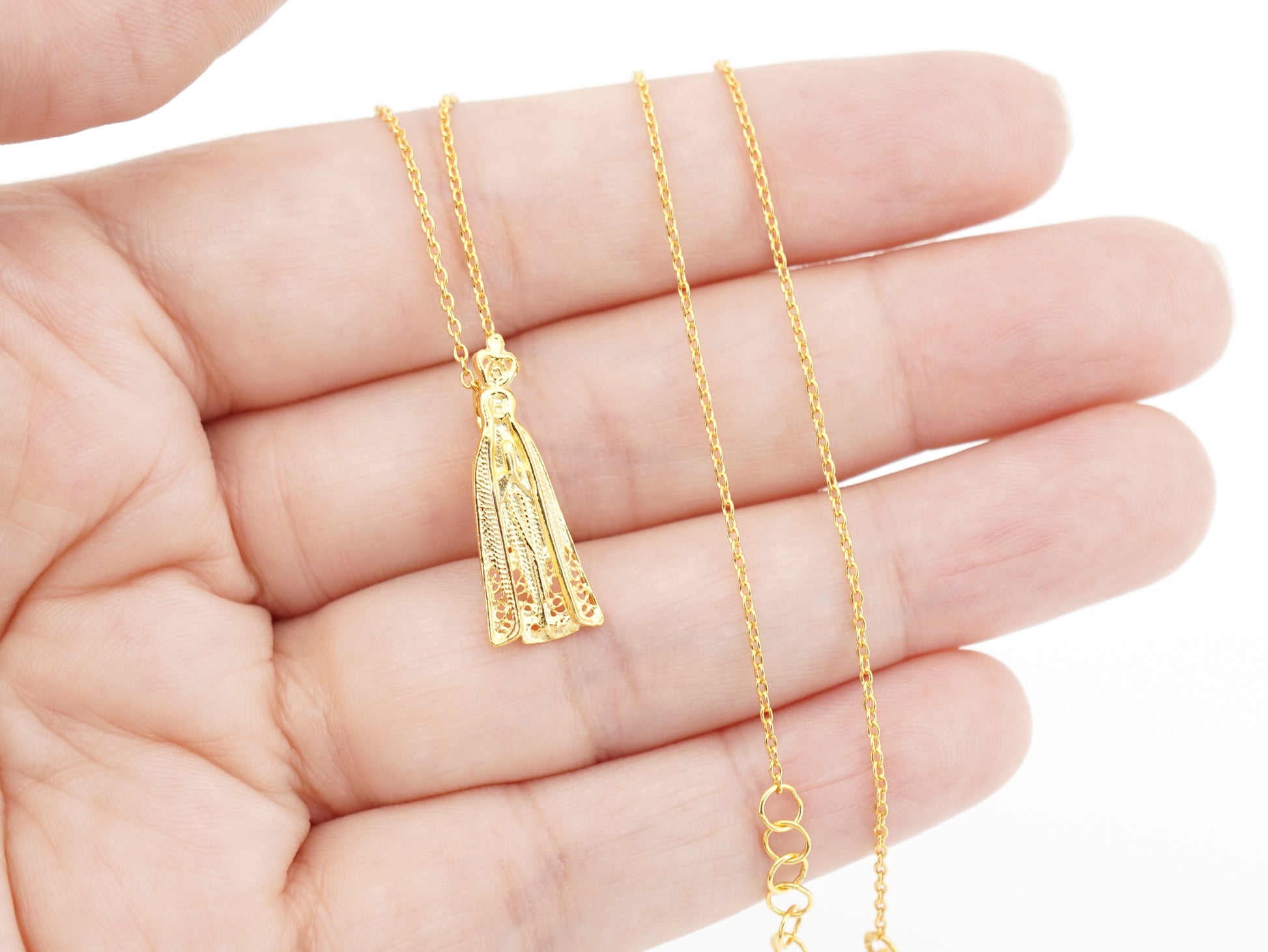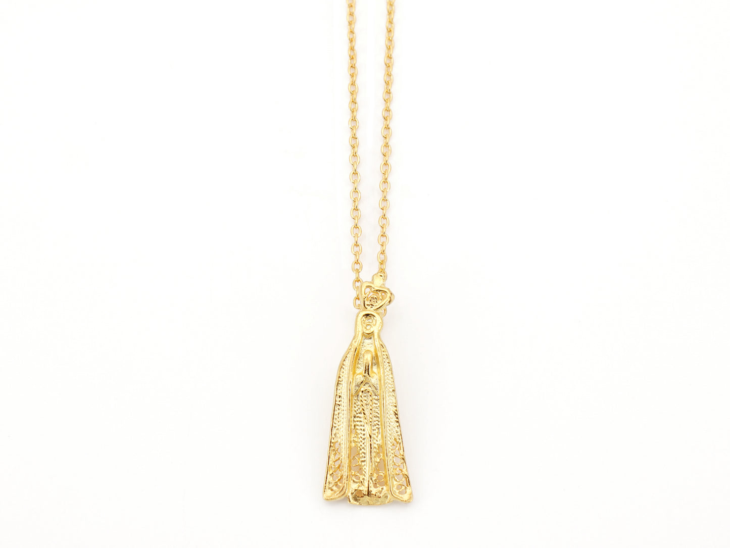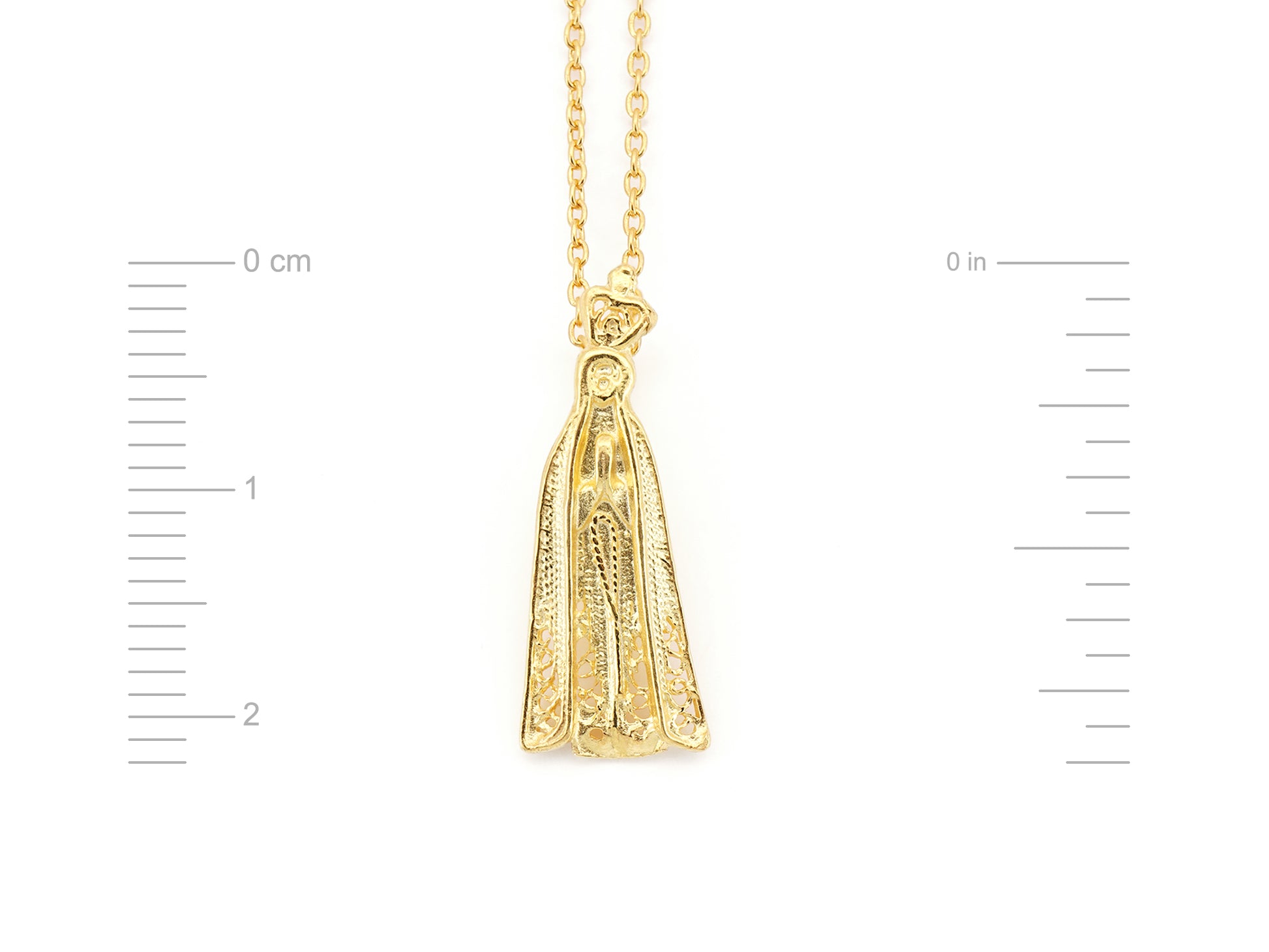 Necklace with Extra Small Our Lady of Fatima Pendant, Portuguese Filigree, Golden 925 Sterling Silver