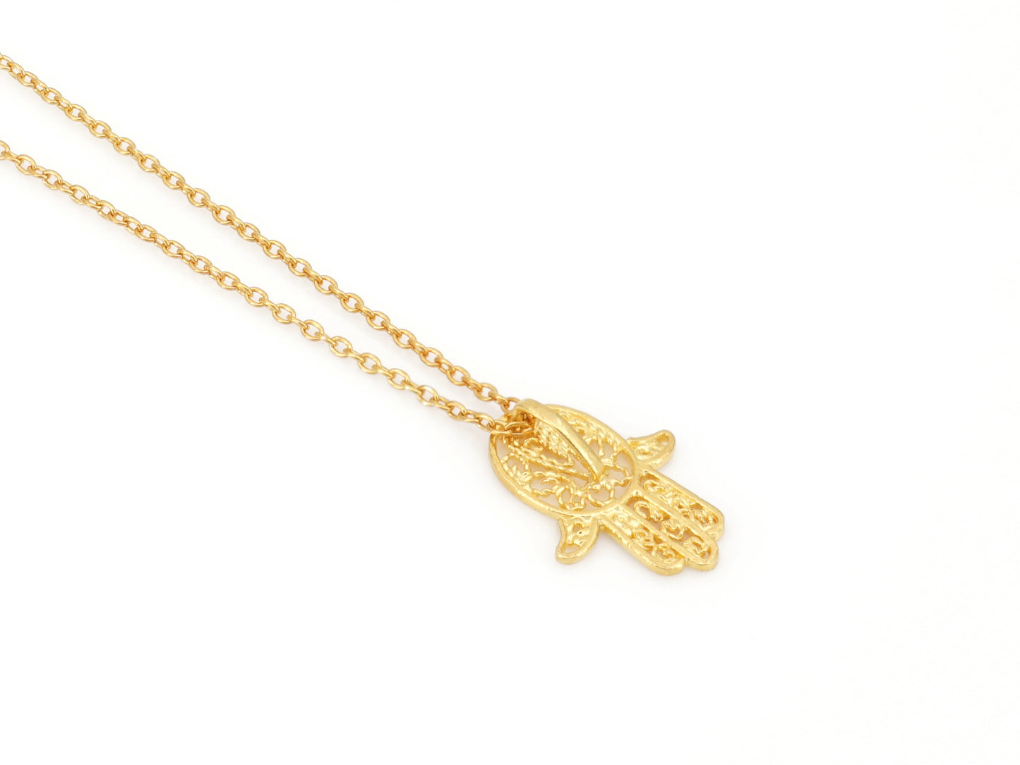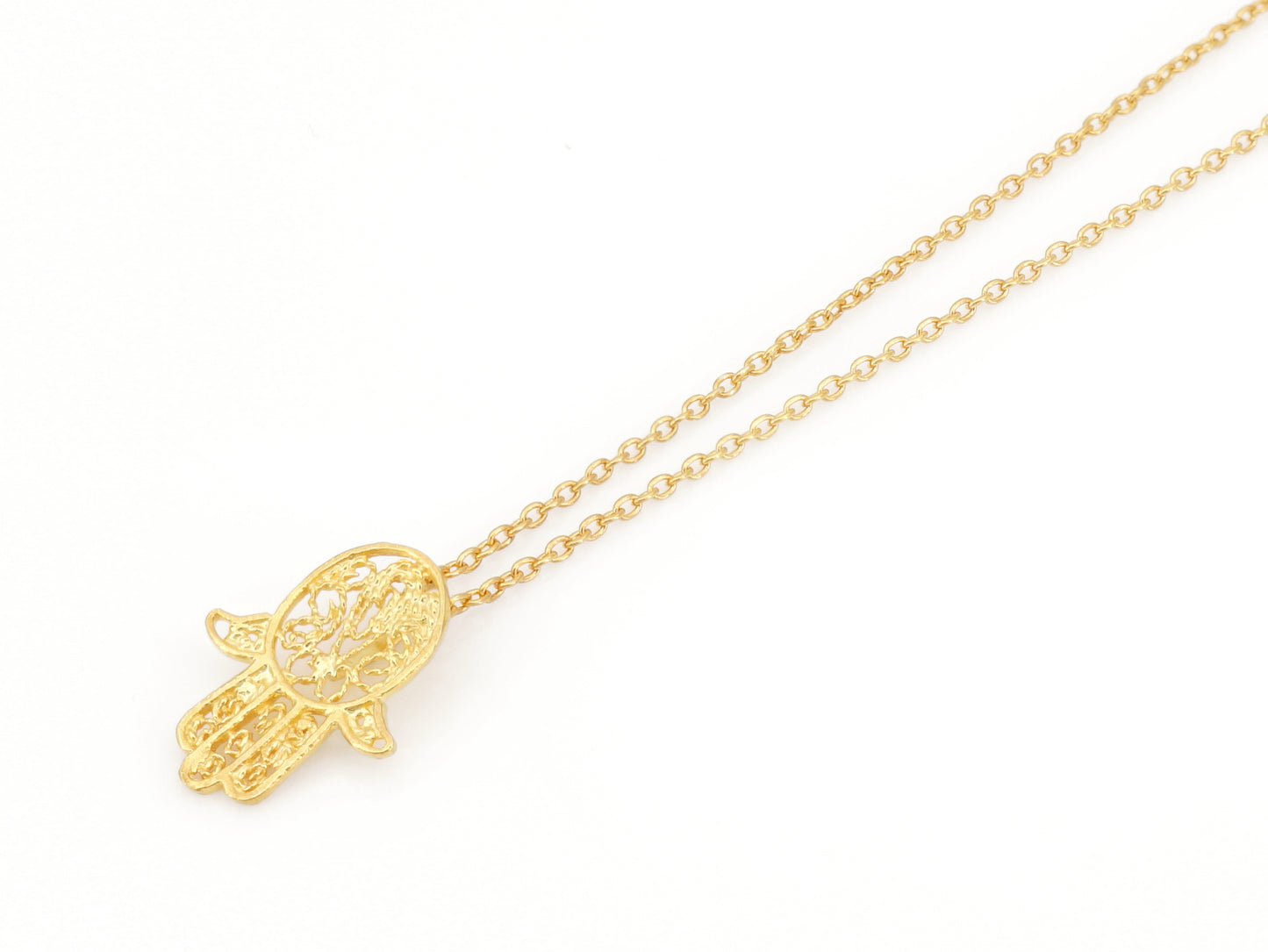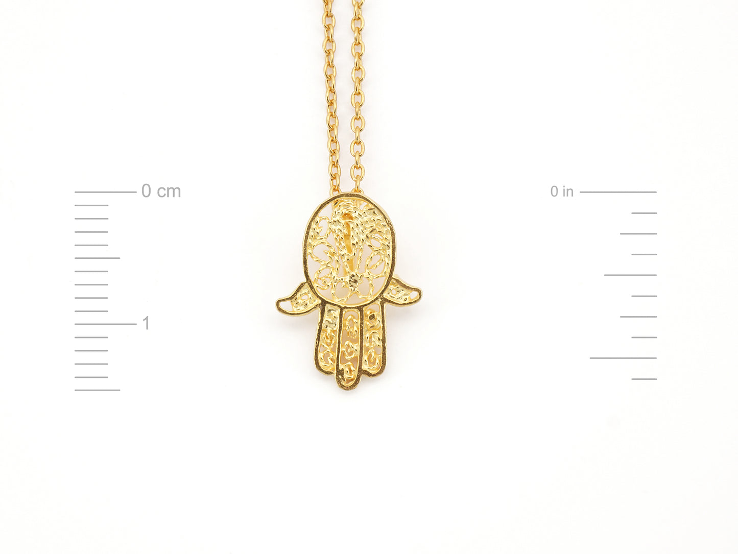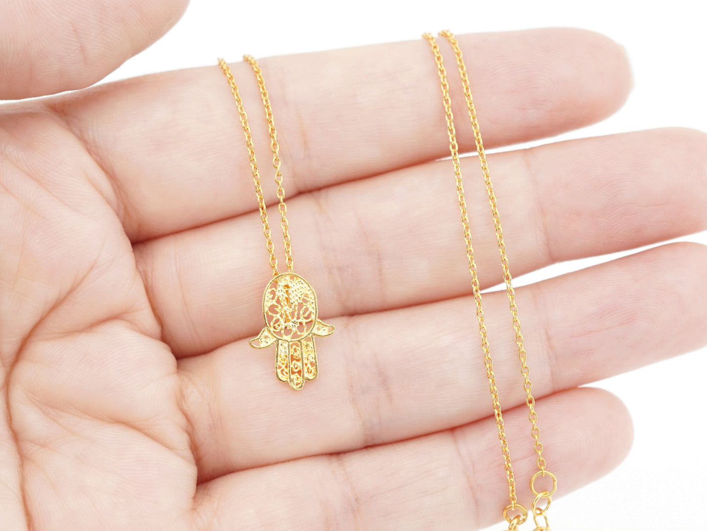 Necklace with Extra Small Fatima's Hand Pendant, Portuguese Filigree, Golden 925 Sterling Silver