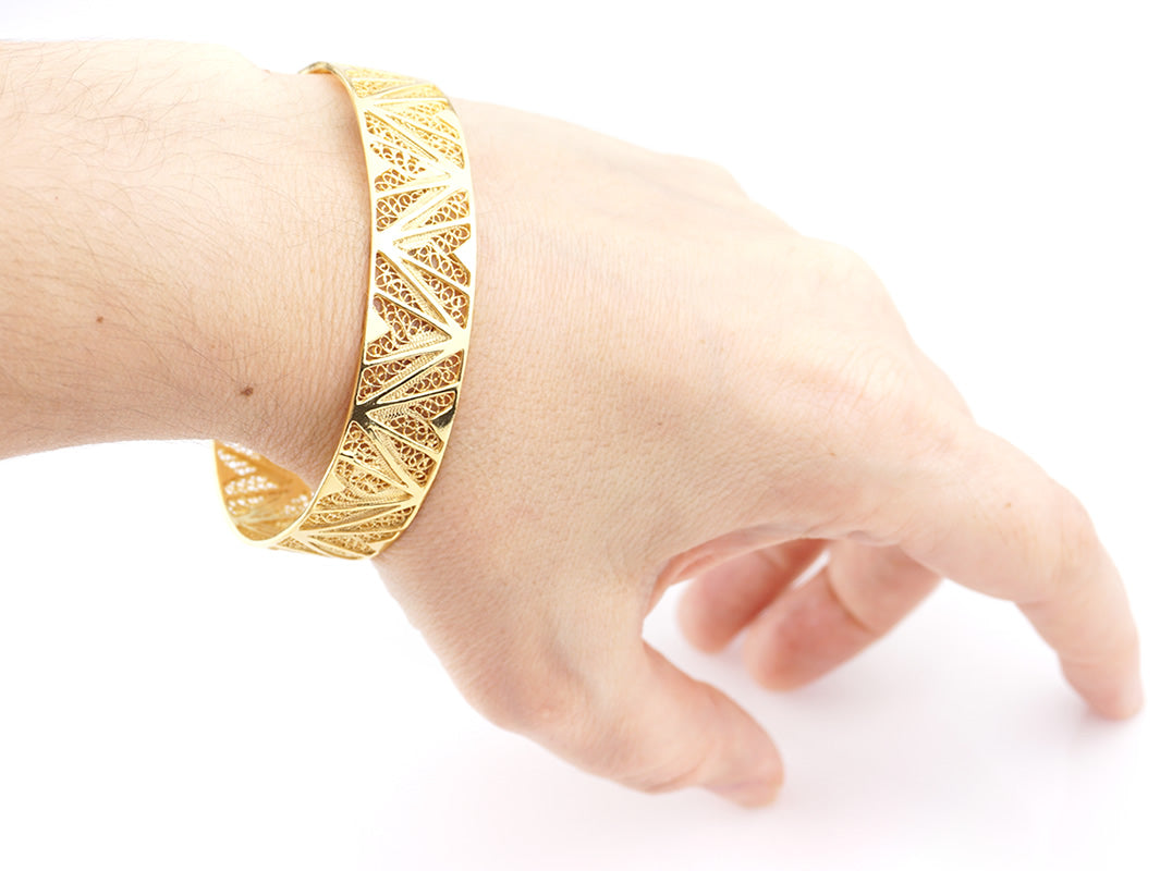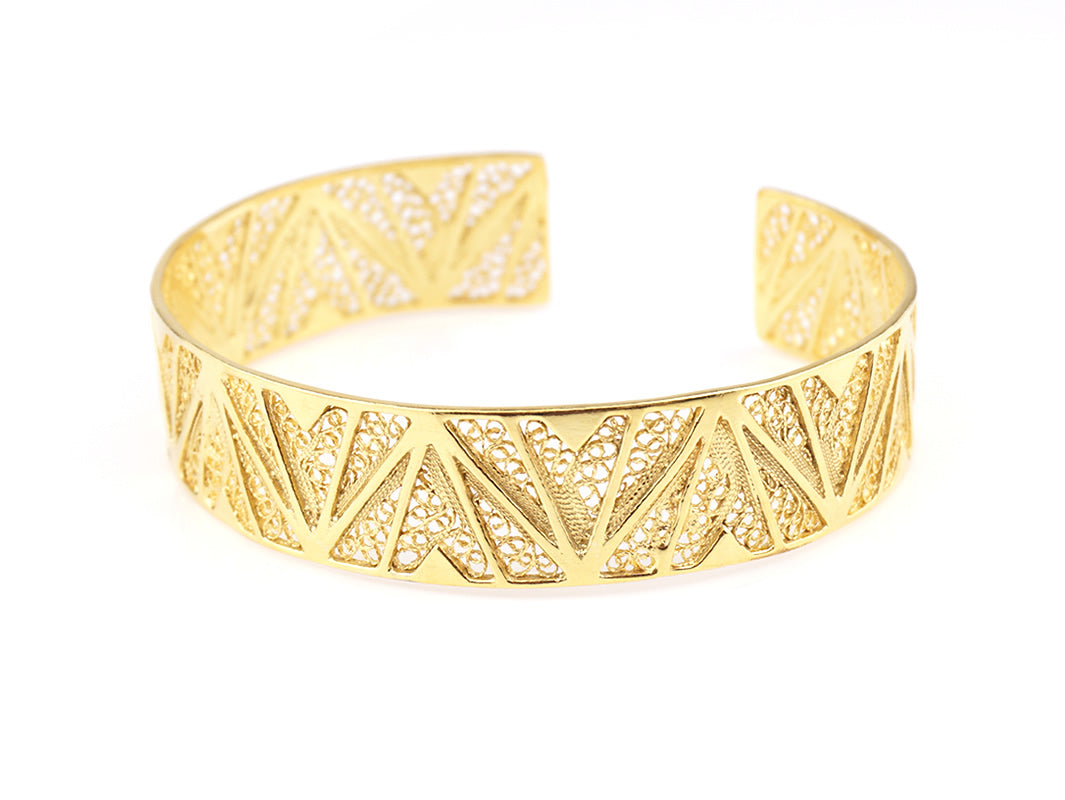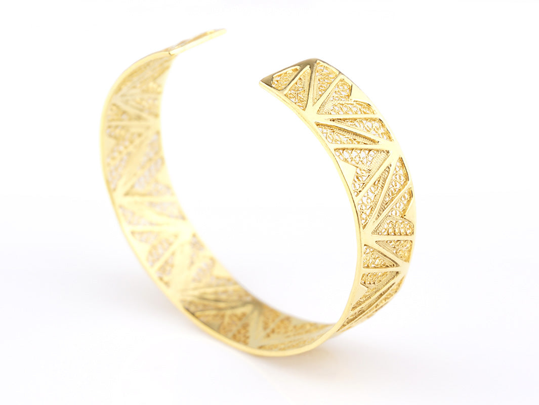 Elegant Cuff Bracelet with geometric inspiration. Portuguese Filigree, crafted in Portugal in Golden 925 Sterling Silver.