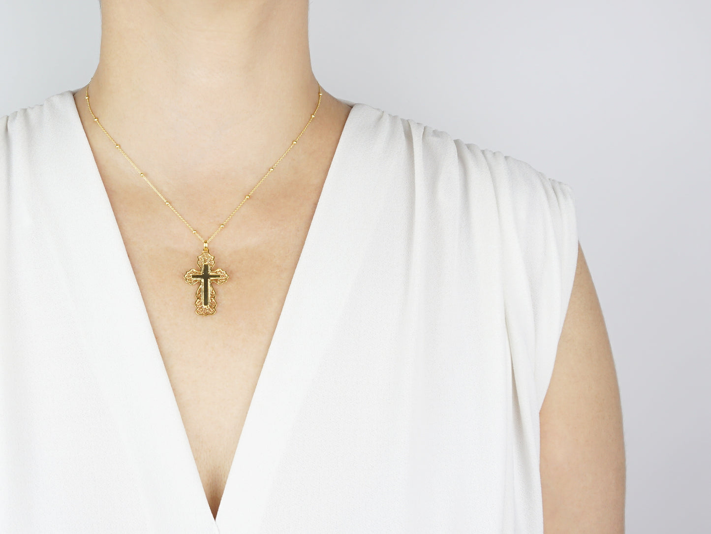 Elegant spheres necklace with Cross Pendant with Mirrored center, with short adjustable chain. Portuguese Filigree, crafted in Portugal in Golden 925 Sterling Silver.