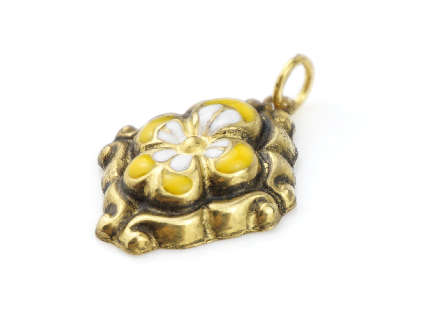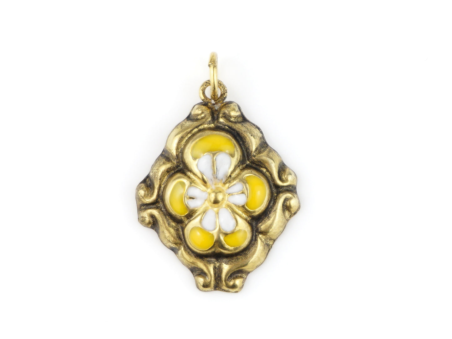 Elegant Baroque Pendant with Yellow and White Flower motif, hollow single-sided, handcrafted in Portugal by talented artisans, in Golden 925 Sterling Silver with "Patina" and Enamel finishing.