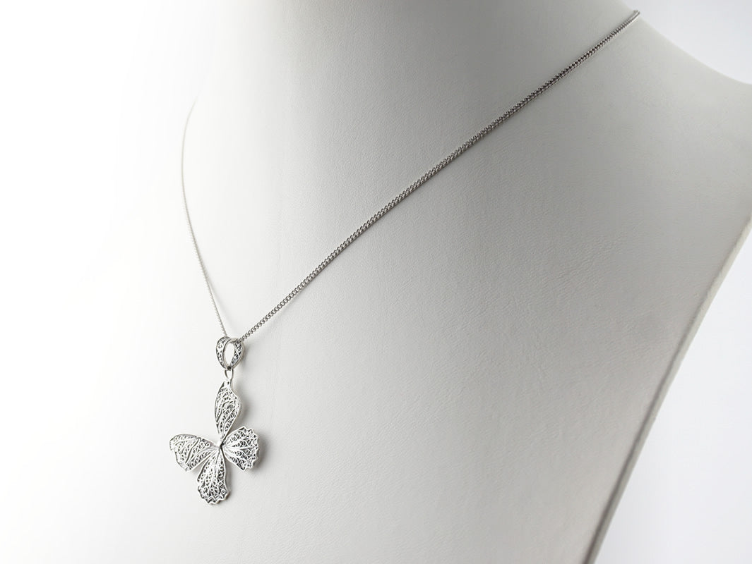 Elegant Necklace with Tilted Butterfly Pendant, adjustable chain. Portuguese Filigree, crafted in Portugal in 925 Sterling Silver.