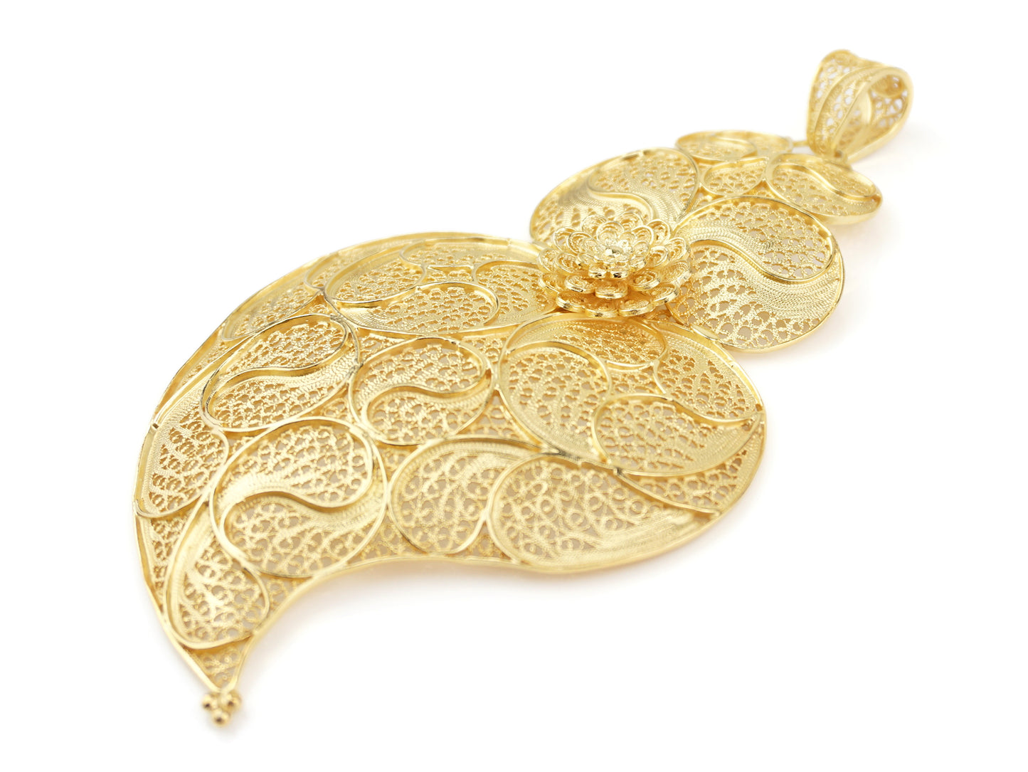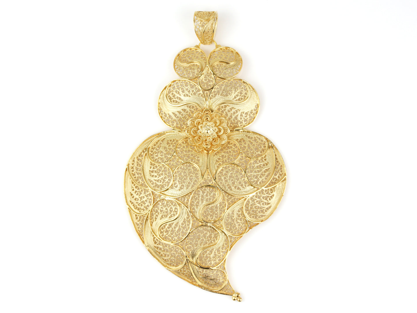 Elegant Extra Large Traditional Heart Pendant. Portuguese Filigree, crafted in Portugal in Golden 925 Sterling Silver.